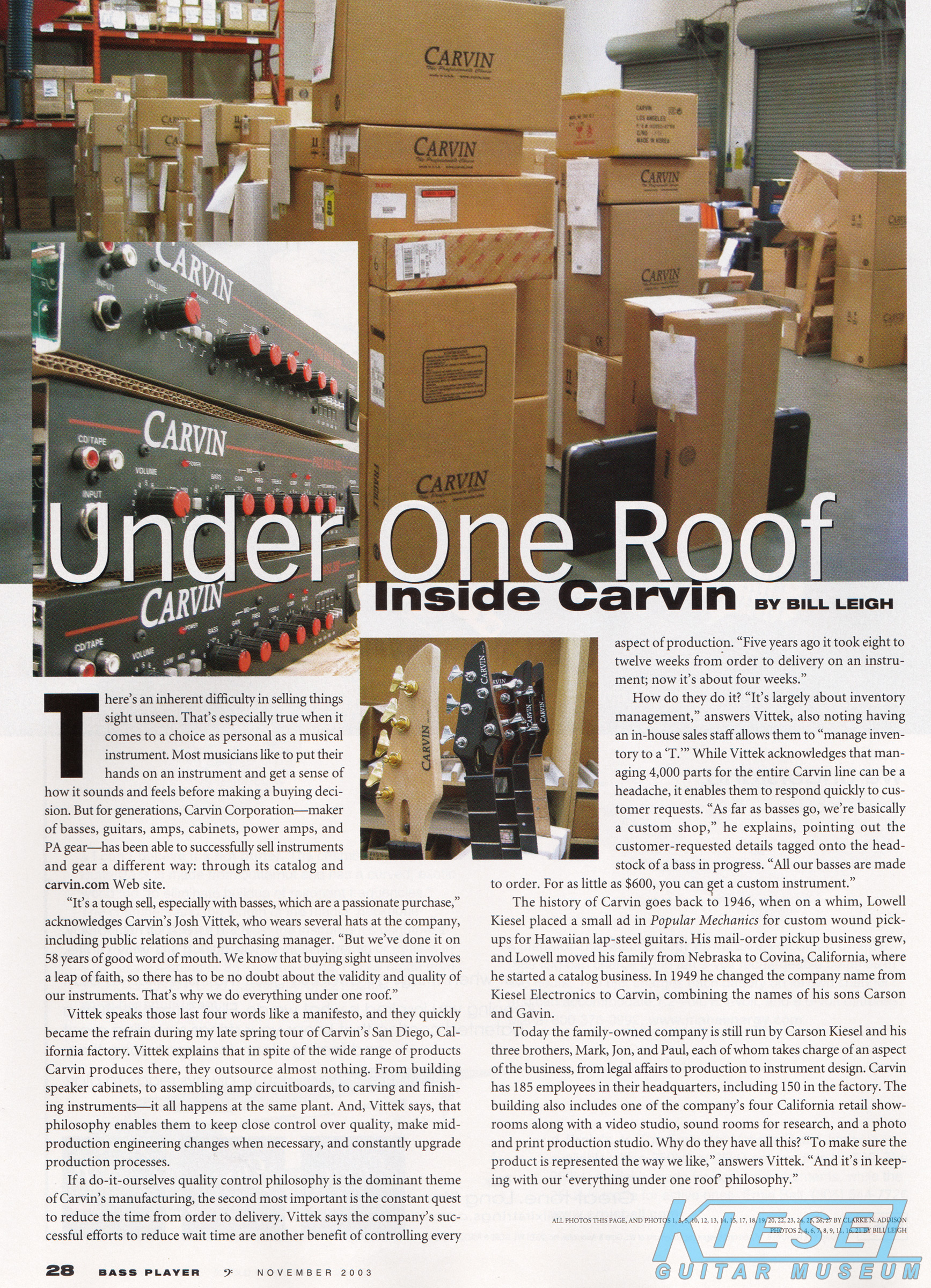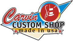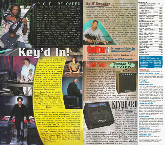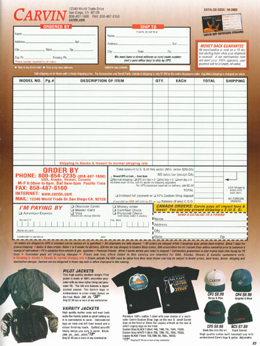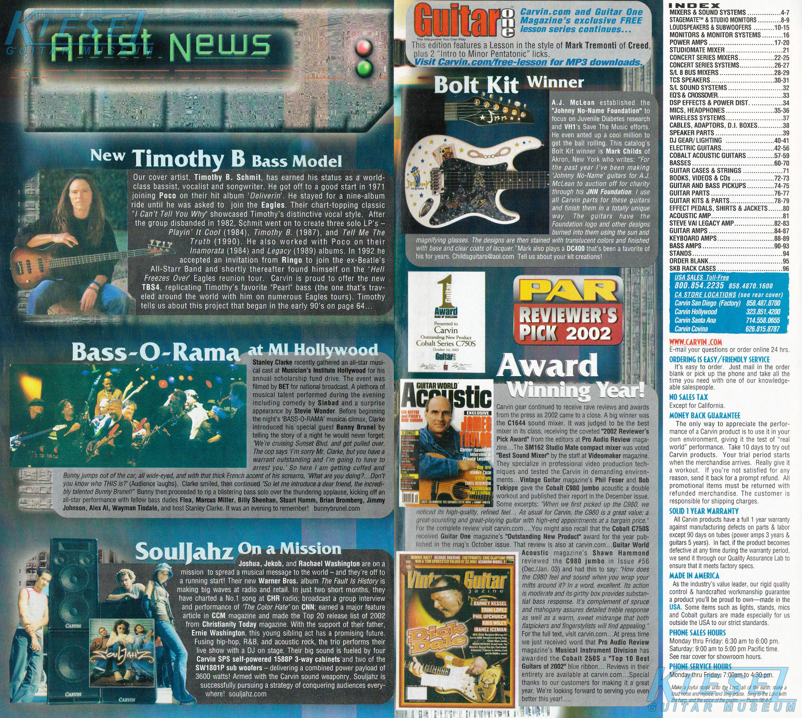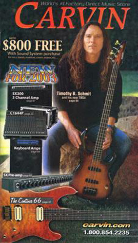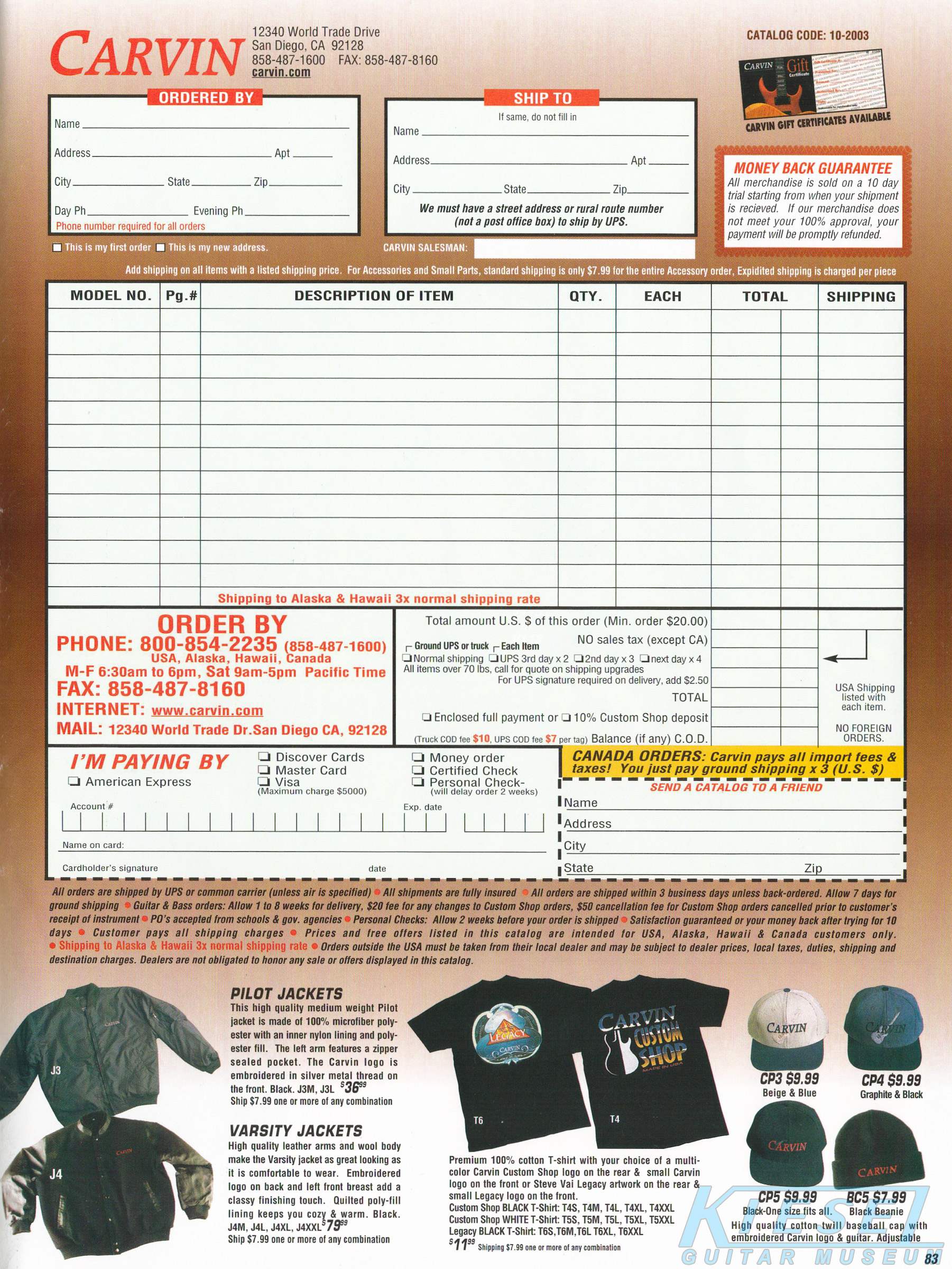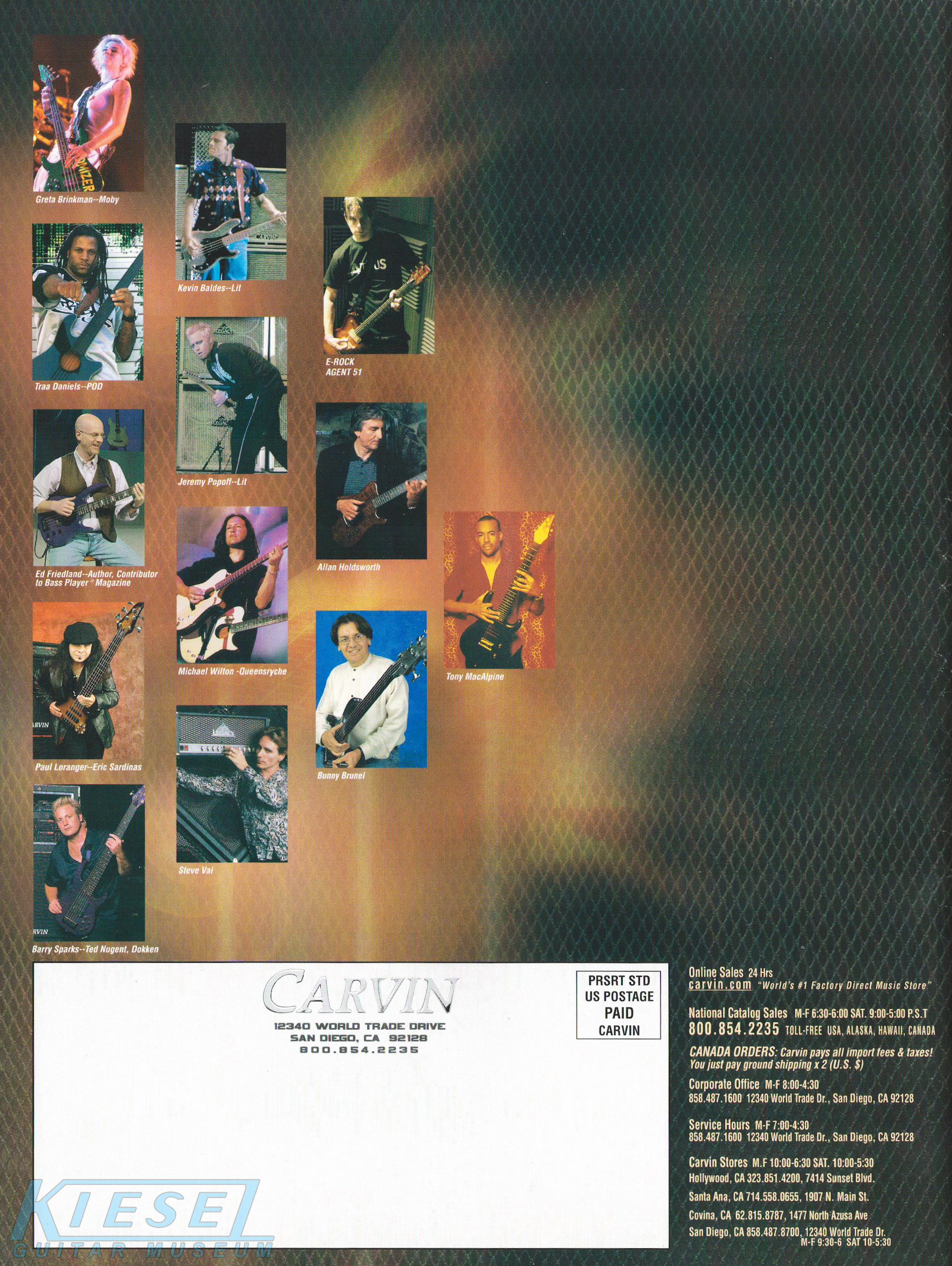There was a significant change to the marketing in mid-2003. Since the inception of the smaller, quarterly catalogs, guitars and basses had been shown on relatively neutral backgrounds, primarily using earth tones or plain white. In mid-2003, this changed to a flashy computer generated black background, giving a high-tech, modern appearance to Carvin's guitars and basses. This would appear in one catalog only, and would lead up to the return of the large-format 8 1/2" X 11" catalog in 2004. In conjunction with the new catalog layout, the Carvin.com website also featured new guitar pictures on a similar computer-generated black background (shown throughout below). For the first time, the catalog and website layouts matched and complimented each other, and gave a fresh, new appearance to both. Carvin discontinued showing photographs of In-Stock instruments on their website in mid-2003, however, the In-Stock images were re-added after several months in response to customer's requests.