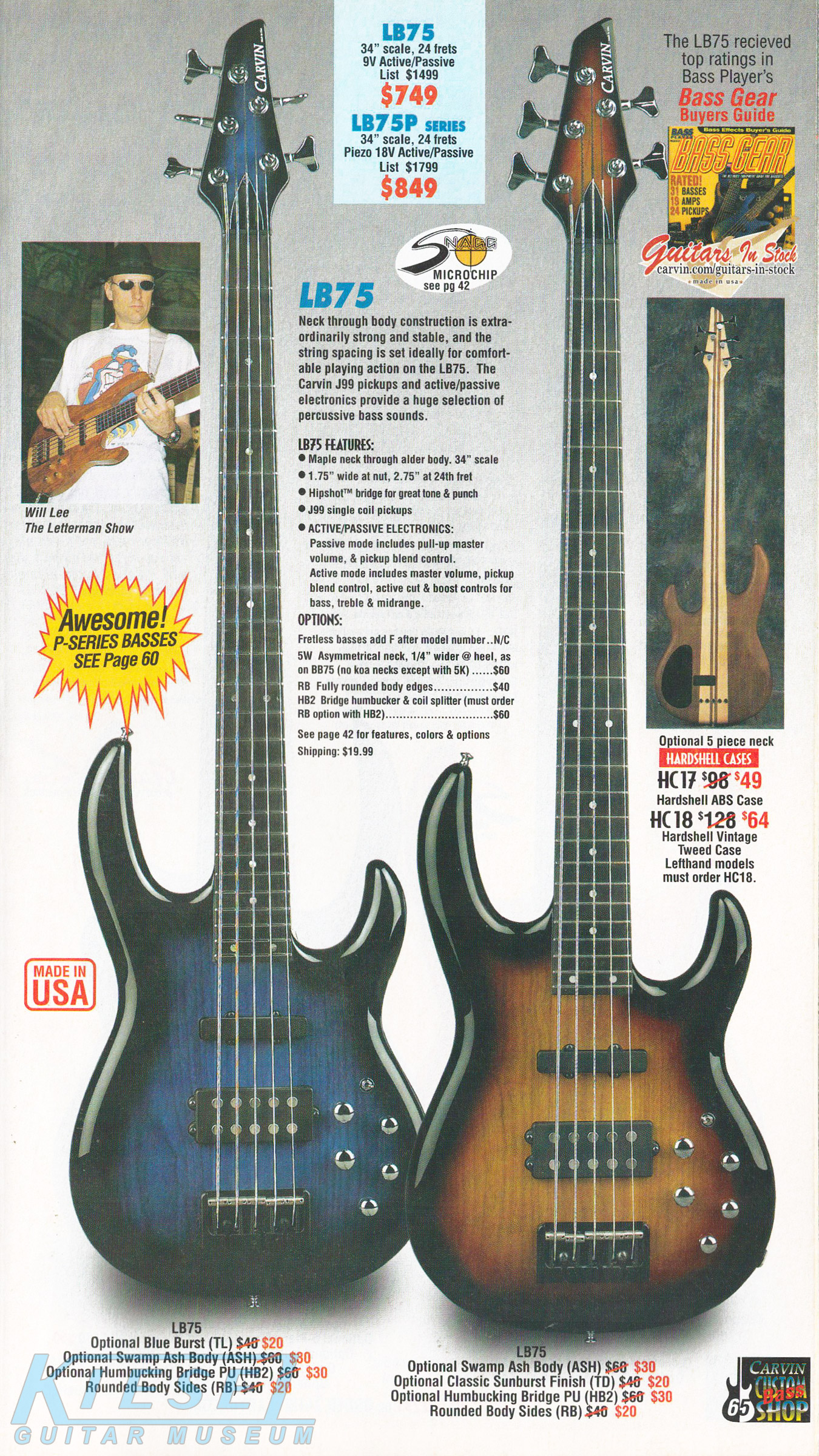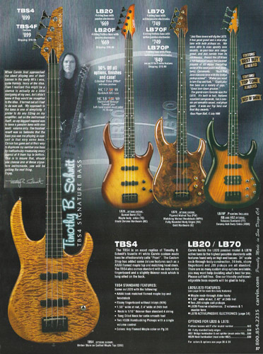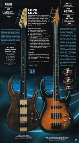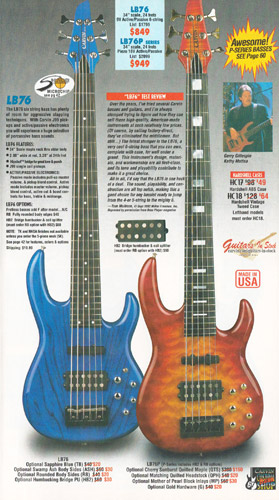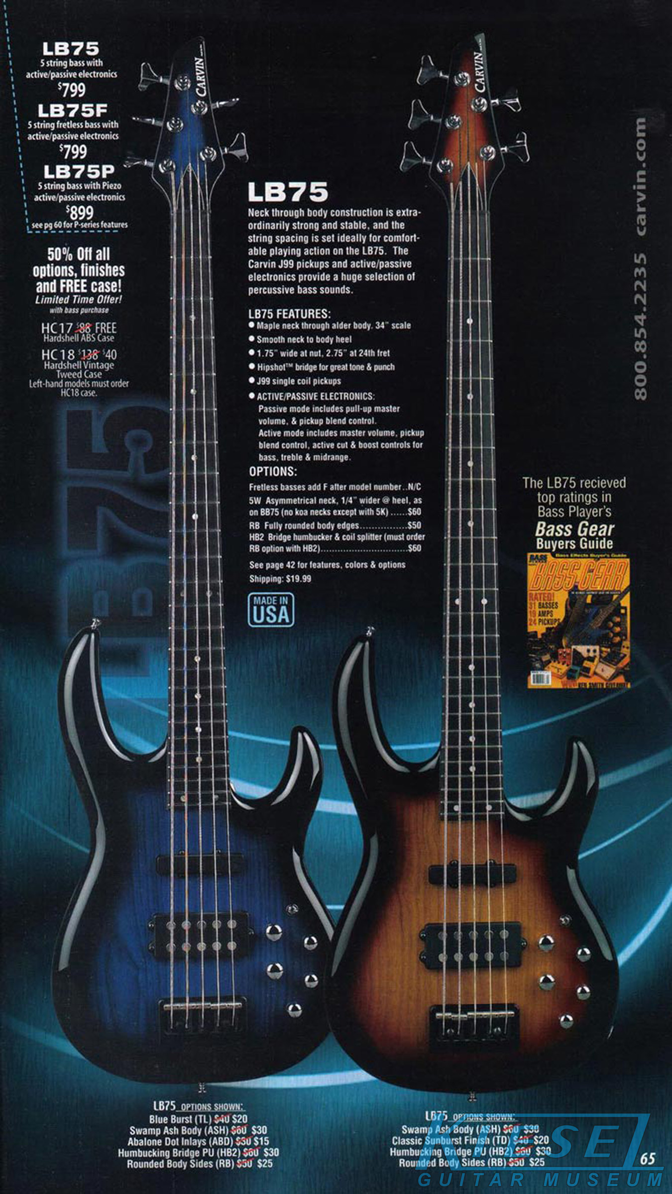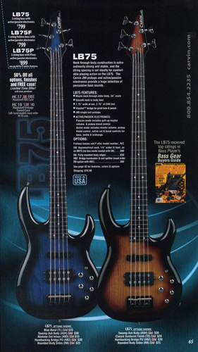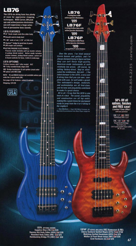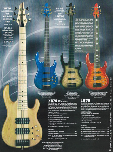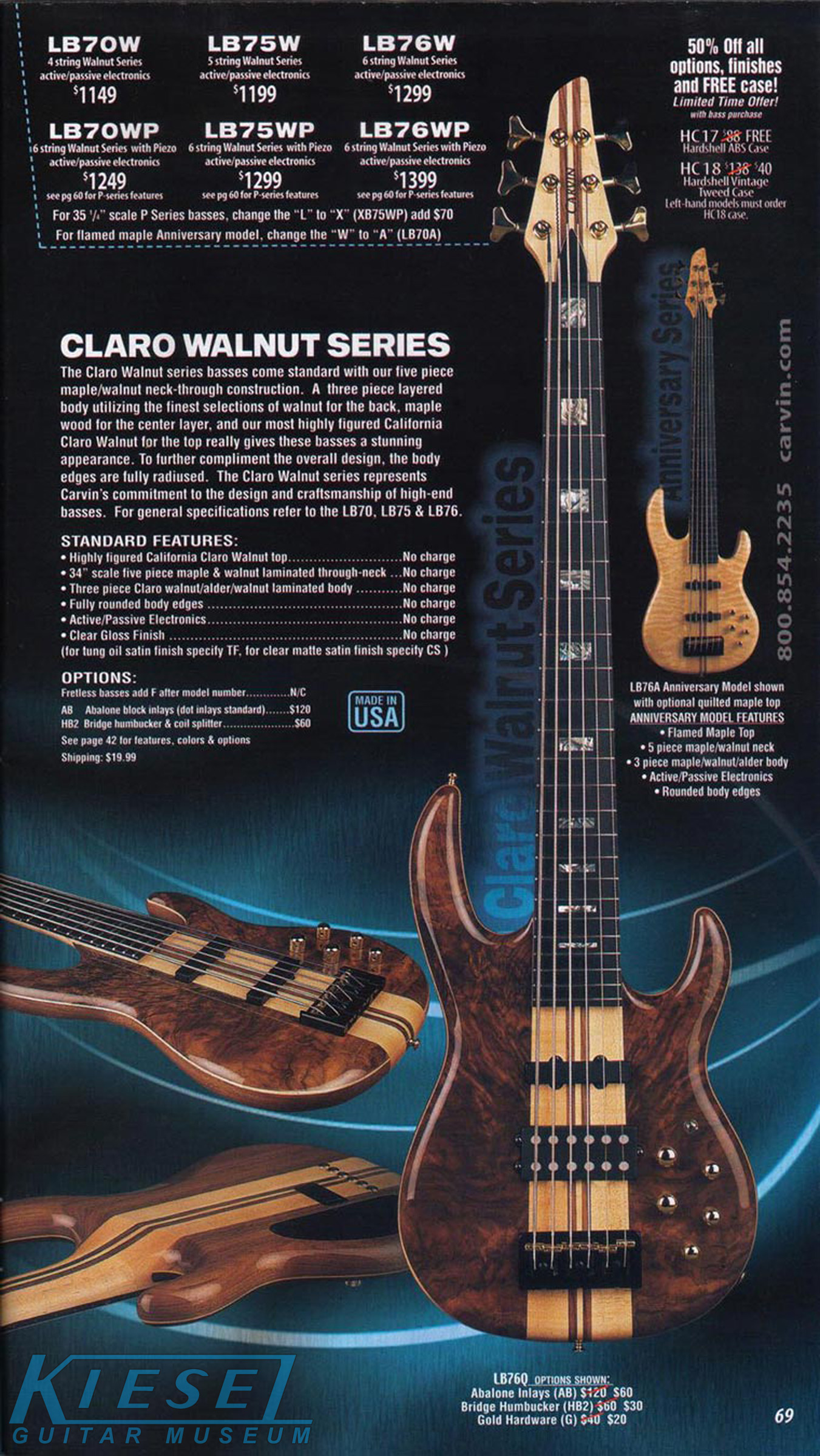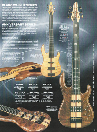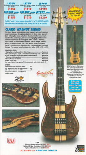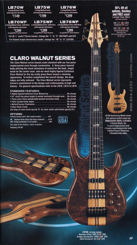 Carvin's LB70, LB75 and LB76 continued to be available in the Claro Walnut Series (W Series), and had no changes from 2002. The catalog inset showed