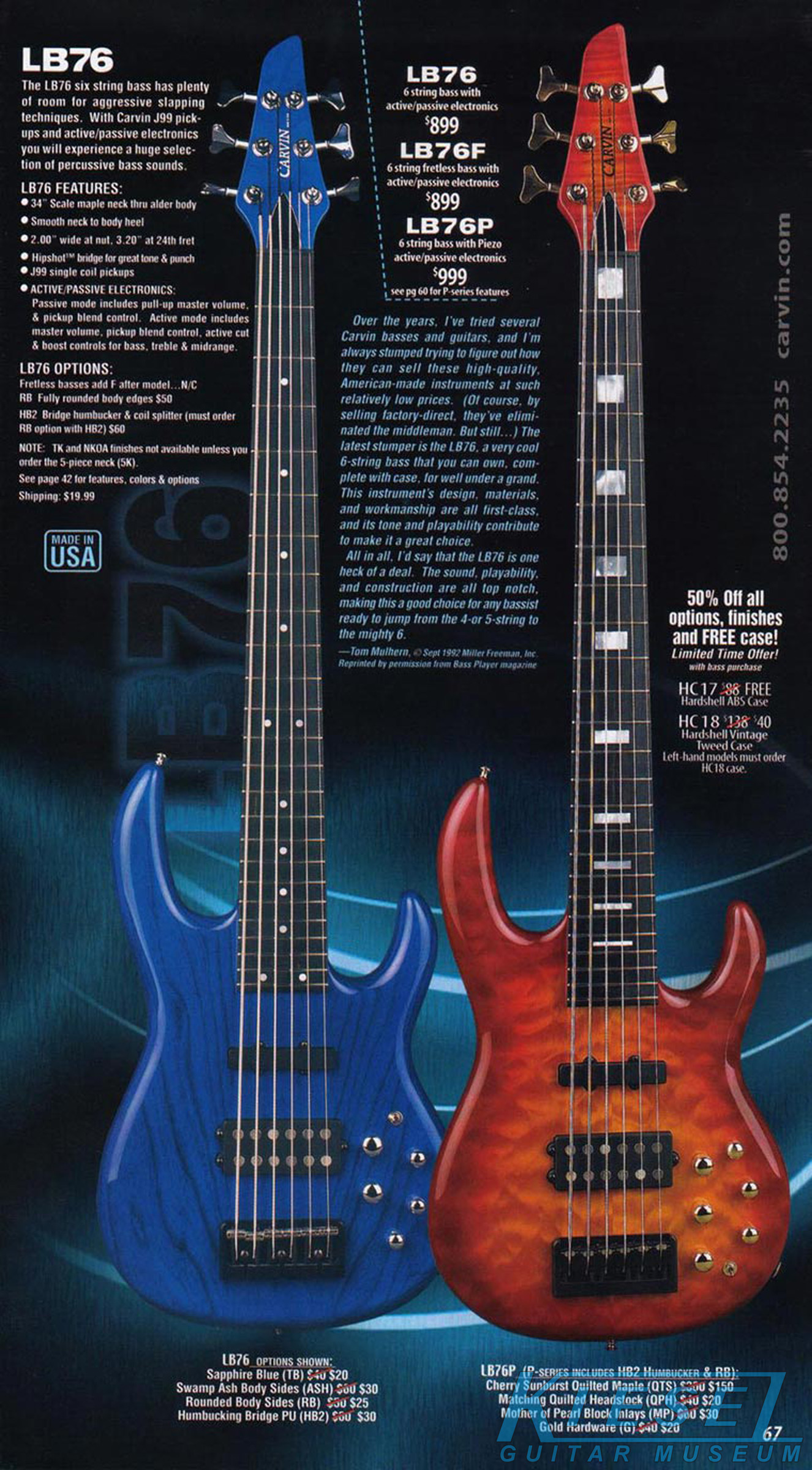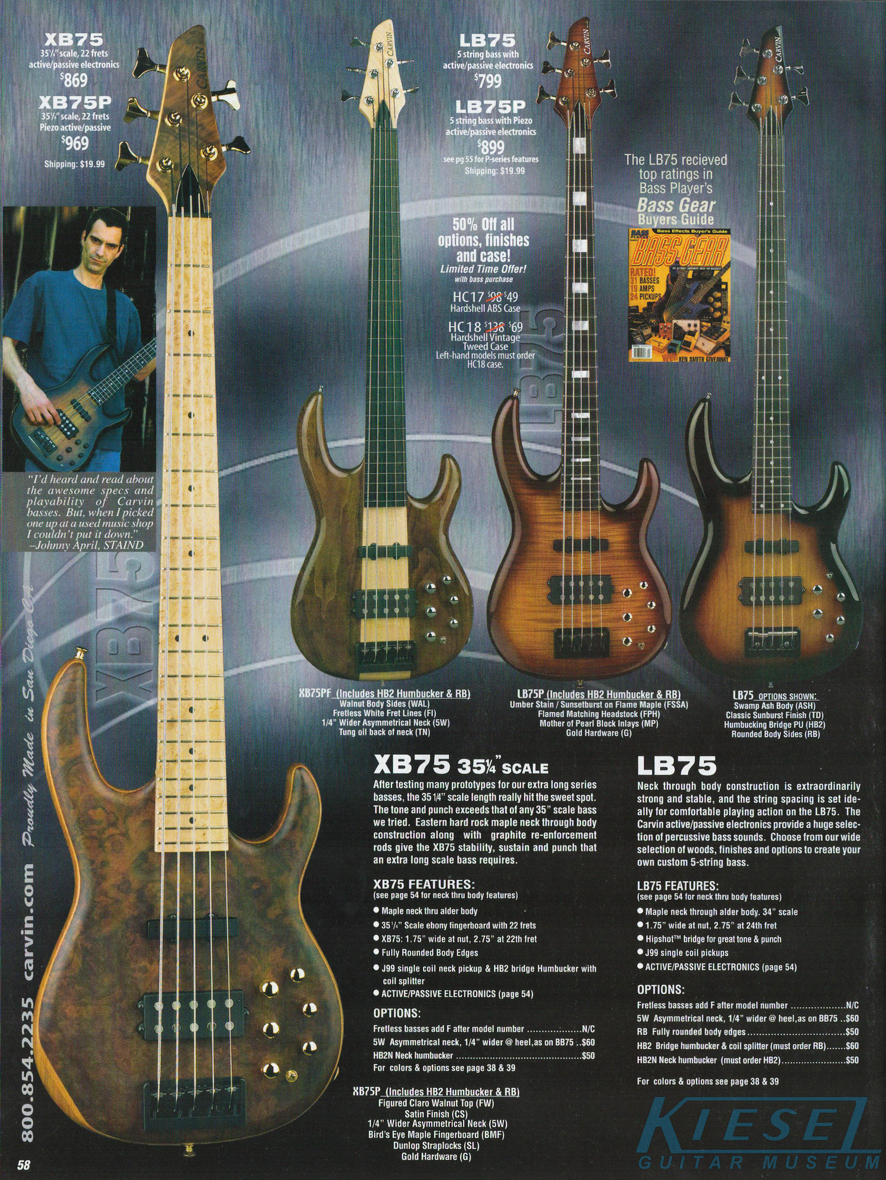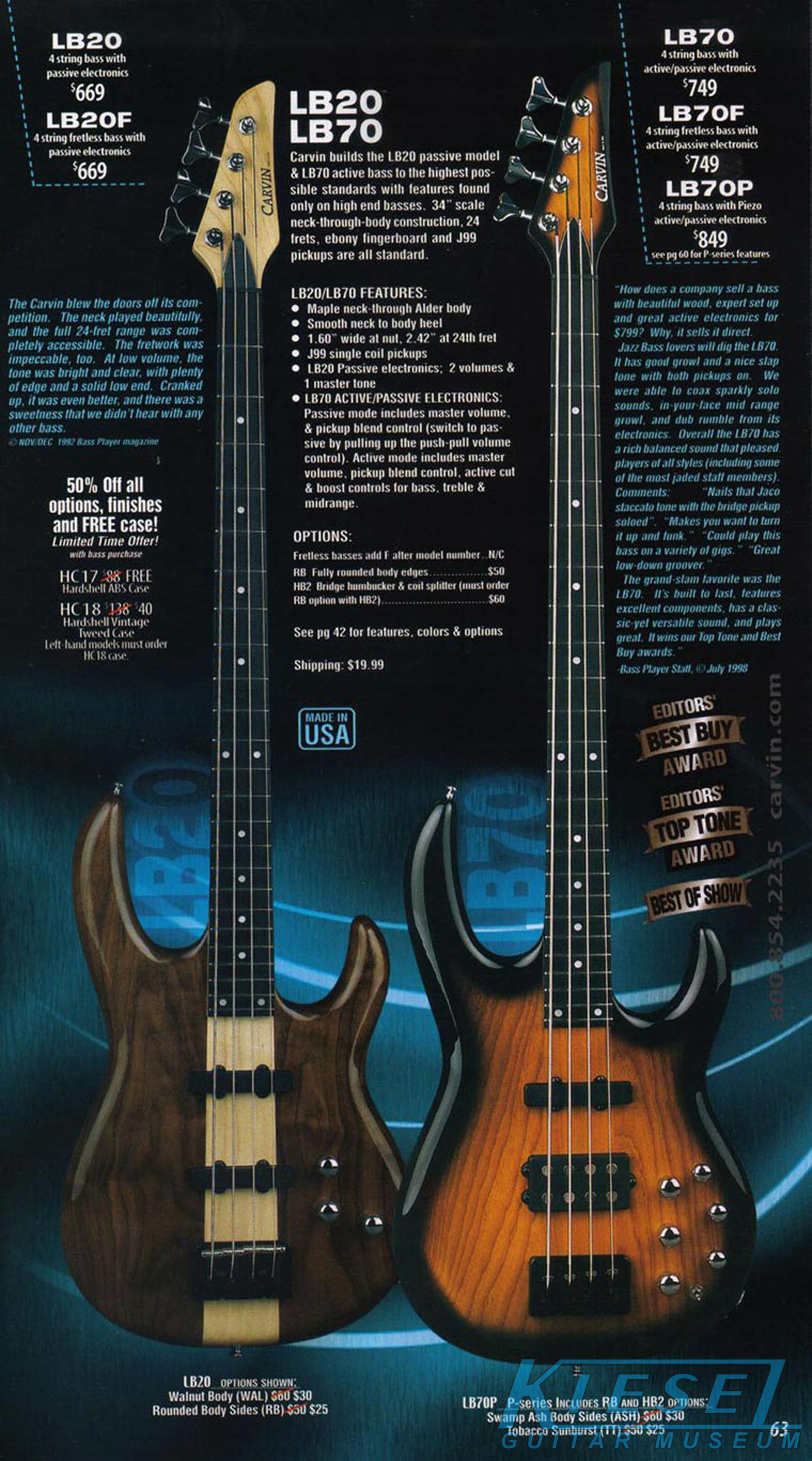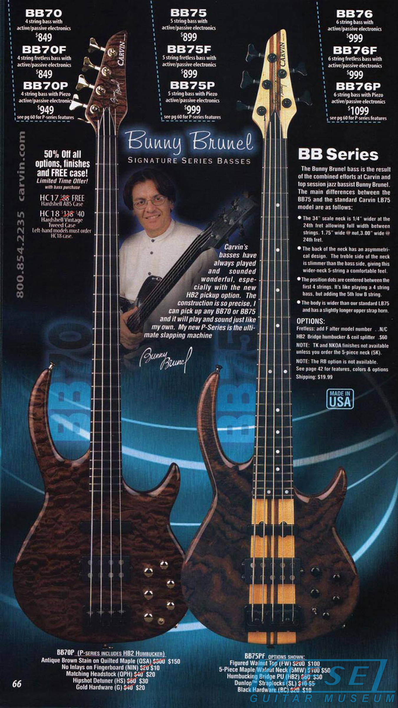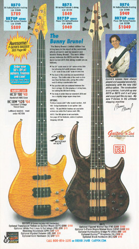 Carvin's LB70, LB75 and LB76 continued to be available in the Claro Walnut Series (W Series), and had no changes from 2002. The catalog inset showed