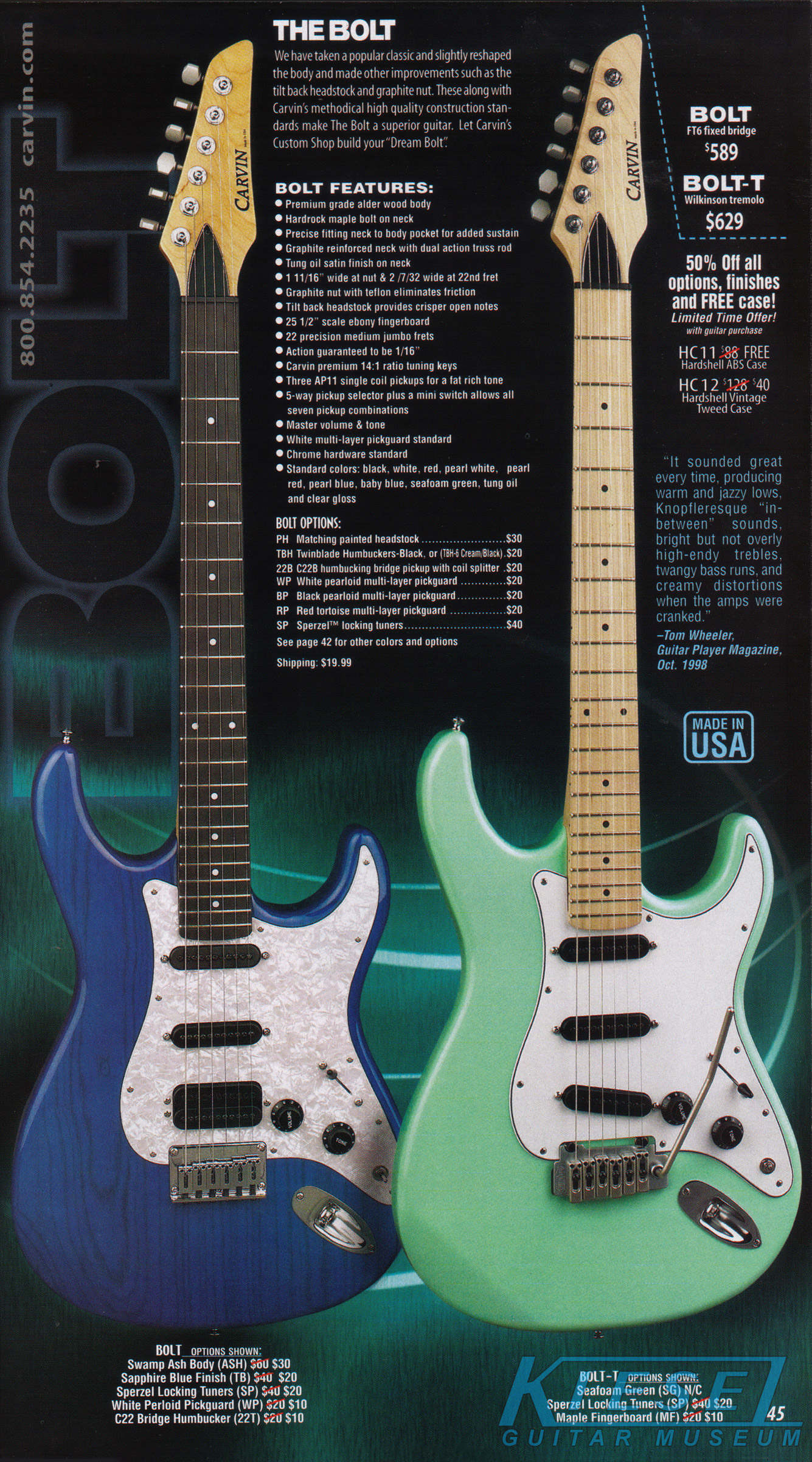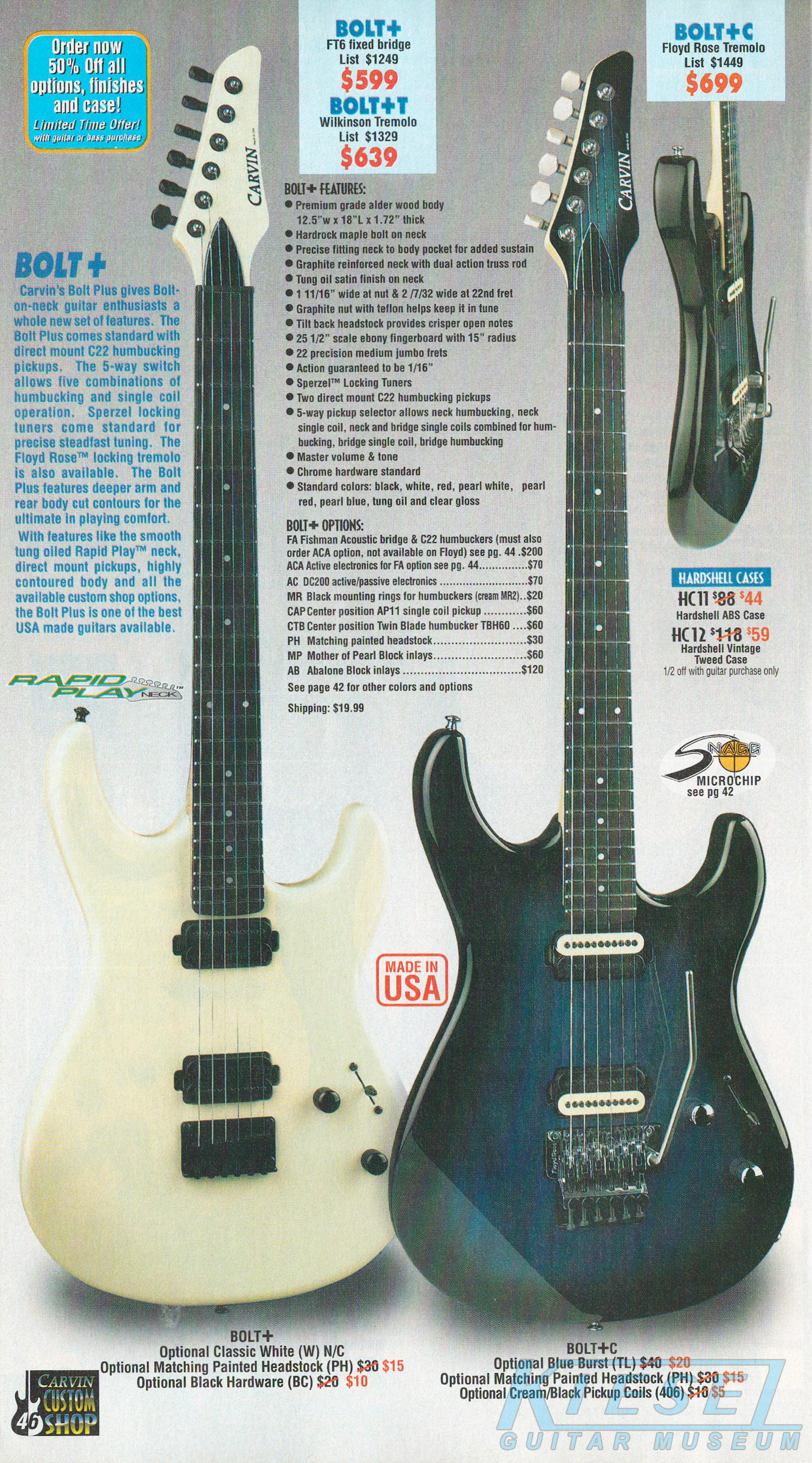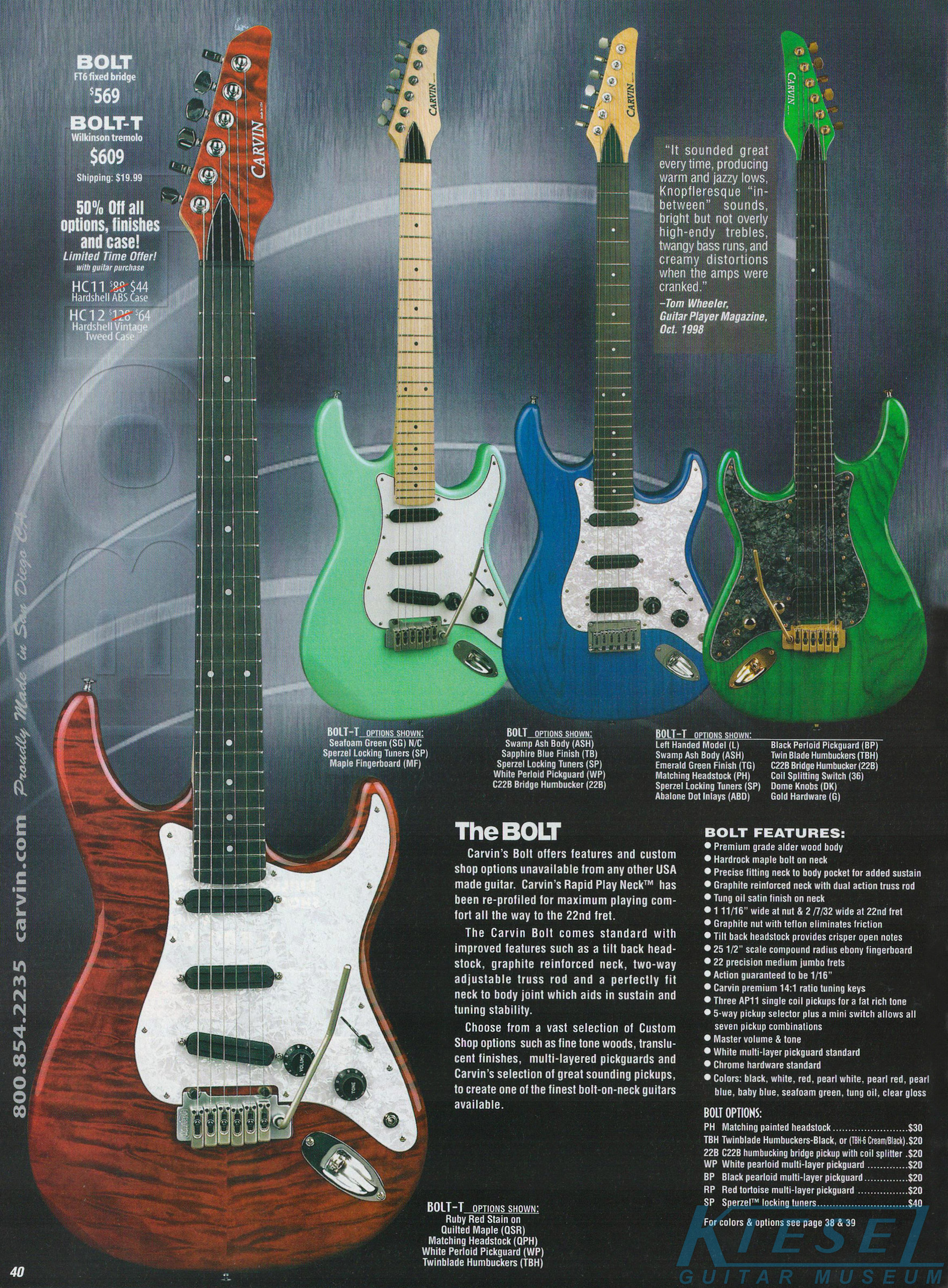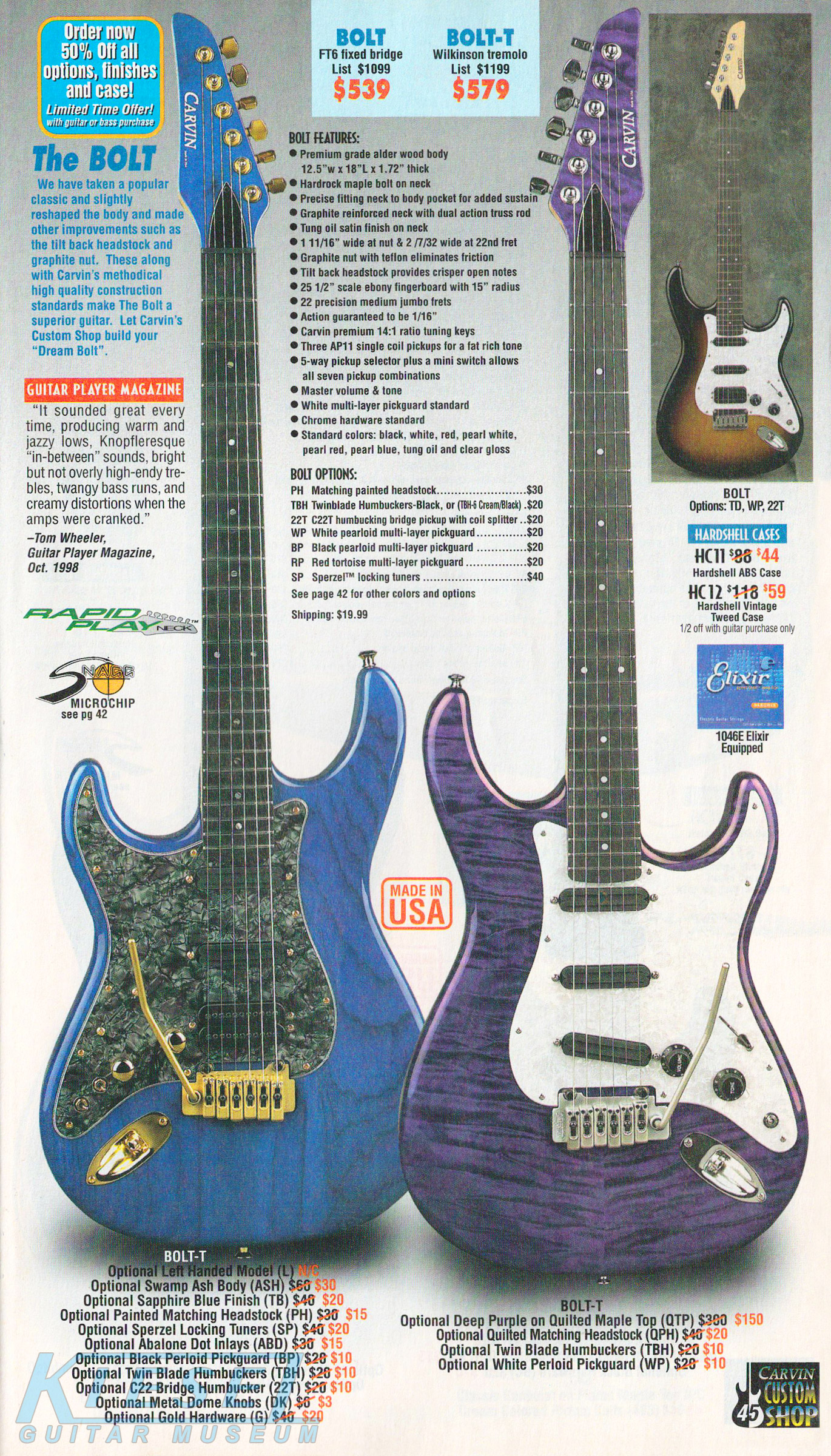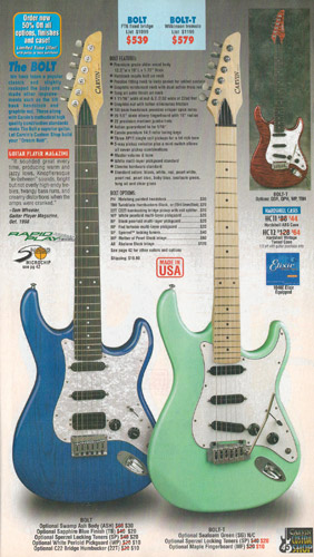 $629. The catalog photo showed a Bolt in Sapphire Blue on swamp ash with Sperzel locking tuners, white pearloid pickguard and C22 bridge humbucker.