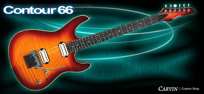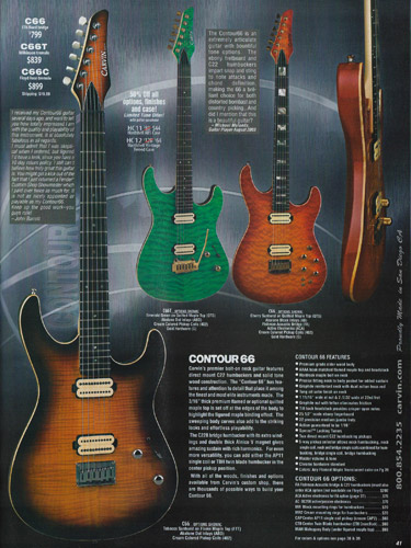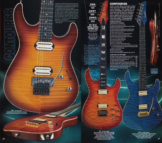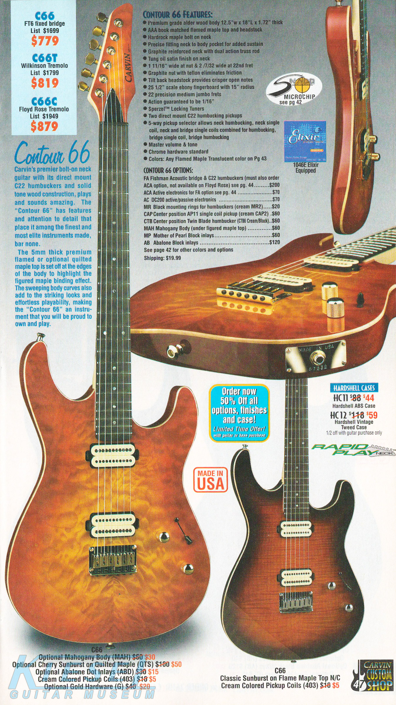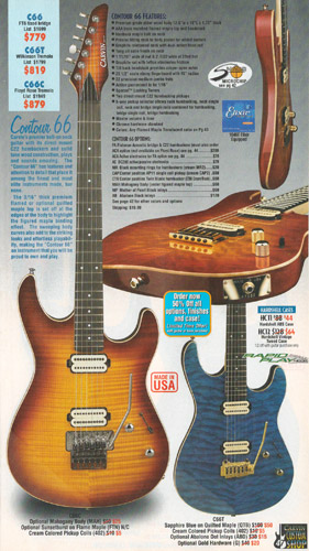 The Summer catalog showed a close up of a C66C in Sunsetburst on flame with a Floyd Rose tremolo; and a C66 in Cherry Sunburst on quilt with matching