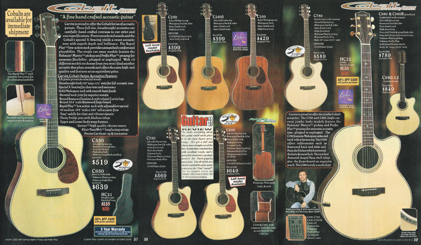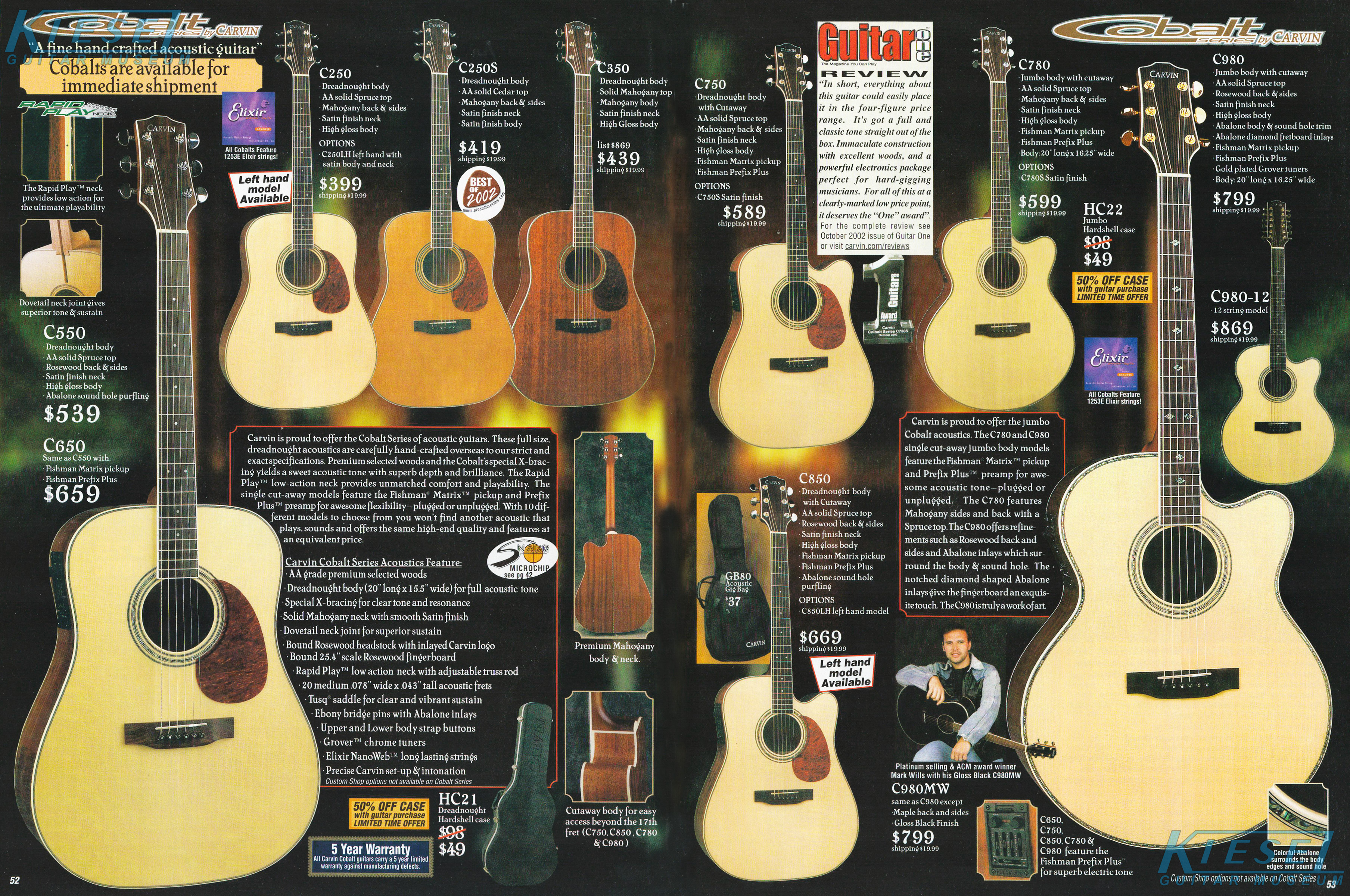 The Cobalt acoustic guitars were unchanged from 2002, with the exception of the addition of a 12-string model, the C980-12, and the introduction of teh Mark Wills signature C980MW. This was the same as the C980, but with maple back and sides (versus rosewood) and a gloss black finish.