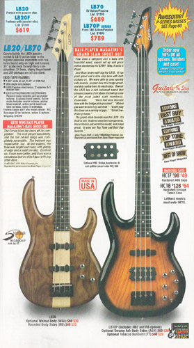 was priced at $849. The July catalog showed the LB20 in walnut with rounded body sides, and the LB70 is a P Series model in Tobacco Sunburst on swamp ash.
