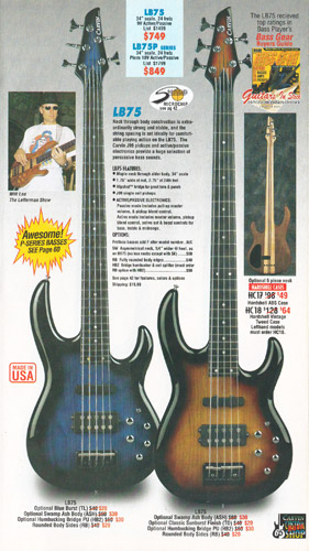 was priced at $899. The January catalog featured an LB75 with Blue Burst finish on swamp ash, with an HB2 and rounded body sides, and an LB75 in