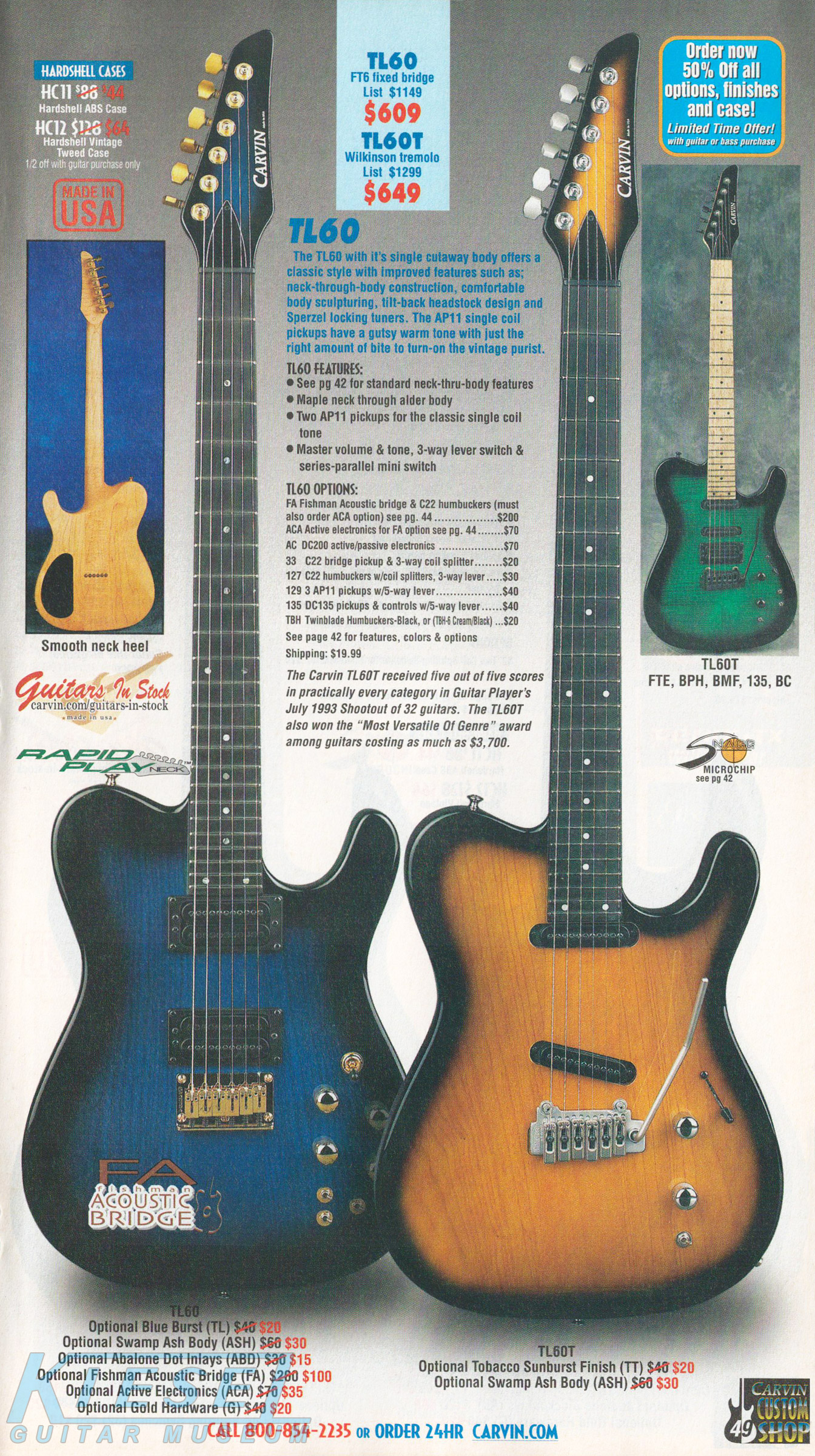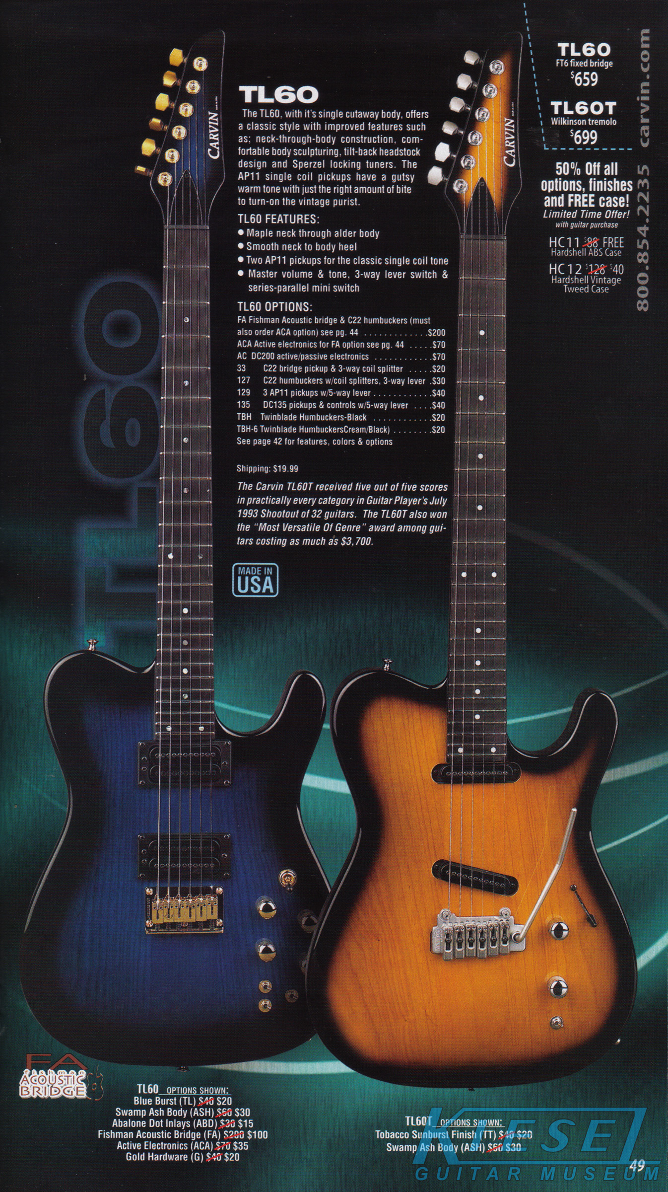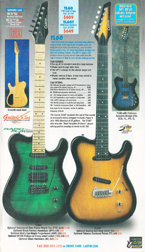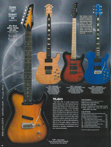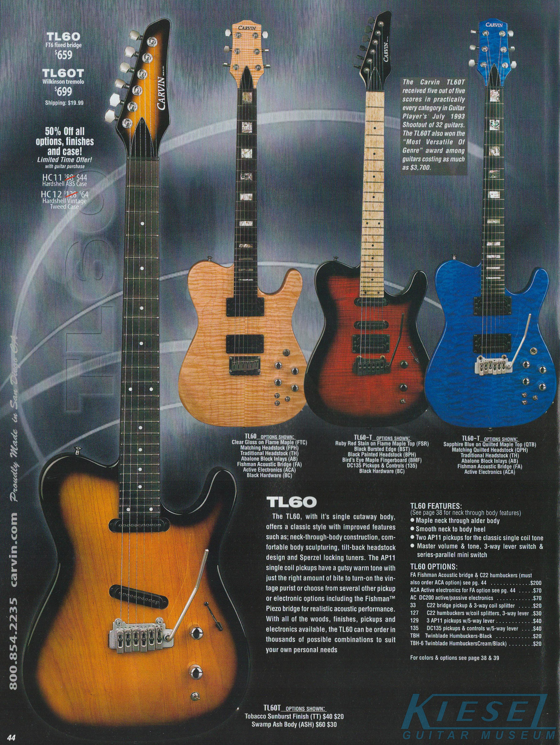 model started at $699. The Winter catalog photo showed a TL60 in Blueburst on swamp ash with abalone dot inlays, Fishman acoustic bridge/active electronics and