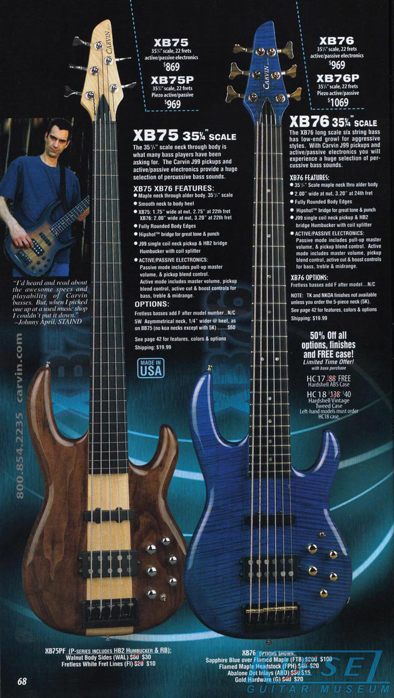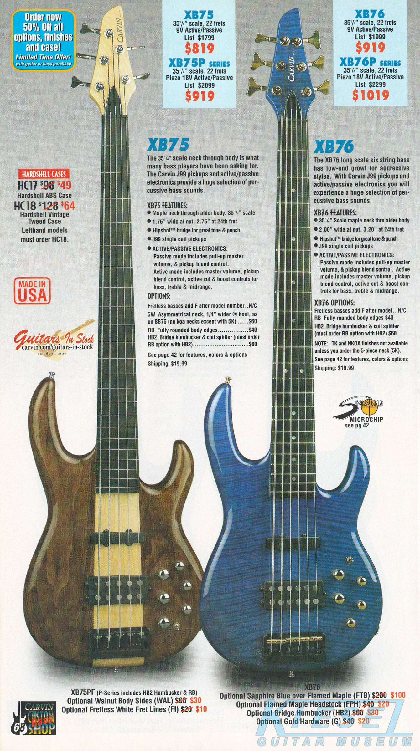 July 2003 catalog showed an XB75PF in walnut, and an XB76 in Sapphire Blue over flamed maple with matching headstock, HB2