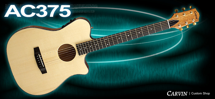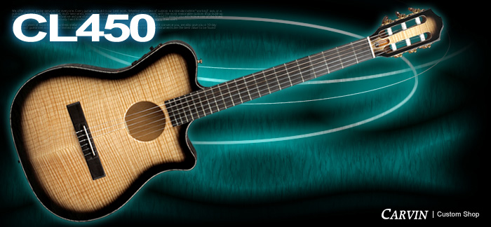 the AC375 in clear gloss on AAA Engleman spruce with body binding and gold hardware, and the CL450 in clear gloss with blackburst edges on flamed maple with