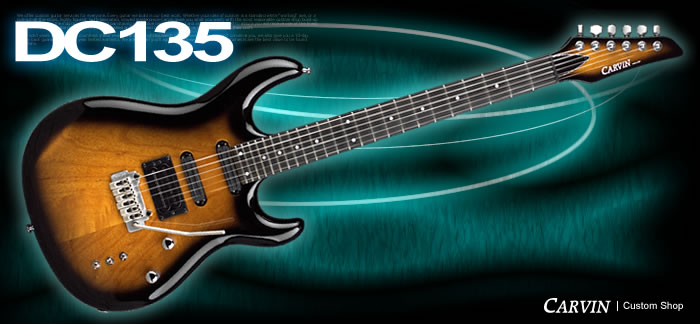 and matching headstock, rounded body sides, abalone block inlays, and black hardware. The DC135 was shown in Sunsetburst on swamp ash with matching