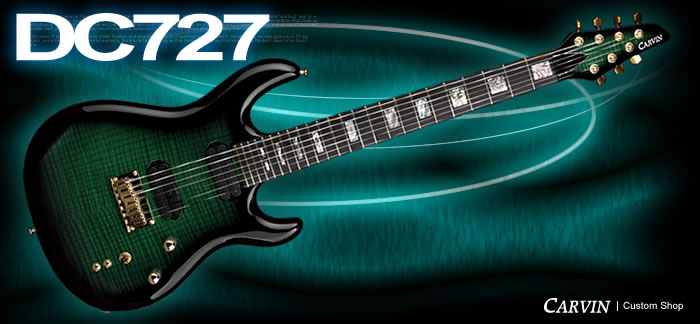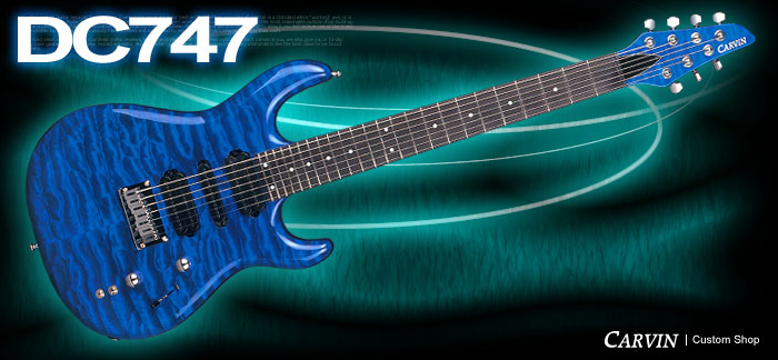 showed the DC727 in Greenburst on flamed maple with matching headstock, abalone block inlays and gold hardware, and the DC747 was shown in Sapphire Blue on quilted