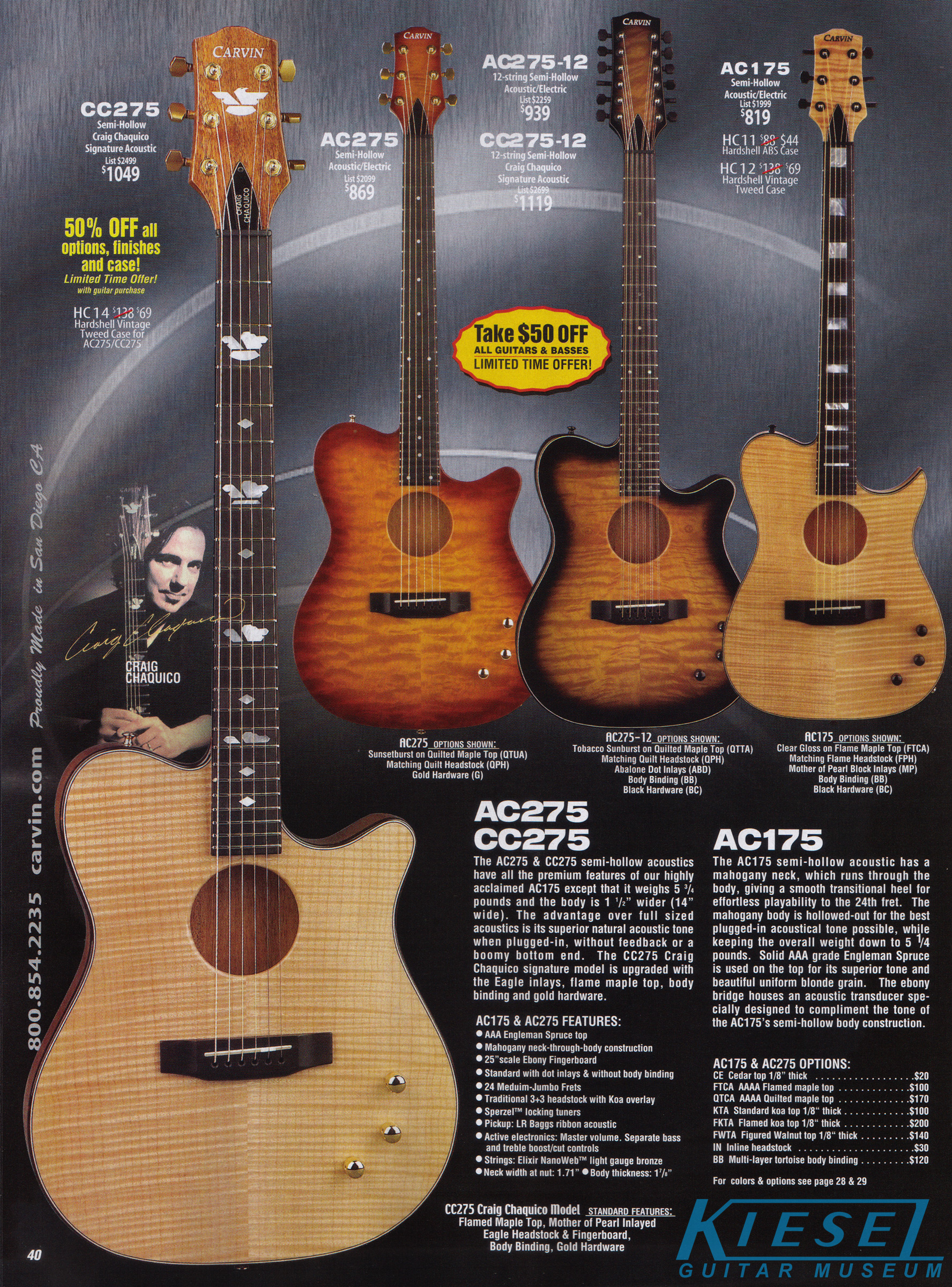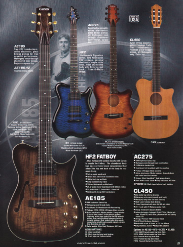 The AC175, AC275 and Craig Chaquico Signature CC275 models were all the same as their 2004 counterparts. From left to right, the catalog showed a CC275 in standard clear gloss on flamed maple top, eagle inlays, body binding and gold hardware; an AC275 in Umber Stain/Sunsetburst on flamed maple with matching headstock and black hardware; an AC275-12 in Tobacco Sunburst on quilted maple with matching headstock, body binding, abalone dot inlays and black hardware; and an AC175 in clear gloss on flamed maple with matching headstock, MOP block inlays, body binding, and black hardware.