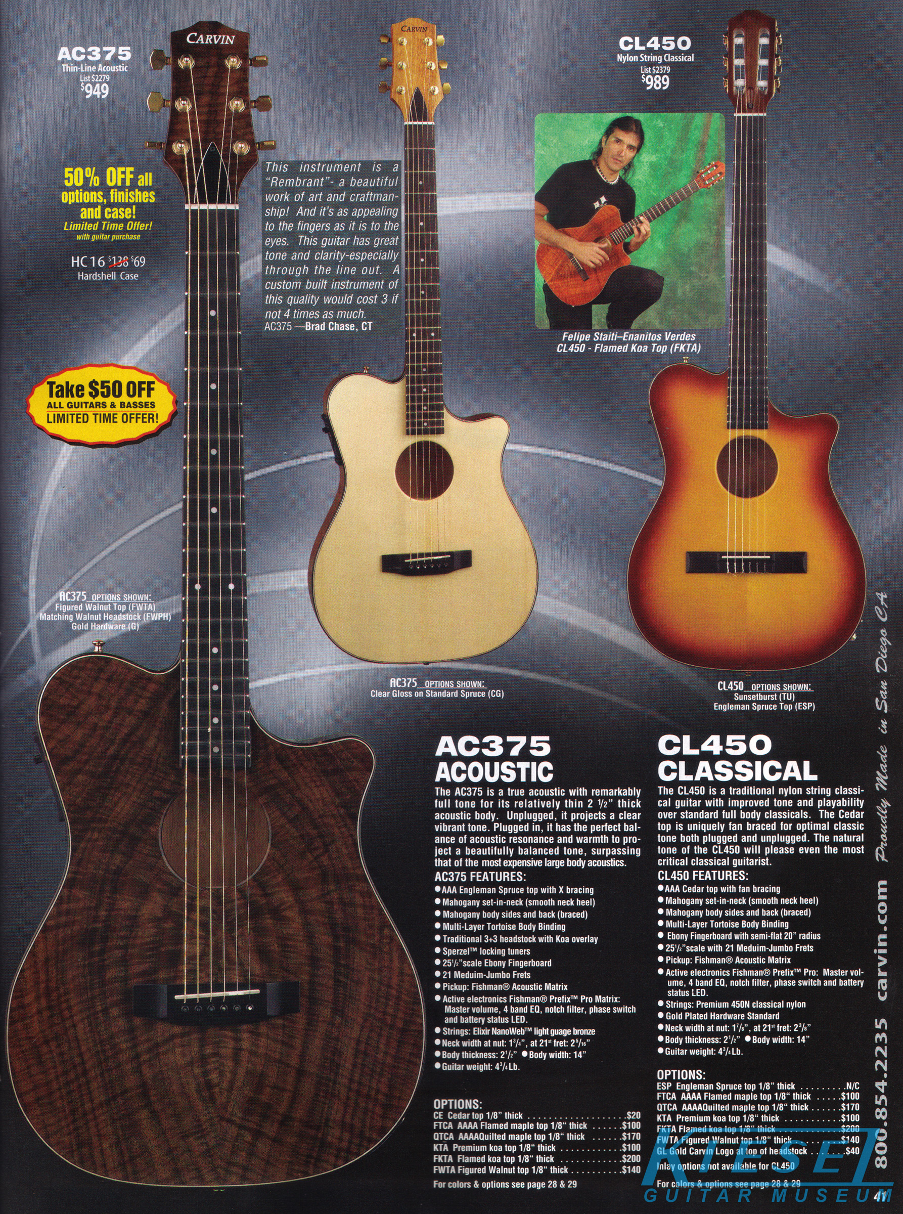 The AC375 and CL450 were also unchanged from 2004. The catalog showed an AC375 in figured walnut with matching headstock and gold hardware, an AC375 in clear gloss on spruce, and a CL450 in Sunsetburst on spruce.