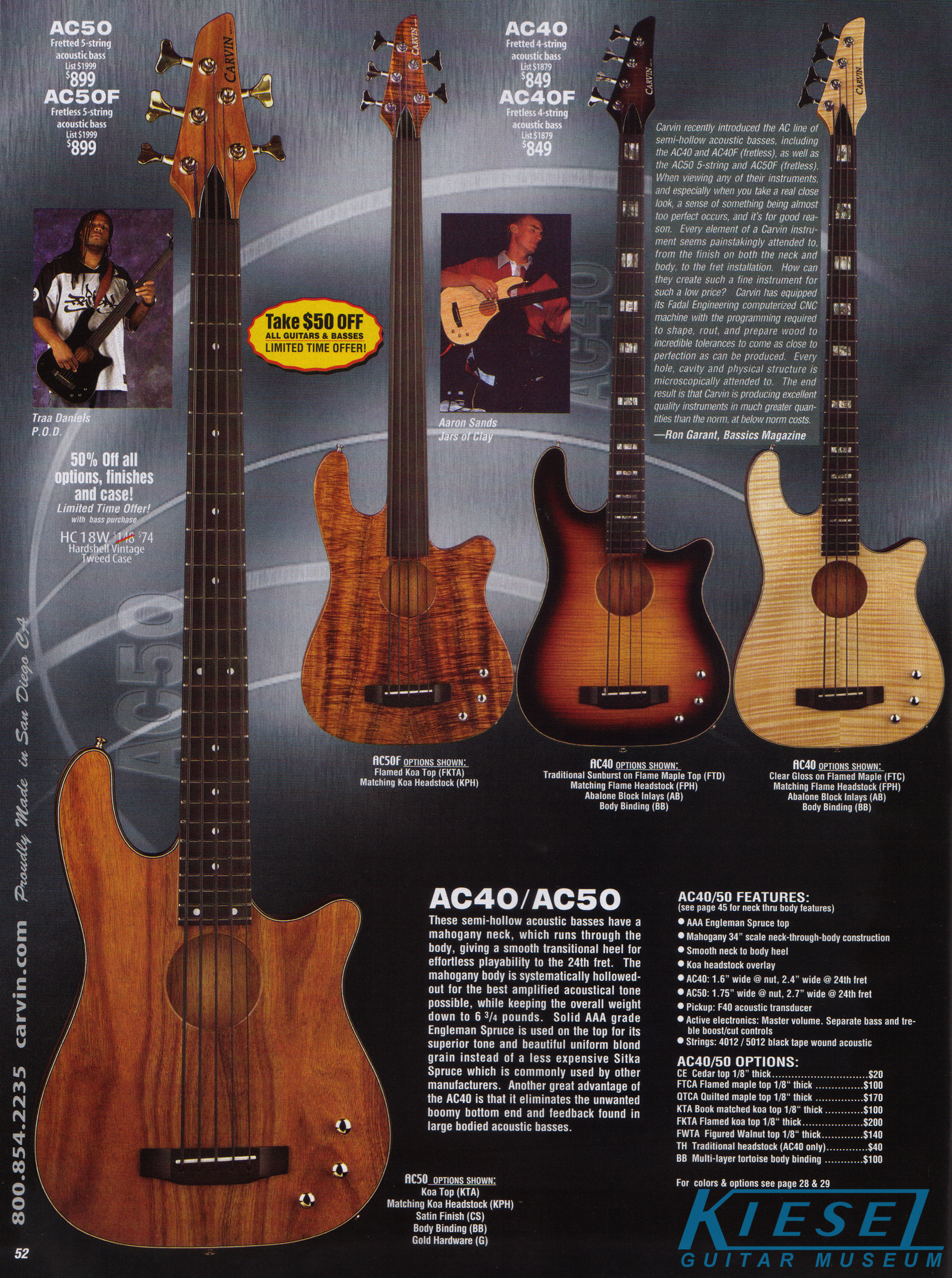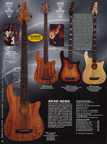 The AC40 and AC50 acoustic/electric basses were the same as the 2004 models. The Winter catalog showed the AC50 in satin finished koa with matching headstock, body binding and gold hardware; an AC50F with flamed koa top and matching headstock with chrome hardware; an AC40 in Traditional Sunburst on flamed maple with matching headstock and body binding, and an AC40 in clear gloss on flamed maple with matching headstock and body binding.