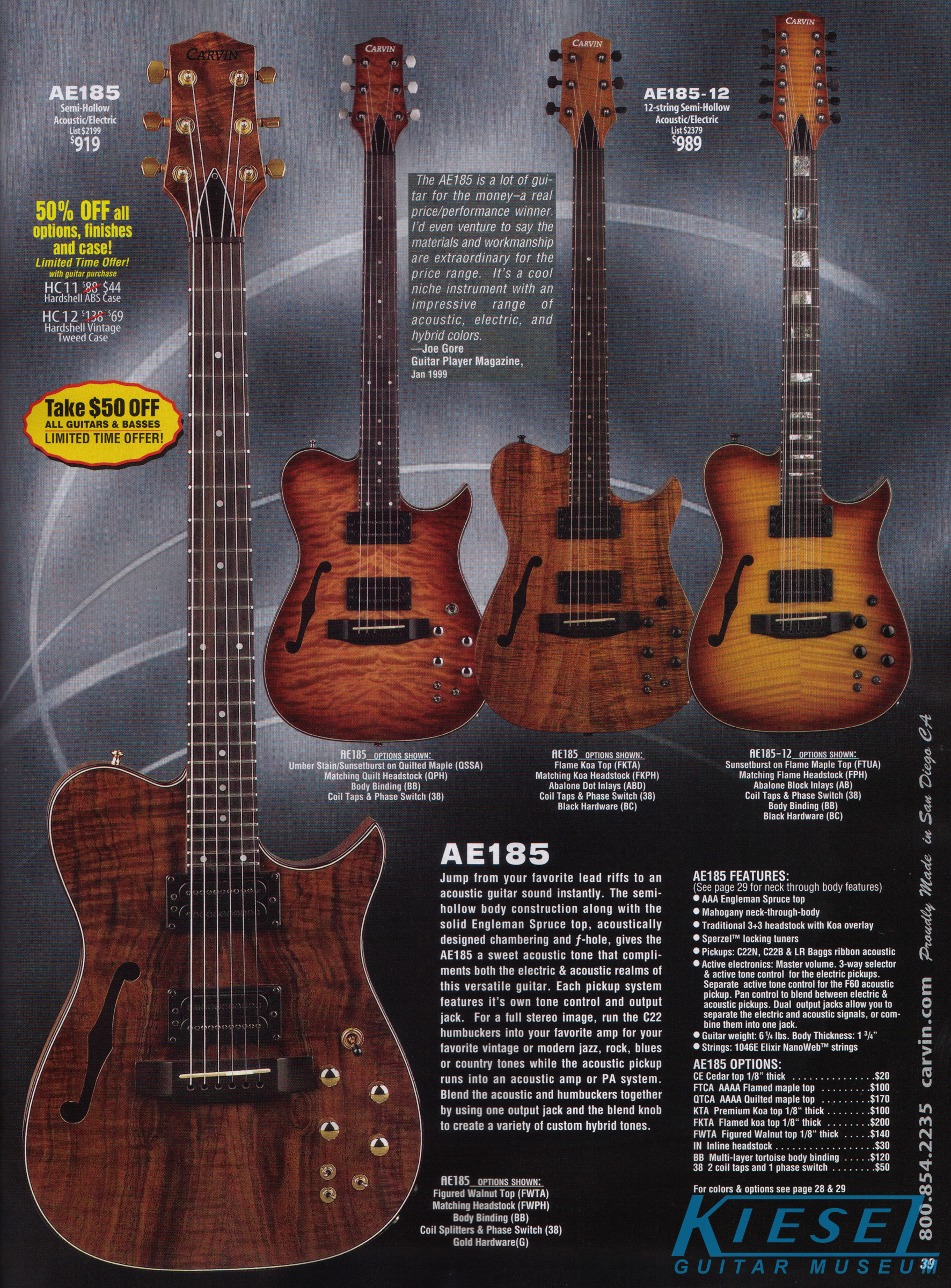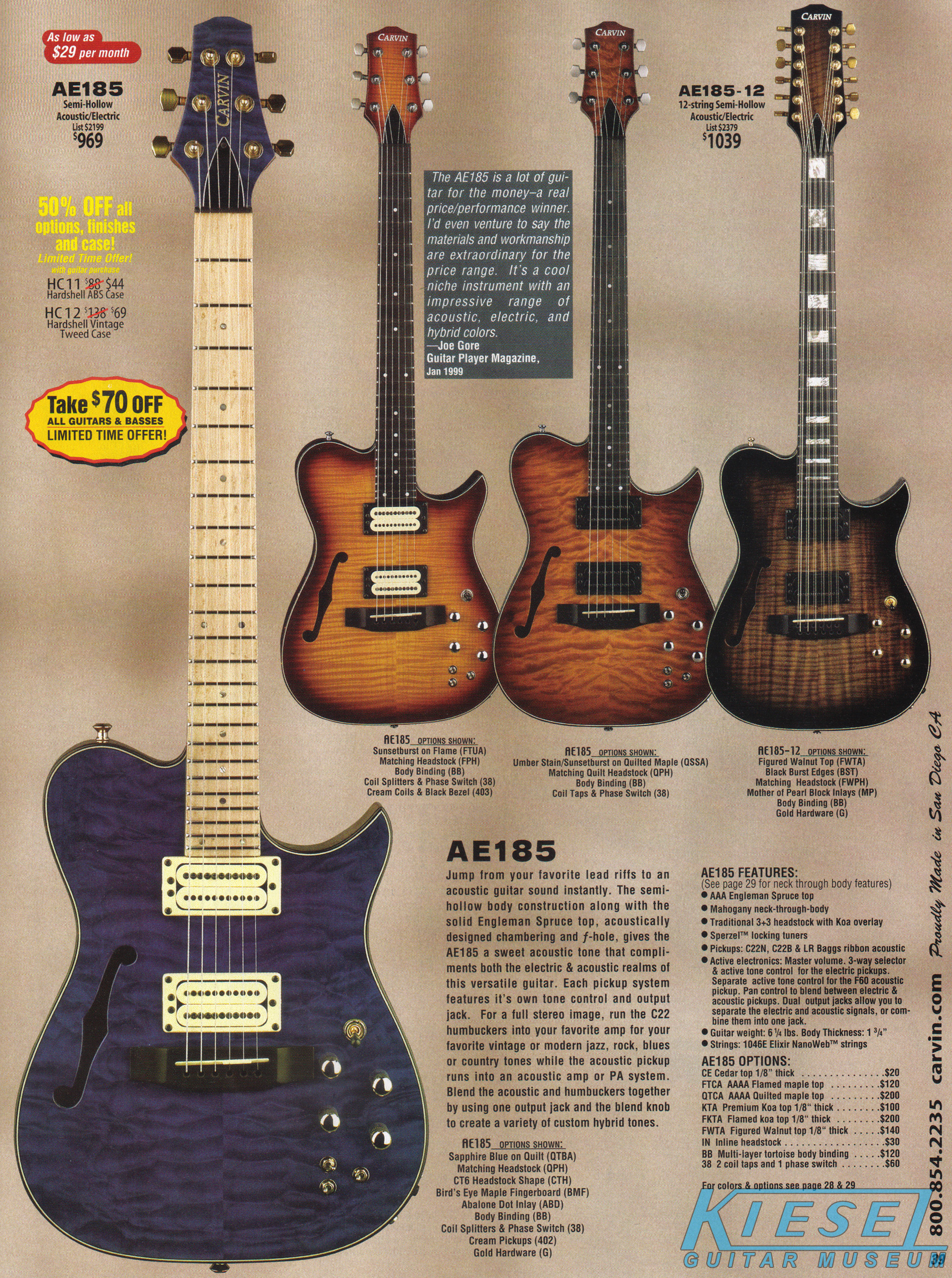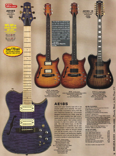 The AE185 was unchanged. The Winter catalog showed an AE185 with figured walnut top and matching headstock, body binding, coil taps and phase switch and gold hardware; an AE185 in Umber Stain/Sunsetburst on flamed maple with matching headstock, body binding, coil taps and phase switch and gold hardware; an AE185 in flamed koa with matching headstock abalone dot inlays, black hardware and coil taps/phase switches; and an AE185-12 in Sunsetburst on flamed maple with matching headstock, abalone block inlays, body binding, black hardware and coil taps and phase switches. The fall catalog showed an interesting AE185. It was finished in sapphire blue on quilted maple, but had the new California headstock, instead of the traditional 3 X 3 normally found on this model; the CT headstock would eventually become standard. This example also had body binding, a Birdseye maple fingerboard and gold hardware. Also shown were an AE185 in Sunsetburst on flamed maple, and AE185 in Umber Stain with Sunsetburst edges on quilt, and an AE185-12 in figured walnut with blackburst edges.