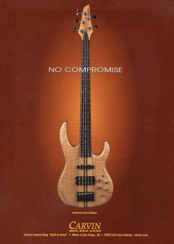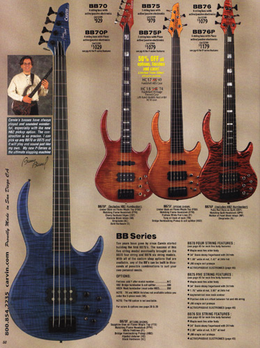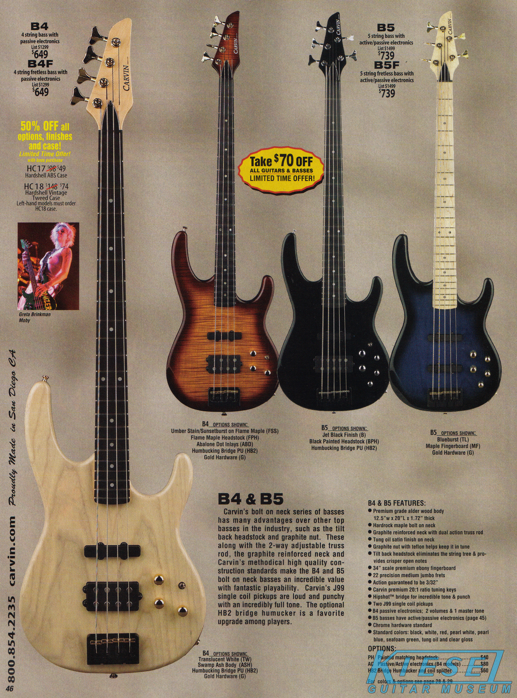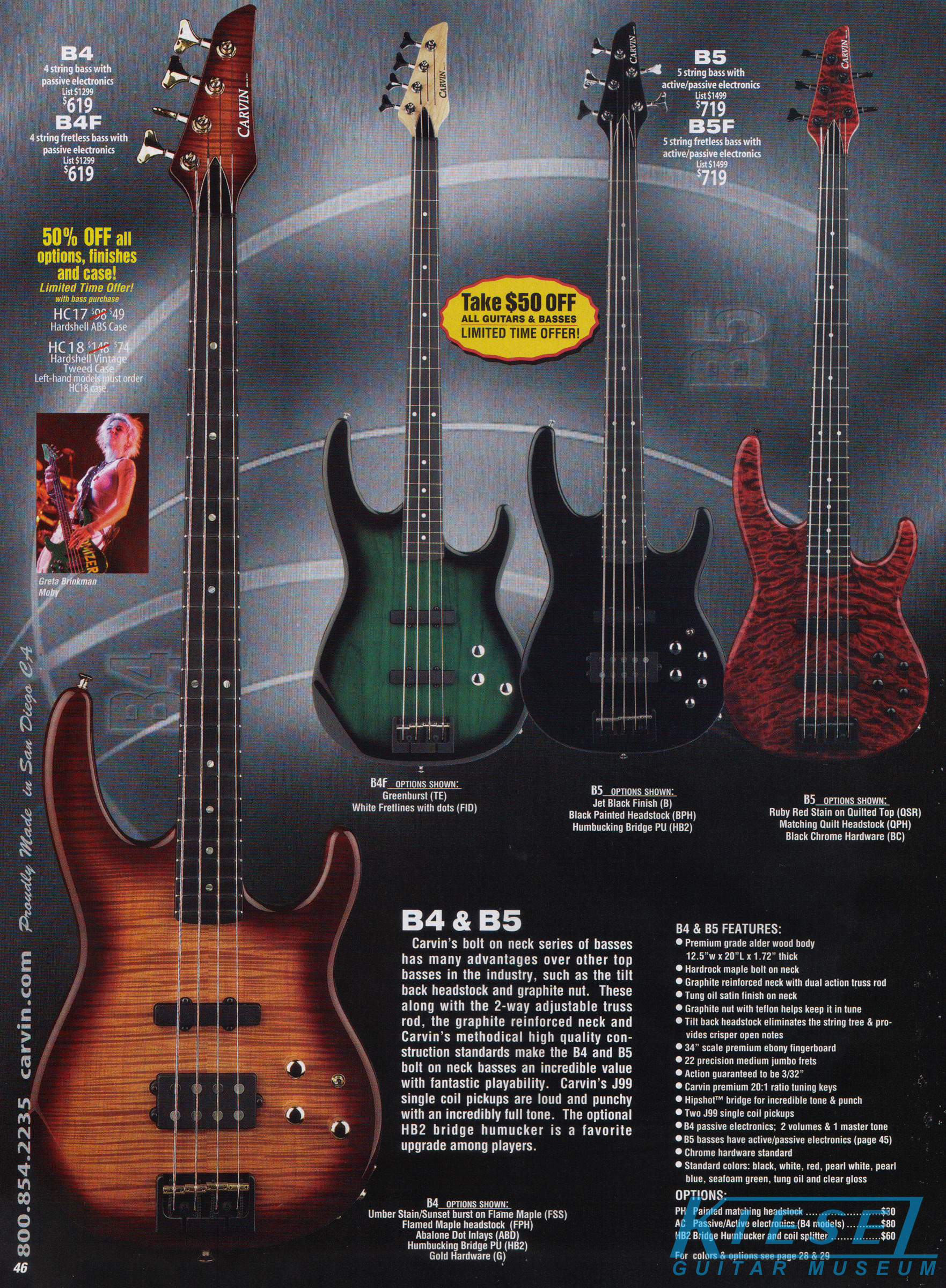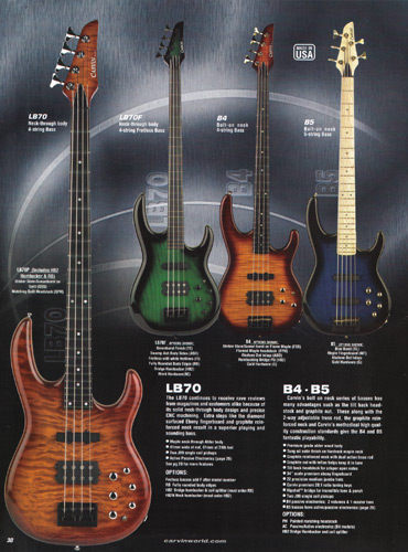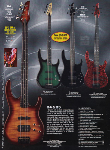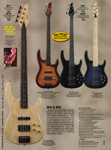 Carvin's bolt-neck basses, the B4 and the B5, were the same as the 2004 models. Like the guitars, they increased in price by $50.00, but with the $50.00 off sale, they actually remained the same in price as 2004. The Winter catalog showed a B4 in Umber Stain/Sunsetburst on flamed maple with matching headstock, abalone dot inlays, HB2 pickup and gold hardware; a B4F in Greenburst; a B5 in Jet Black with matching headstock and HB2 pickup; and a B5 in Ruby Red Stain on quilted maple with matching headstock and black chrome hardware. The newly-redesigned summer catalog showed the same Umber Stain with Sunsetburst edgesB4 and the same black B5 as the winter edition; also shown was a B4 in clear gloss on swamp ash and a B5 in blueburst with a birdseye maple fingerboard.
