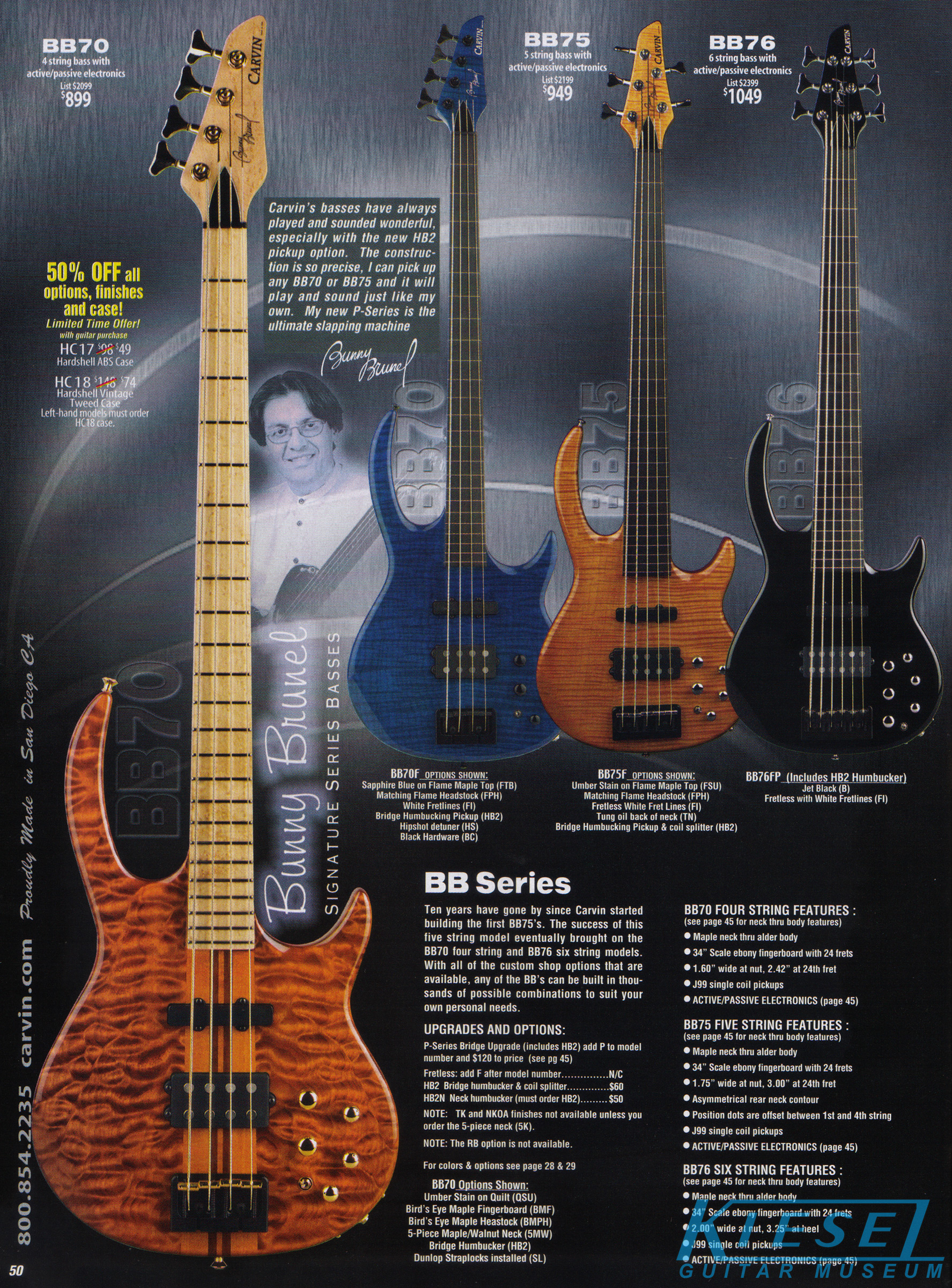 The Bunny Brunel Signature Series basses were unchanged, as well. The Winter catalog showed a BB70 in Umber Stain on quilted maple with Birdseye maple fingerboard, Birdseye maple headstock, HB series bridge pickup and gold hardware; a BB70F in Sapphire Blue on flamed maple with matching headstock, Hipshot detuner, HB pickup and black hardware; a BB75F in Umber Stain on flamed maple with matching headstock, HB pickup and gold hardware; and a BB76PF in Jet Black. As with other models, the BB series had a new design in the Summer '05 catalog. Shown were a BB70F in Sapphire Blue on flamed maple, a BB70P in Umber Stain with cherry sunburst edges on flame, a BB75F in Umber Stain on flame, and a BB76P in Ruby Red Stain on quilted maple.