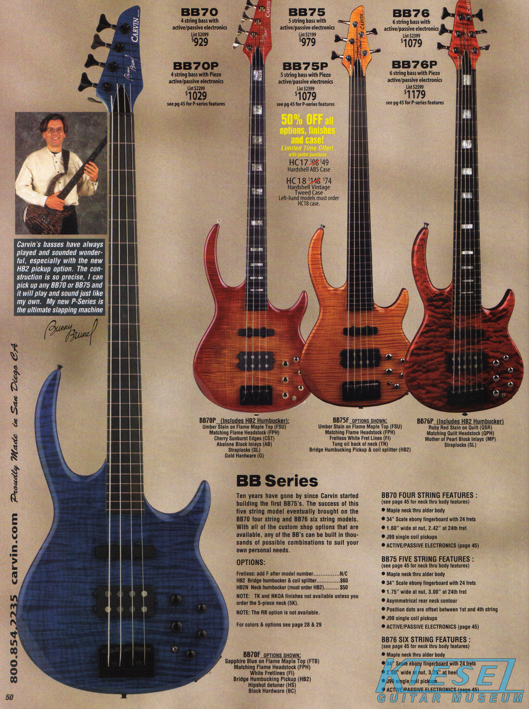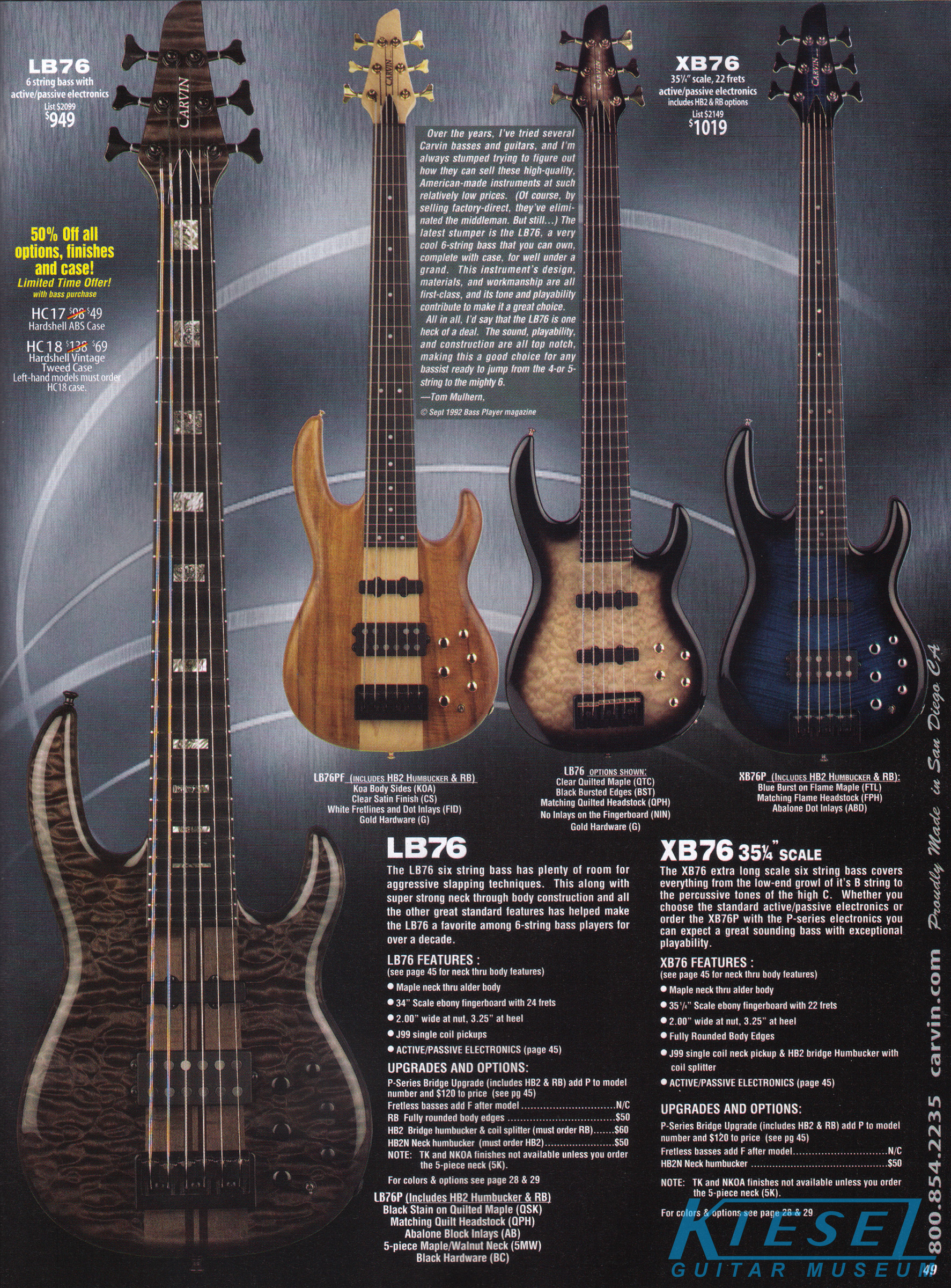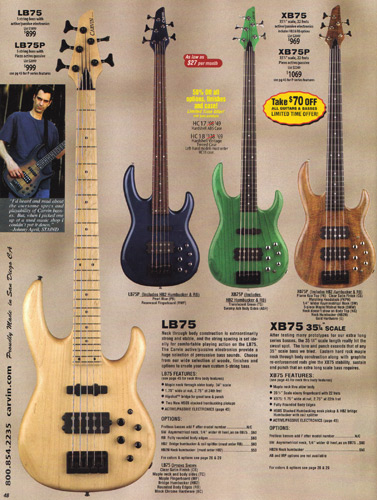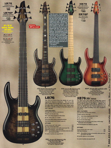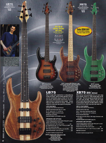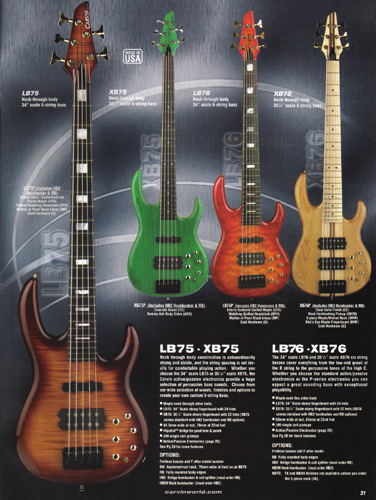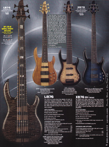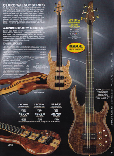 The Claro Walnut and Anniversary Series basses had some new photography in the catalog, as well as some new models. For the first time, XB model basses were official available as an Anniversary or Claro Walnut model. In the past, an XB bass could be ordered with the features of an A or W series bass, but it wasn't an "official" model. The Winter catalog showed an LB75AP in clear gloss on quilted maple, and an XB75WP in figured walnut.