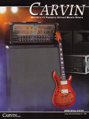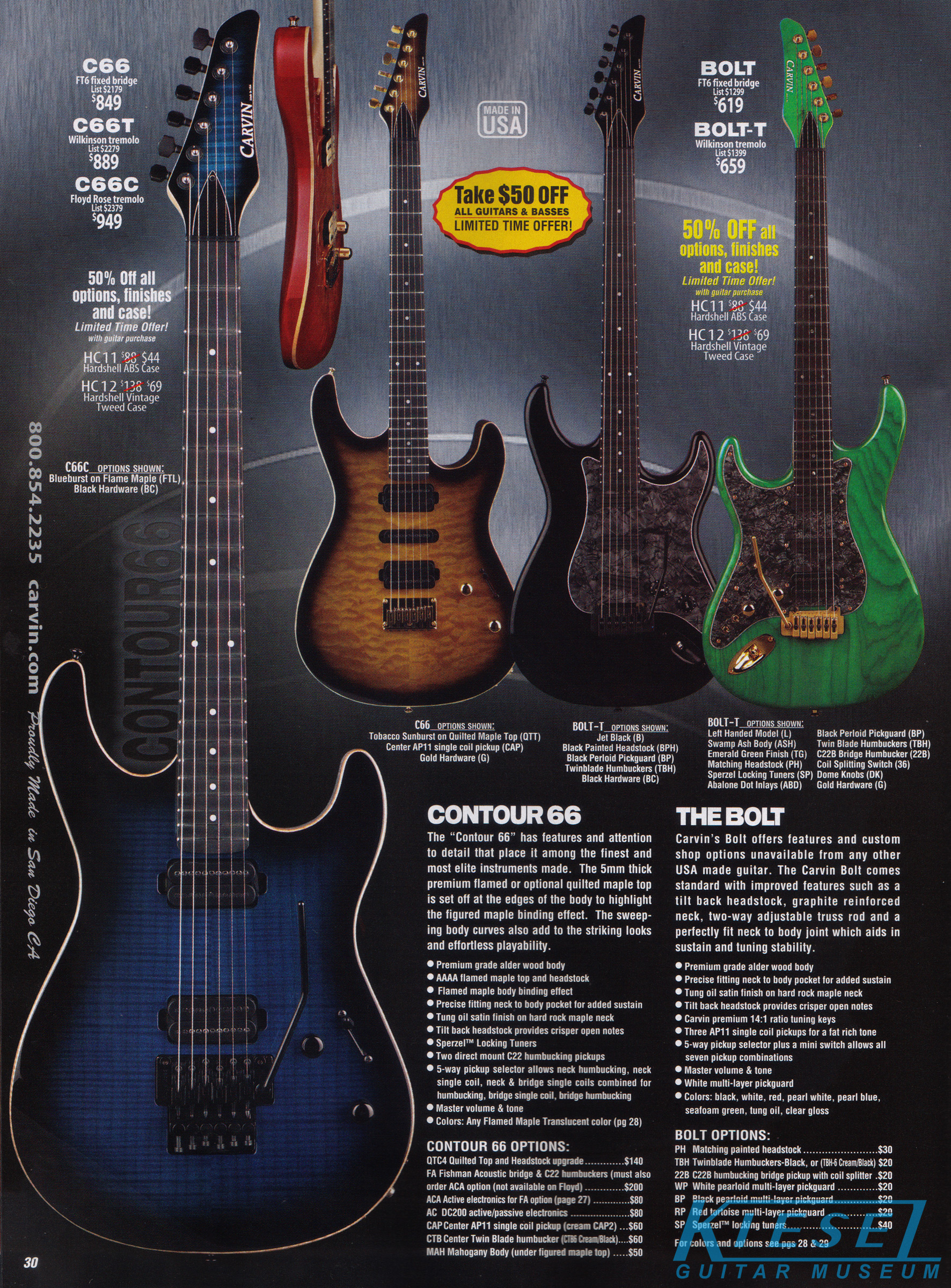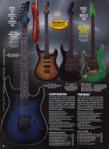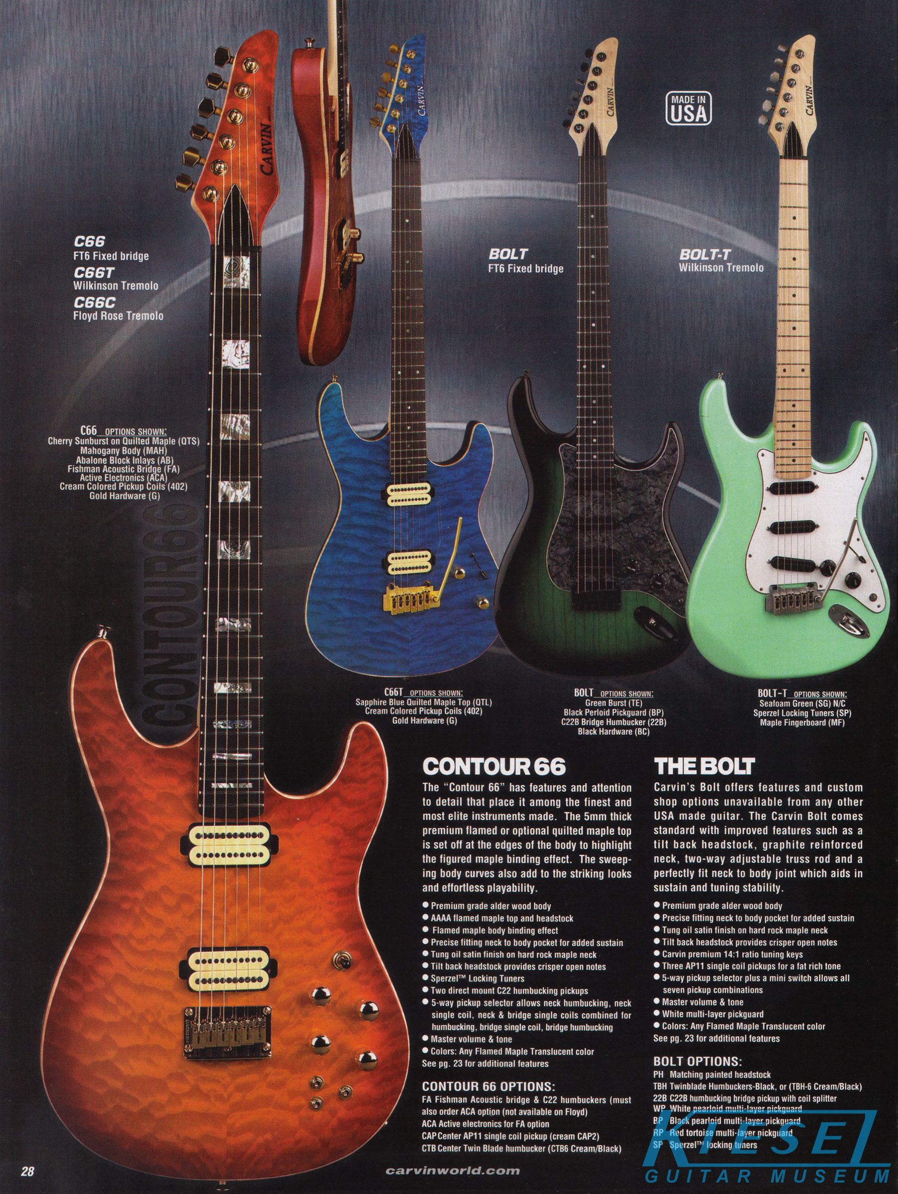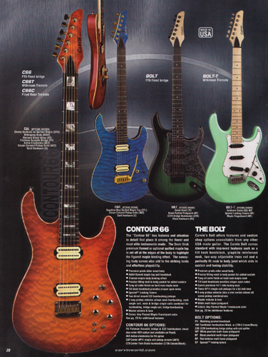 The Contour 66 and Bolt guitars were unchanged for 2005, as were all Carvin guitars in the early part of the year. There were some price increases on these models over 2004, of about $50.00 on each model and the tremolo-equipped variants; however, the 2004 prices had dropped from 2003, so the 2005 prices were only about $20.00 more on each model than they had been in 2003. With the $50.00 off special, these models were actually less than in 2004. And, as was fairly normal, Carvin offered half-off on all options and cases, so the C66 and Bolt were still great values for the dollar. The Winter catalog showed a C66C in blueburst on flamed maple with black hardware; a C66 in tobacco sunburst on quilted maple with gold hardware and a center-mounted AP11 pickup; a Bolt-T in black with matching headstock, black pearloid pickguard, black hardware and twinblade humbuckers; and a left-handed Bolt-T in emerald green on swamp ash with matching headstock, black pearloid pickguard, twinblade humbuckers with a C22B bridge pickup with coil splitters and gold hardware. Although still available, the BoltPlus was not shown in the Spring or Summer catalogs due to space restrictions.