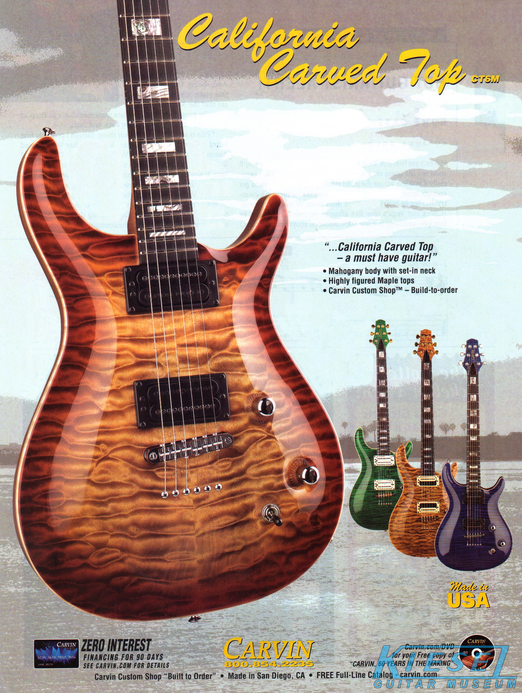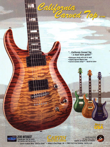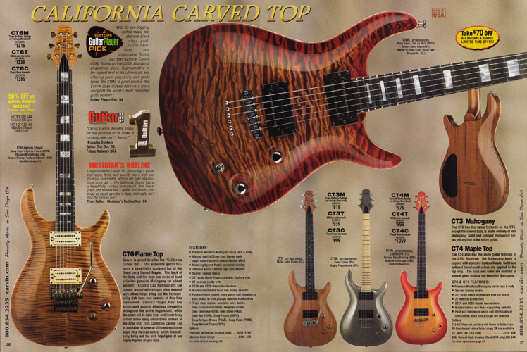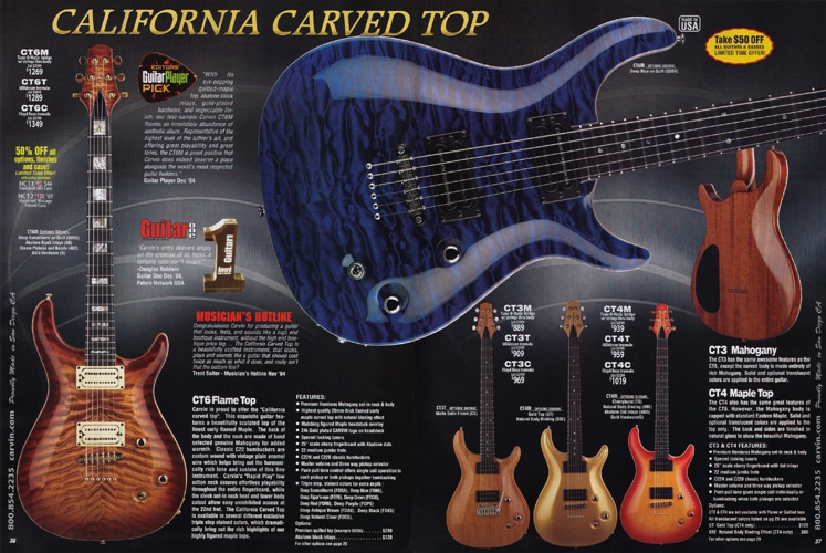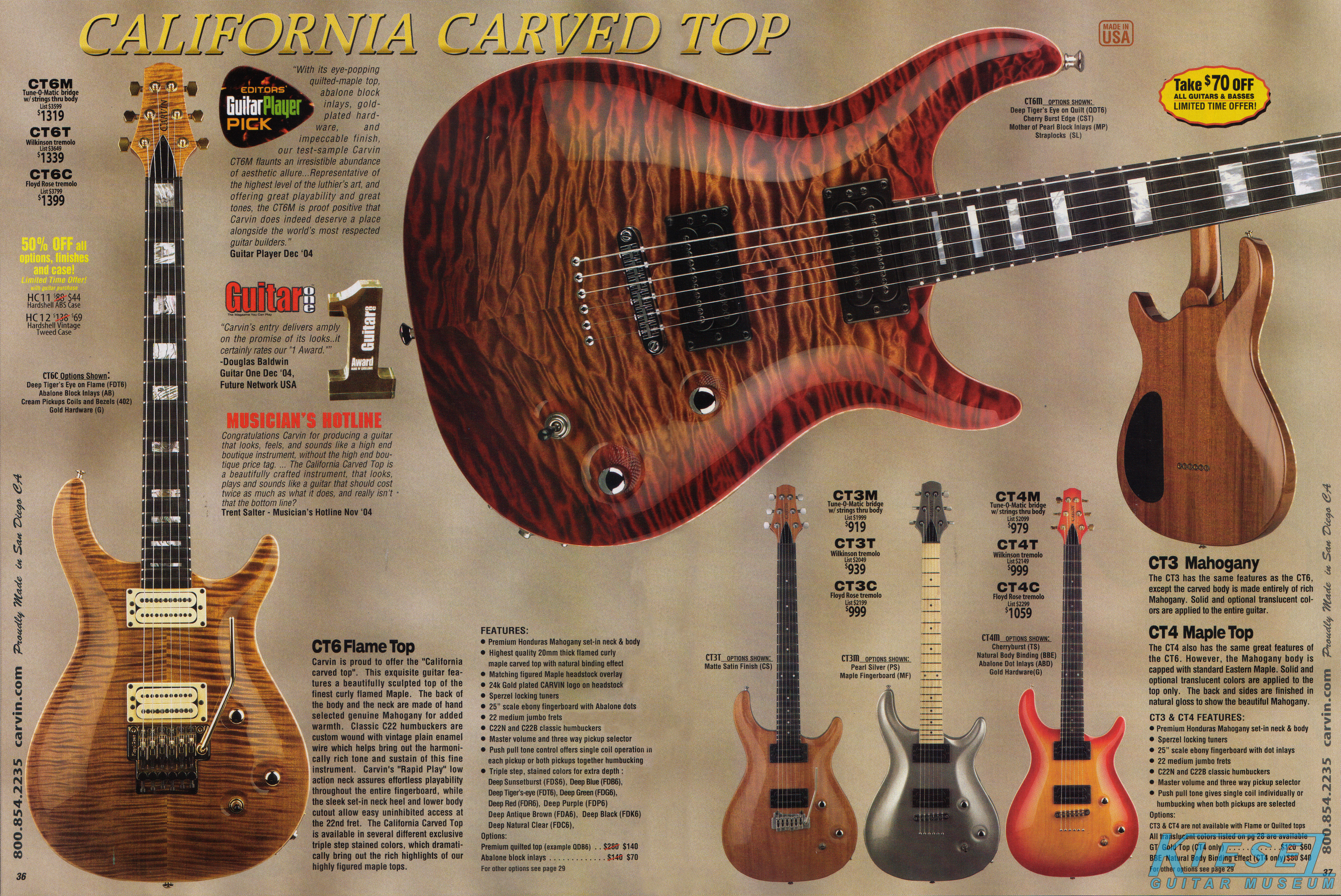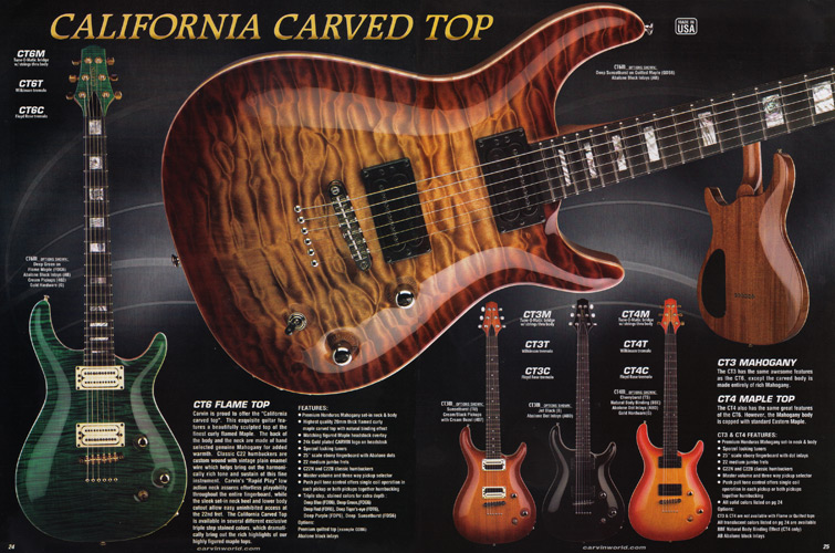 The California Carved Top models were once again treated to a two-page spread, although the prices and features remained the same as in 2004. The Winter catalog showed a CT6M in Deep Sunsetburst on quilt with matching headstock, abalone block inlays and gold hardware; a CT6M in Deep Blue on quilted maple; a CT3T in matte satin finish on mahogany; a gold top CT4M with natural body binding; and a CT4M in Cherryburst with natural body binding and gold hardware. The Summer catalog showed a CT6M is finished in Triple-Step Tiger Eye with Cherryburst edges on quilted maple. The CT6C model on the left is Triple-Step Tiger's Eye on flamed maple. Two of the three smaller models were the same as the previous catalog, but the Gold Top model from the spring edition was replaced with a Pearl Silver CT3M model with birdseye maple fingerboard.