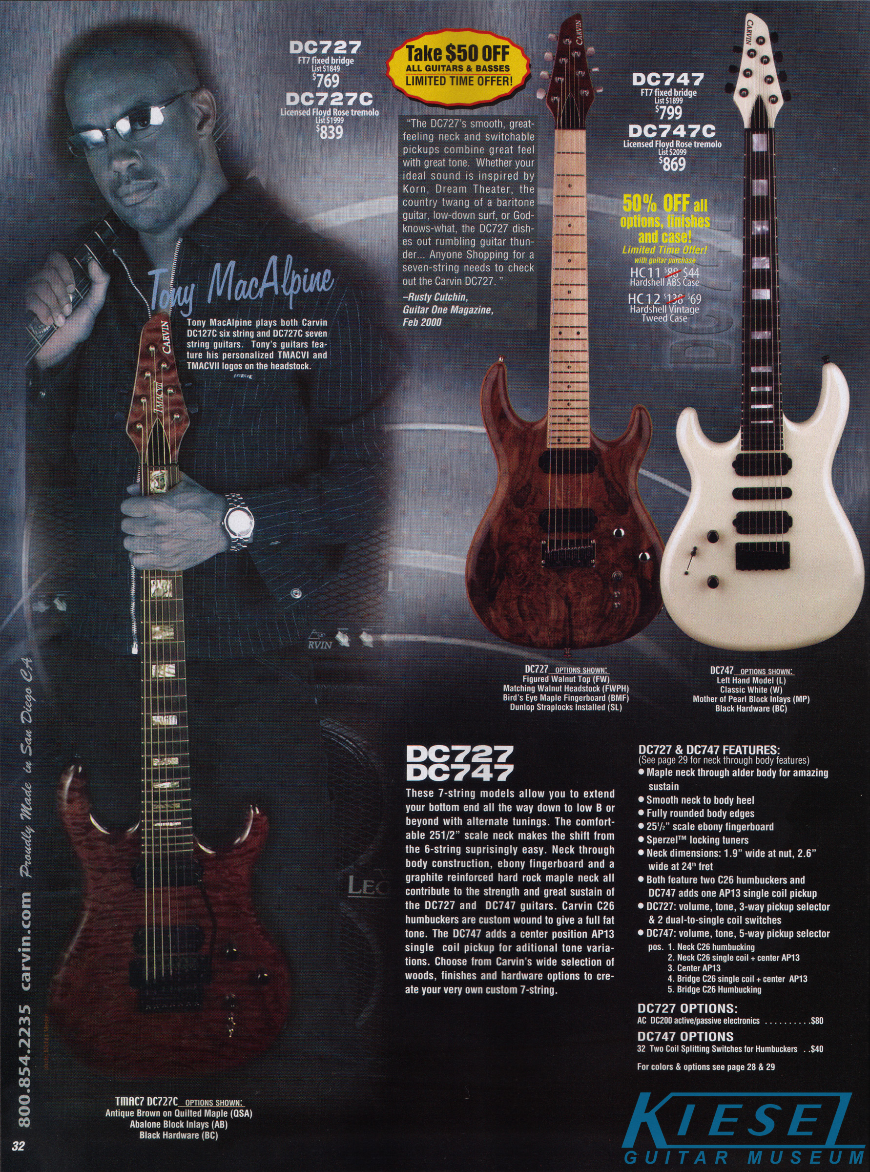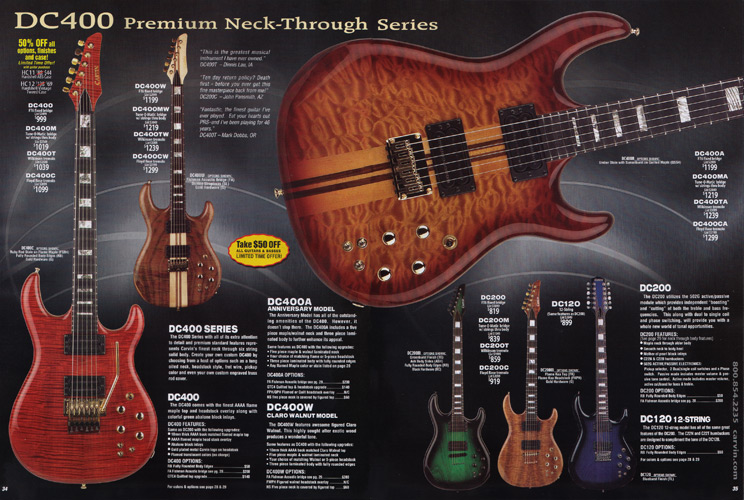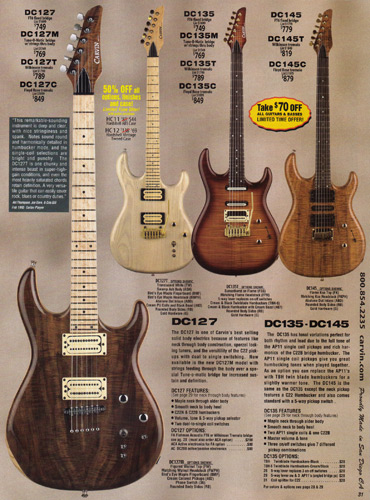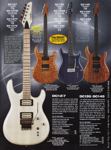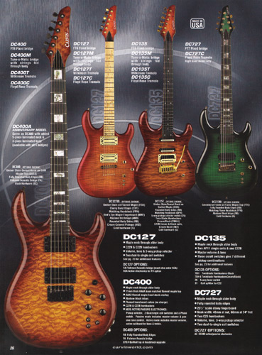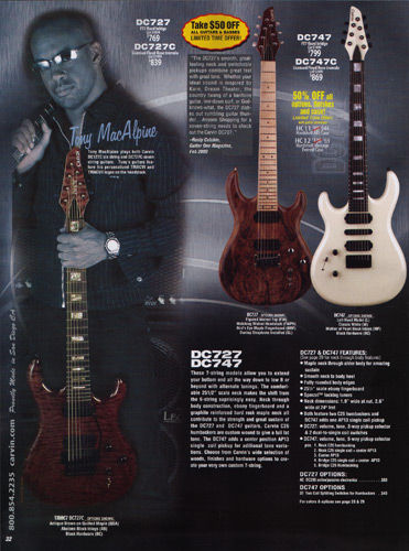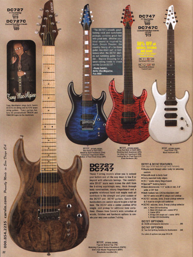 The DC727 and DC747 seven-string guitars were unchanged, with the exception of increase in prices. The catalog showed a DC727 with a figured walnut top and matching headstock and Birdseye maple fingerboard; and a left-handed DC747 in classic white with black hardware and mother-of-pearl block inlays.