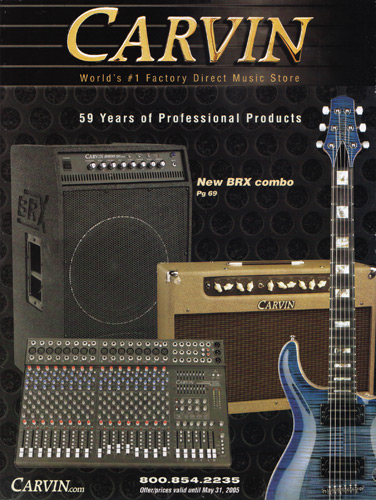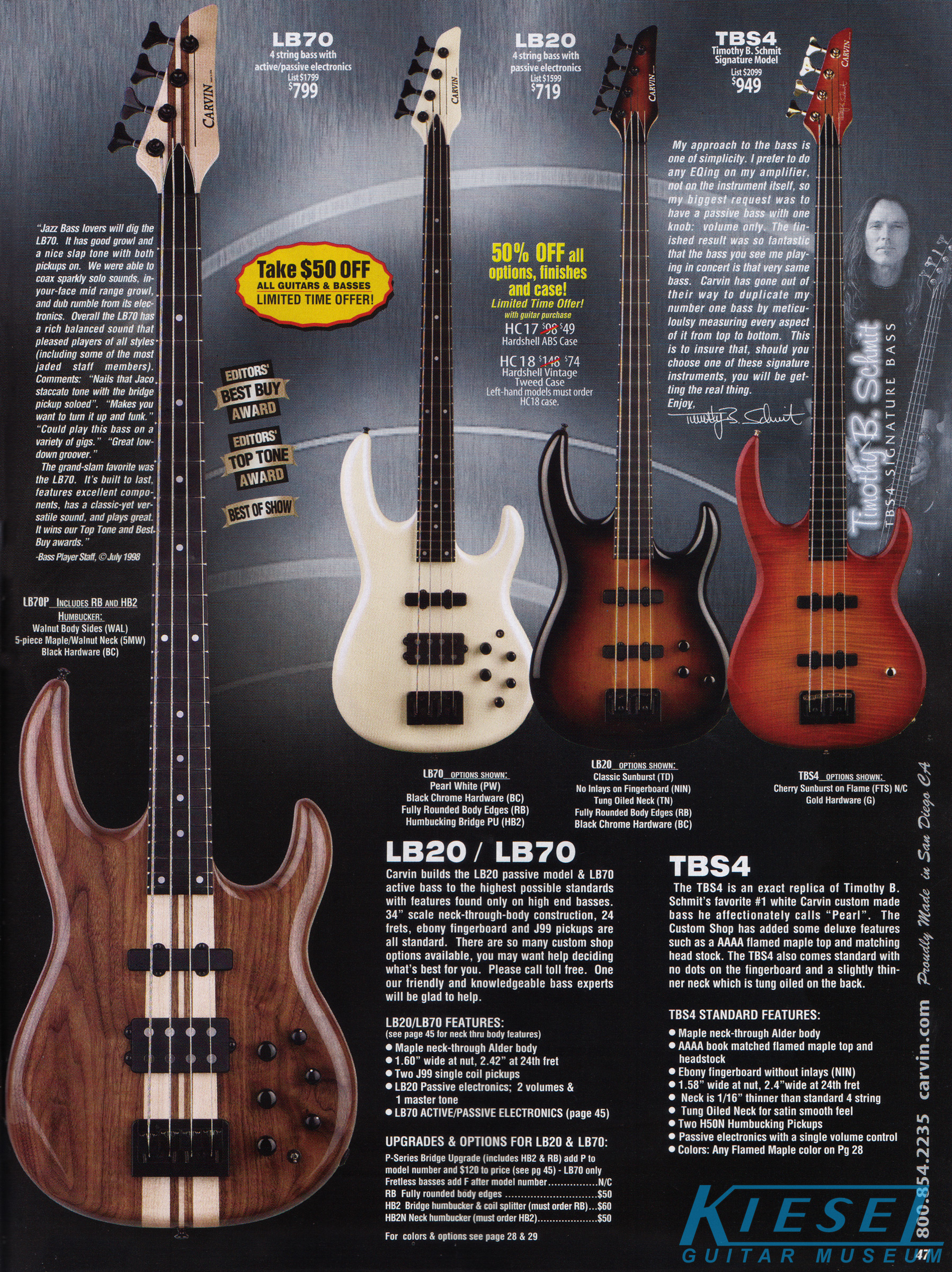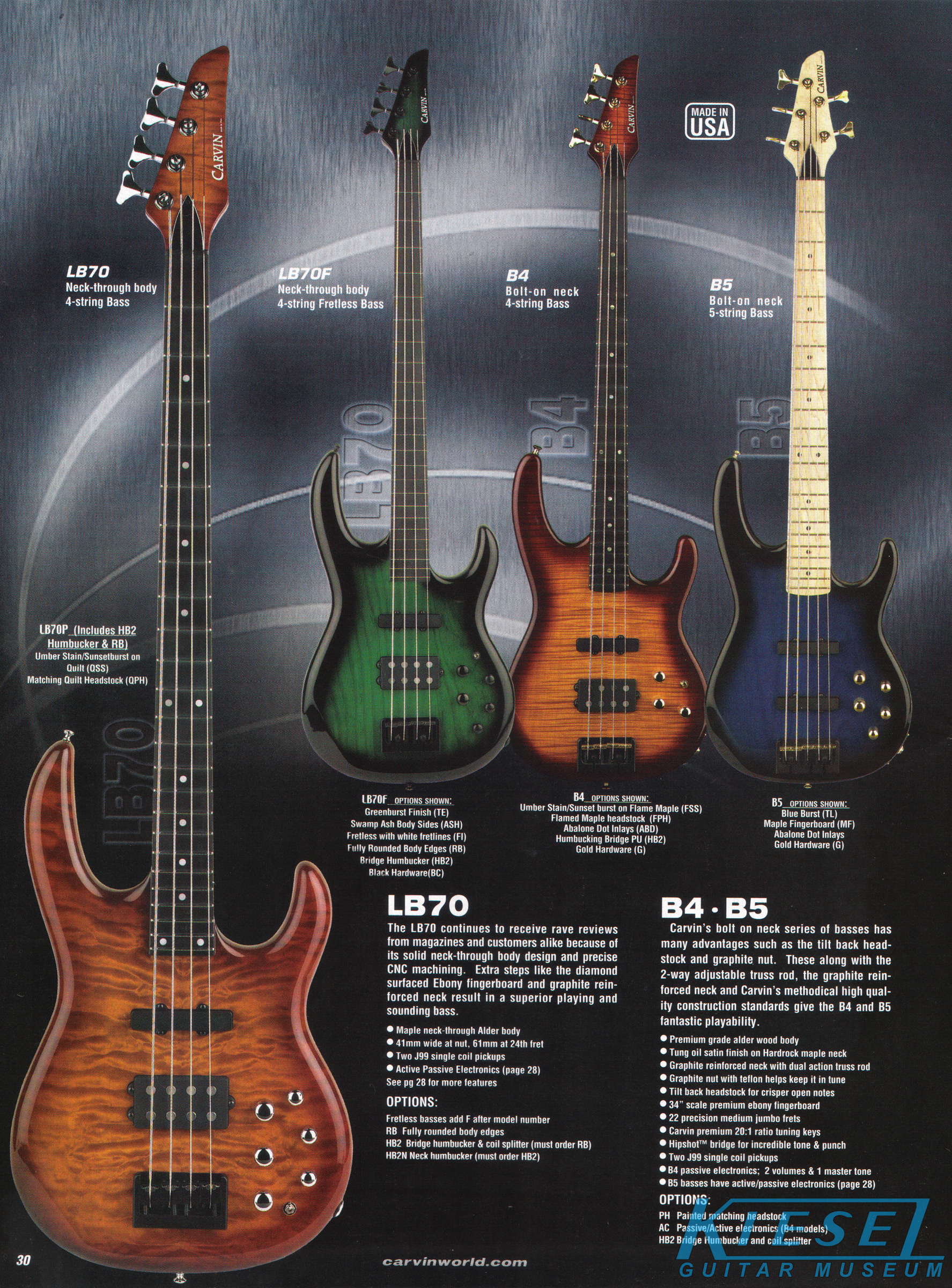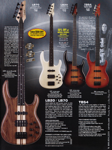 The LB70 turned 20 in 2005, more-or-less, having been produced in 1976 & 1977, and then again from 1988-2005. However, it and other Carvins based on it, the LB20 and TBS4, were unchanged. With the $50.00 off special, the prices were the same on all three models s in 2004. The Winter catalog showed an LB70P in walnut with 5-piece neck and black hardware; an LB70 in Pearl White with black chrome hardware and HB pickup; an LB20 in Classic Sunburst with matching headstock and black hardware, and a TBS4 in Cherry Sunburst on flamed maple with matching headstock and gold hardware. Although not widely publicized, a bass version of the CT headstock was made available in 2005.