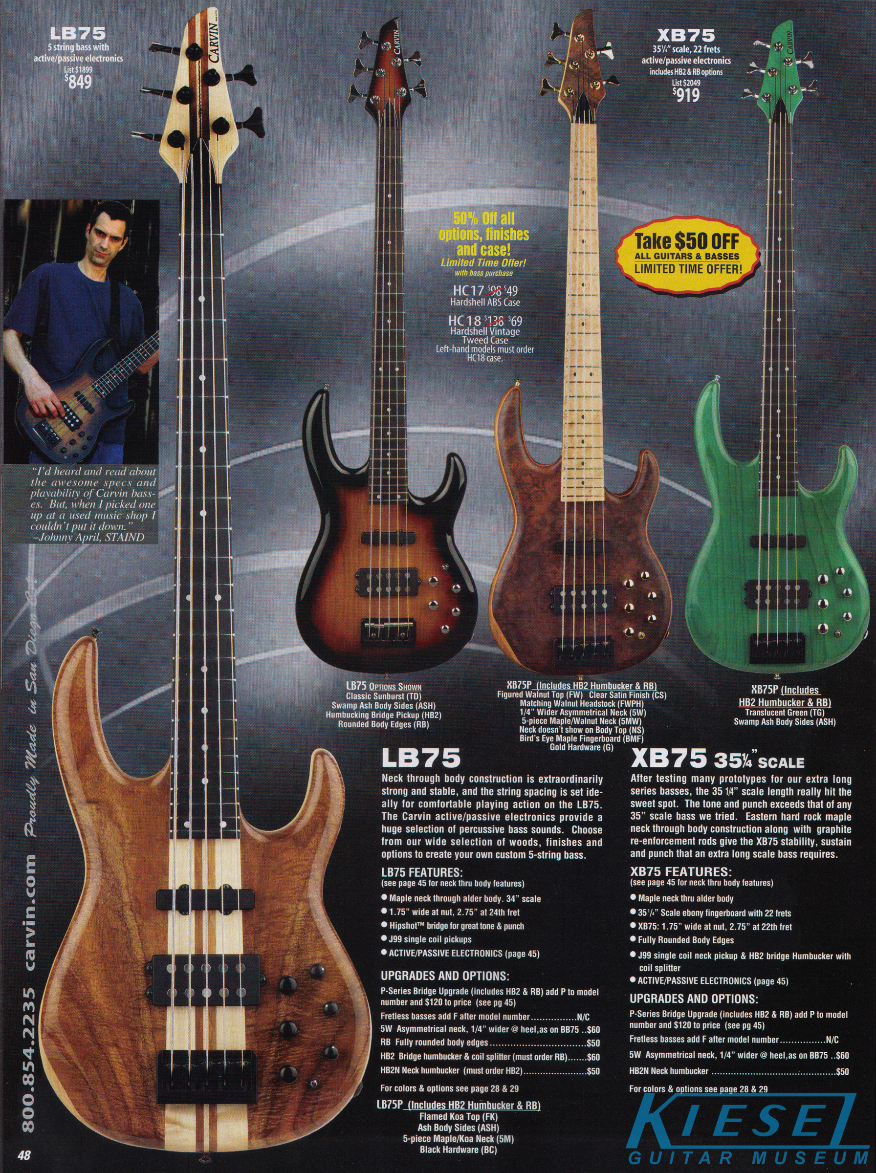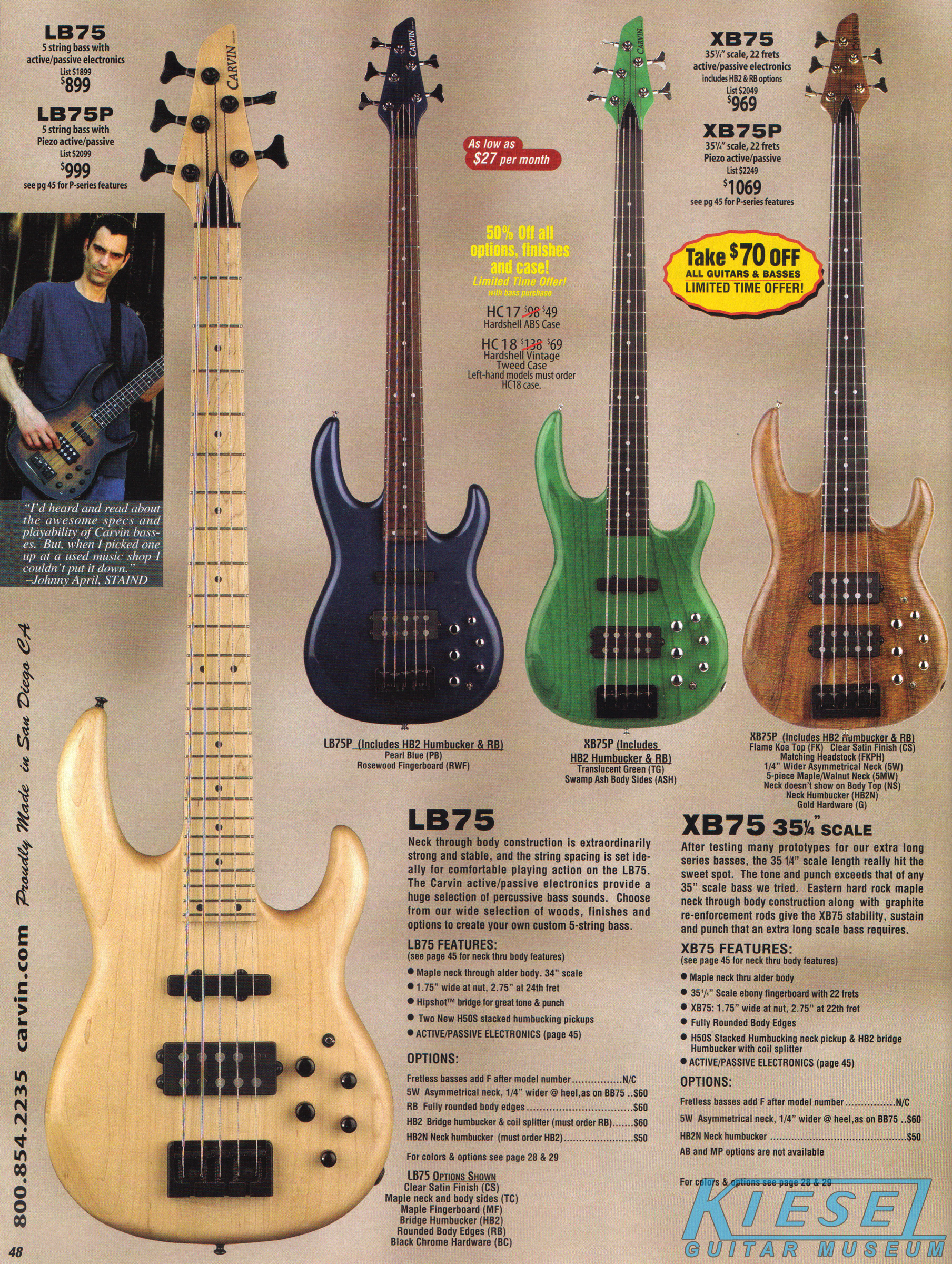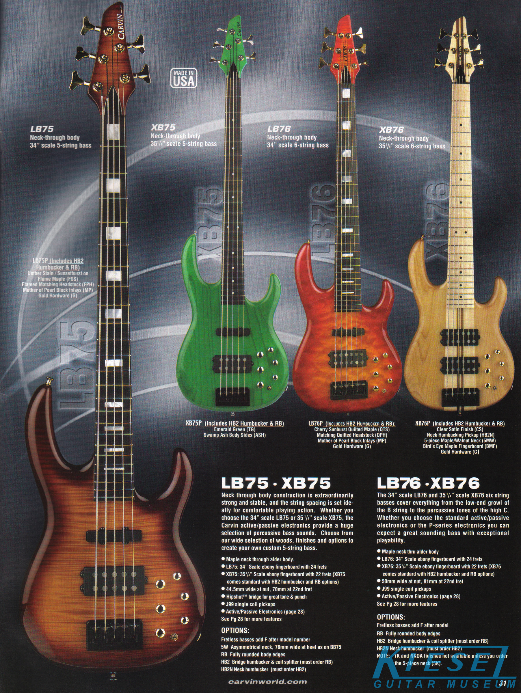The LB75 and XB75 5-string basses were unchanged for early 2005. The Winter catalog showed an LB75P with flamed koa top, swamp ash body, 5-piece maple/koa neck and black chrome hardware; an LB75 in Classic Sunburst on swamp ash with matching headstock and HB2 pickup; an XB75P with Claro walnut top and headstock, no-show neck, Birdseye maple fingerboard and gold hardware; and an XB75P in Translucent Green on swamp ash with chrome hardware. The Fall 2005 catalog showed an unusual all-maple LB75. In addition to the maple body and neck, this one has a maple fingerboard and black chrome hardware. Also shown was an LB75P in Pearl Blue with a rosewood fingerboard and chrome hardware; an XB75P in trans Emerald Green on swamp ash; and an XB75P with dual HB pickups and a satin-finished flamed koa top and matching headstock.