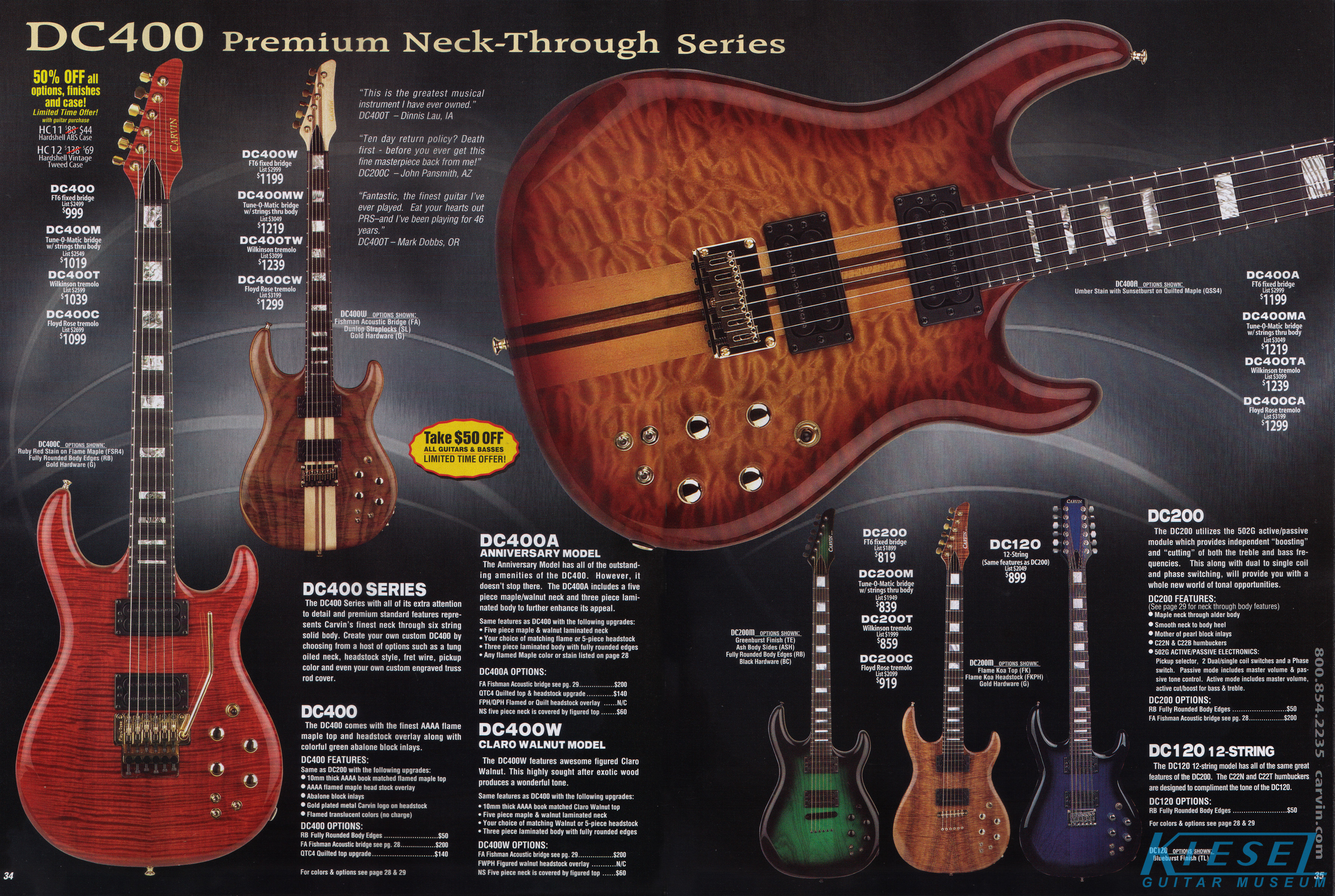 The DC400 returned to prominence in the 2005 catalog, with a two-page spread showing the various DC200 and DC400 models. With the $50.00 off special, the prices remained the same as 2004, as did the specifications. The Winter catalog showed a DC400C in Ruby Red Stain on flamed maple with matching headstock and gold hardware; a DC400W with Fishman bridge and gold hardware; and a DC400A in Umber Stain with Sunsetburst edges on quilted maple. Also shown was a DC200M in Greenburst on swamp ash with black hardware; a DC200M with flamed koa top and matching headstock with gold hardware; and a 12-string DC120 in Blueburst.