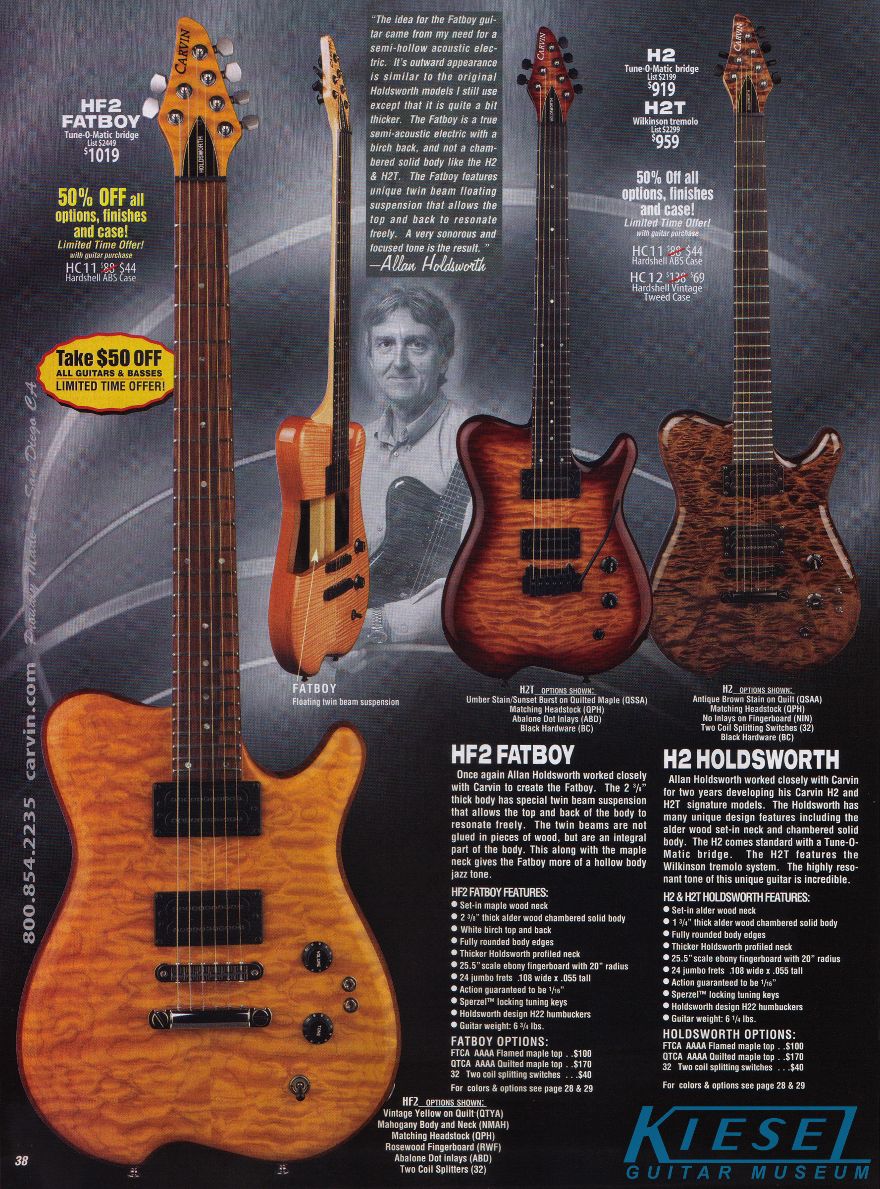 The Allan Holdsworth Signature H2 and HF2 Fatboy were unchanged for 2005. Prices increased by $40.00 on each model, but with the $50.00 off promotion, these were actually $10.00 less in 2005. And of course, the Holdsworth models benefited from the 50% off on all options and cases. The Winter catalog showed an HF2 Fatboy in Vintage Yellow on quilt with matching headstock, rosewood fingerboard with abalone dot inlays and coil splitters; an H2T in Umber Stain/Sunsetburst on quilted maple with matching headstock, abalone dot inlays and black chrome hardware; and an H2 in Antique Brown Stain on quilted maple with matching headstock, no inlays, and black hardware.