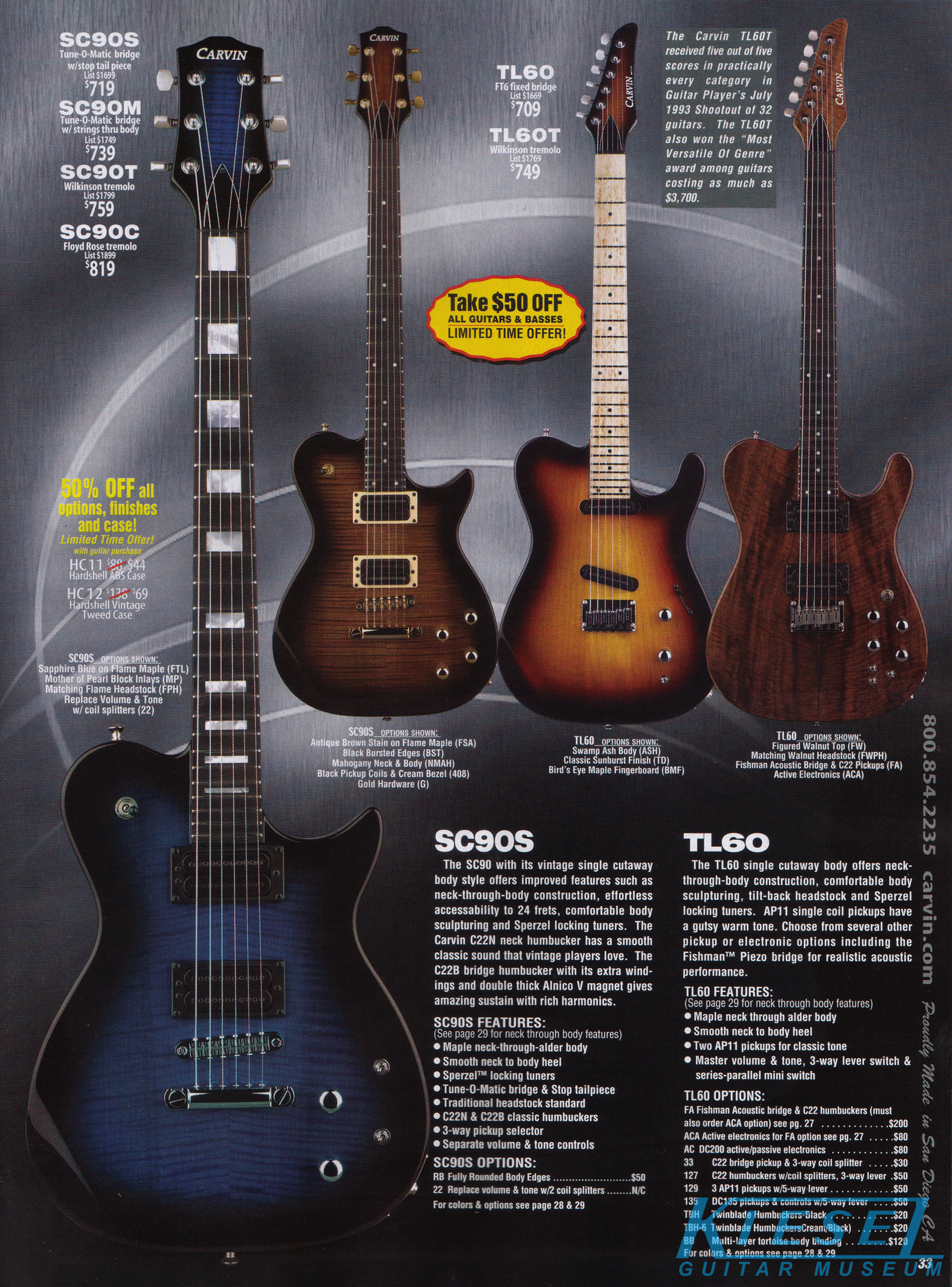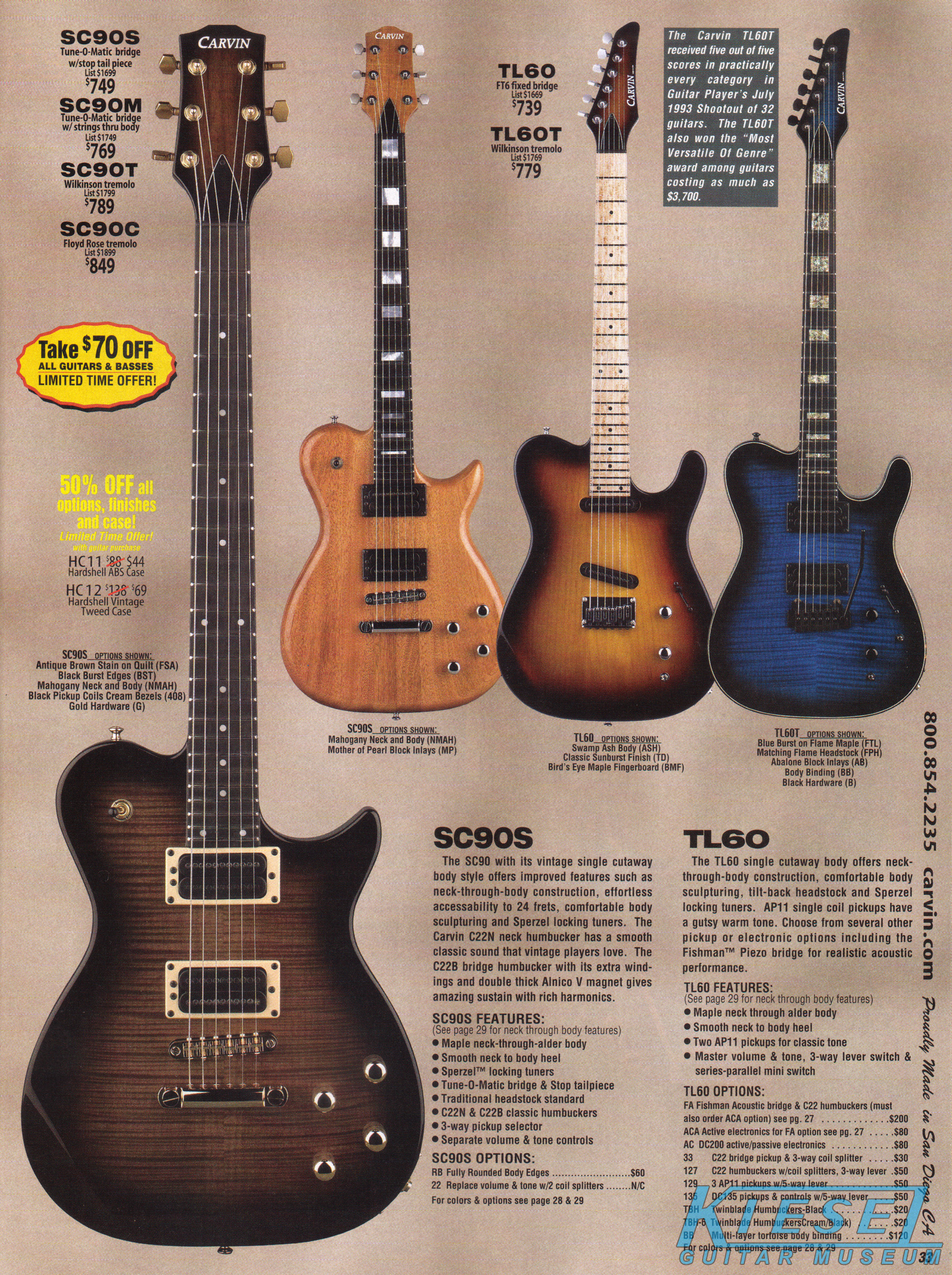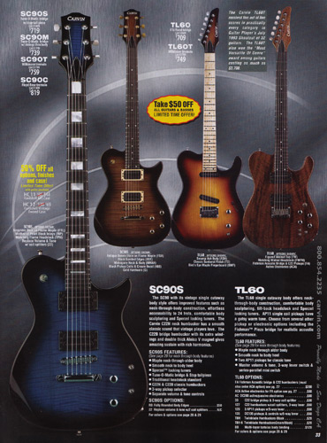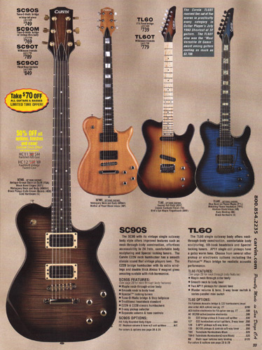 The SC90 and TL60 guitars were moved to the same page, had slight price increases, but were otherwise unchanged for early 2005. The catalog showed an SC90S in Sapphire Blue with blackburst edges on flamed maple with matching headstock, MOP block inlays and coli splitters; and an SC90S in Antique Brown with blackburst edges on flamed maple with matching headstock and gold hardware. Both SC90's were shown with non-rounded body edges, which was a little unusual - most SC90's shown in the catalogs over the years had optional rounded body sides. The Winter catalog also showed a TL60 in Classic Sunburst on swamp ash with matching headstock and Birdseye maple fingerboard; and a TL60 with figured walnut top and matching headstock and Fishman acoustic bridge with active electronics. The Summer catalog showed an SC90 in Antique Brown on flamed maple with blackburst edges, non-rounded body sides and gold hardware; an SC90 in clear gloss on mahogany with abalone block inlays and chrome hardware; the same TL60 in Classic Sunburst on swamp ash with matching headstock and Birdseye maple fingerboard as the Spring edition; and a TL60T in Blueburst on flamed maple with blackburst edges, black hardware, abalone block inlays and Wilkinson tremolo.