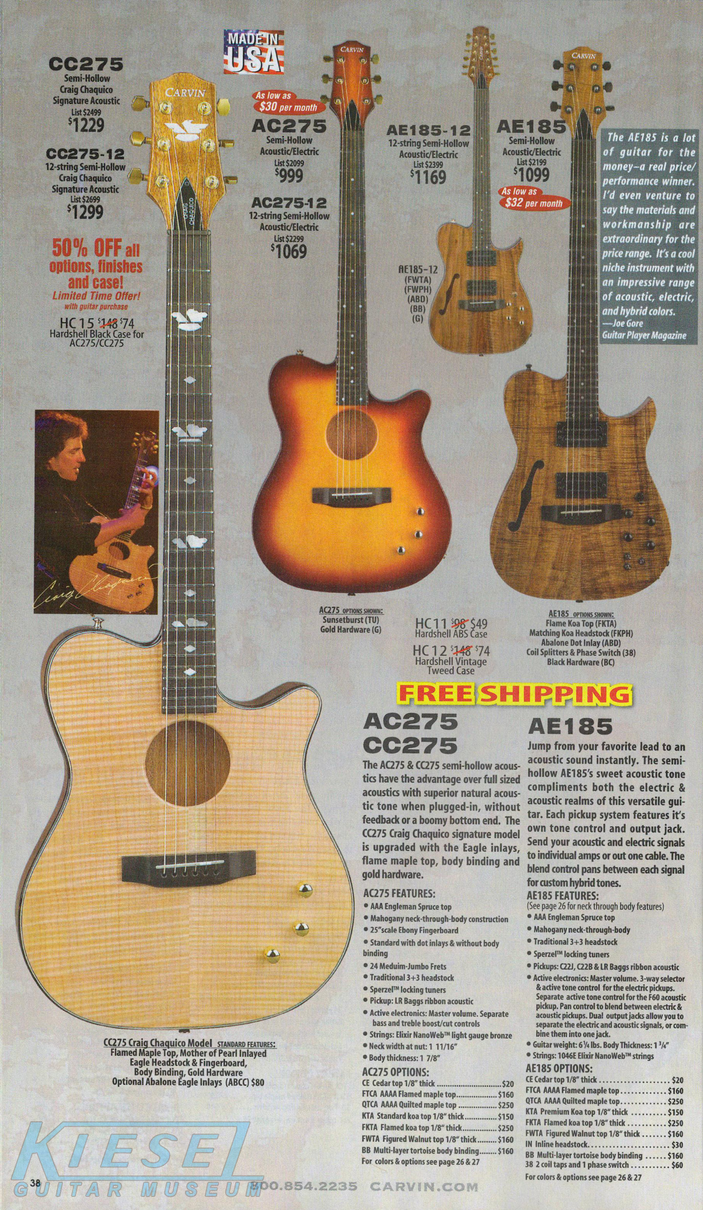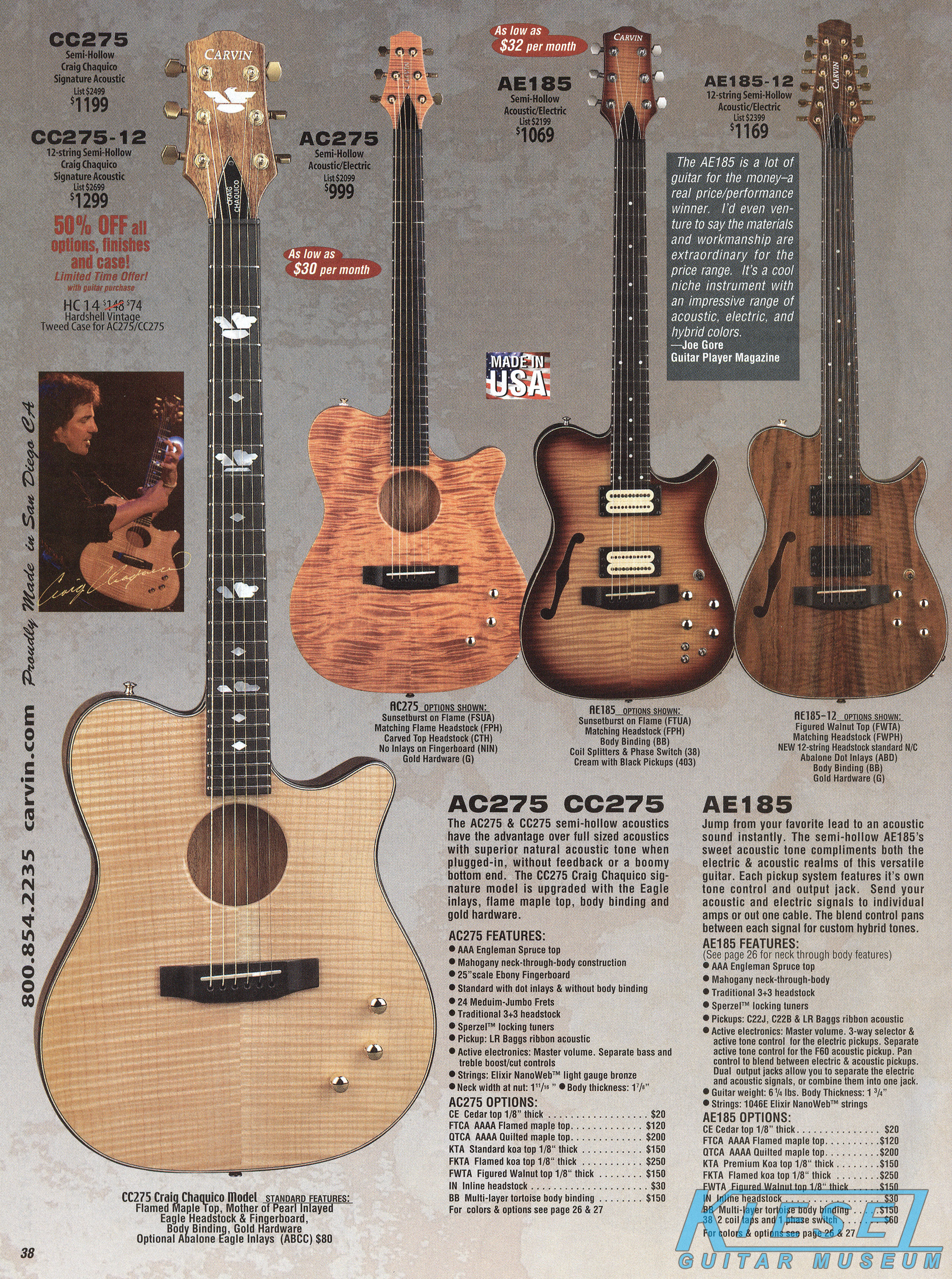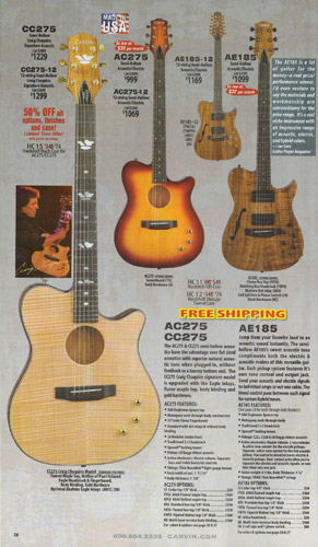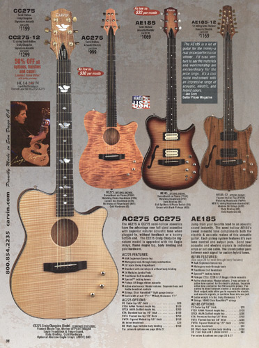 Because catalog space was needed for the new NS1 and V220/Ultra V reissues, Carvin's acoustic/electric models were condensed to a single page. All the models from 2006 were still offered, but only some were shown in the catalog. Other than the new 12-string headstock on the AE185-12 and AC275-12, there were no changes to the lineup.