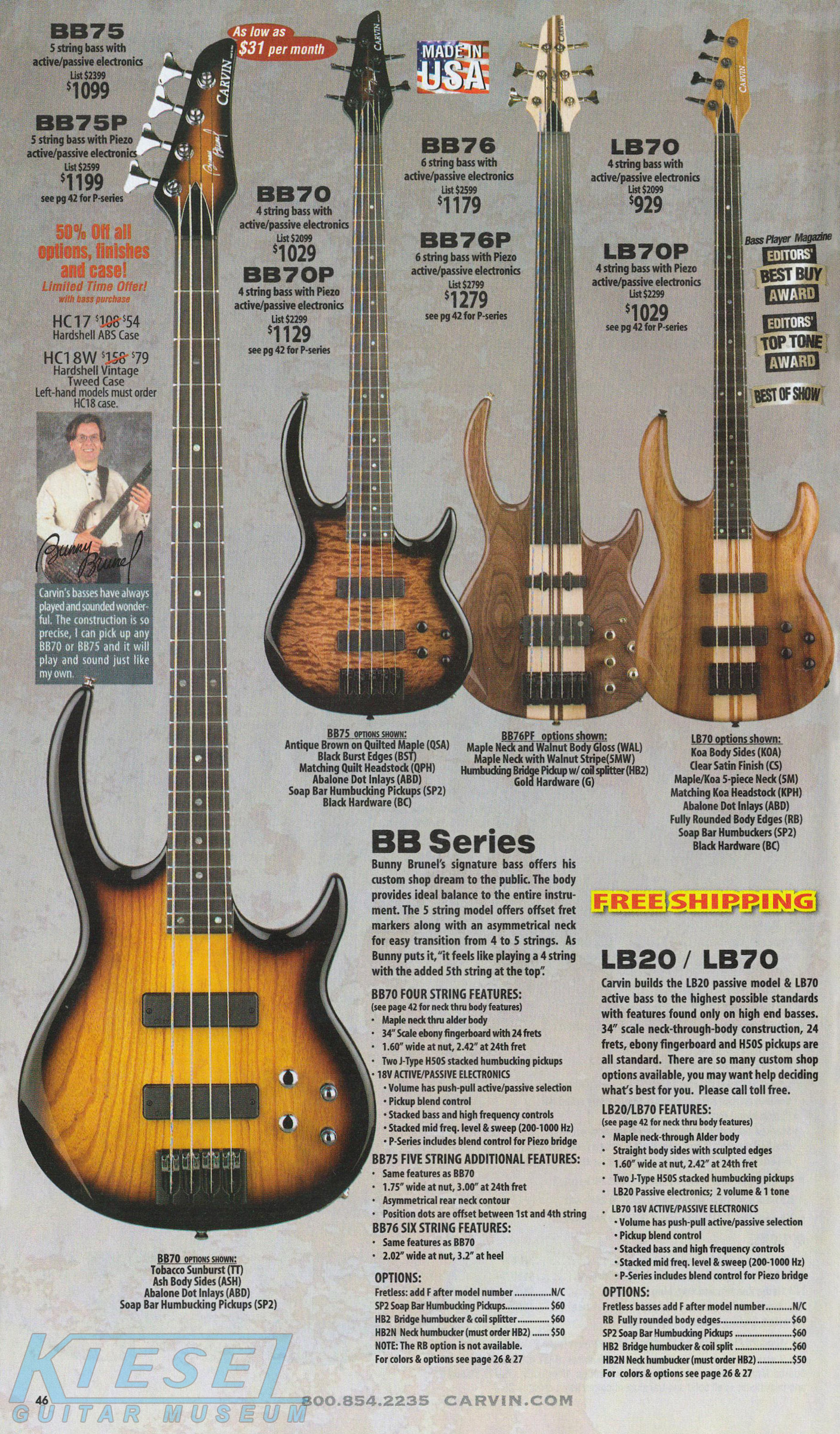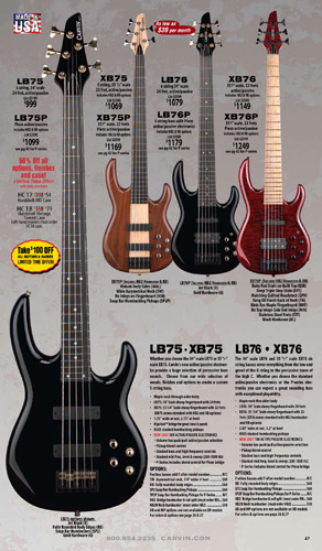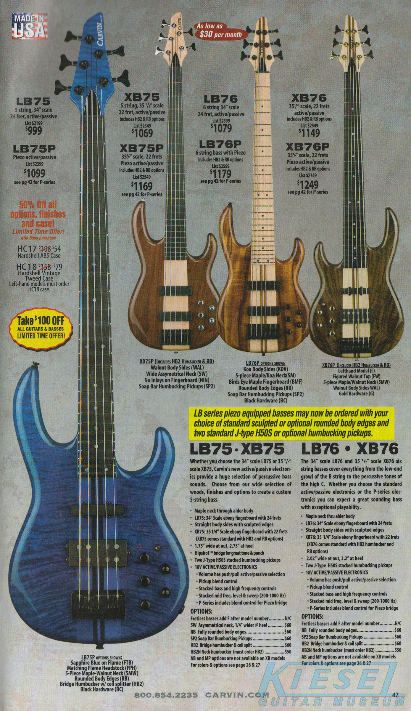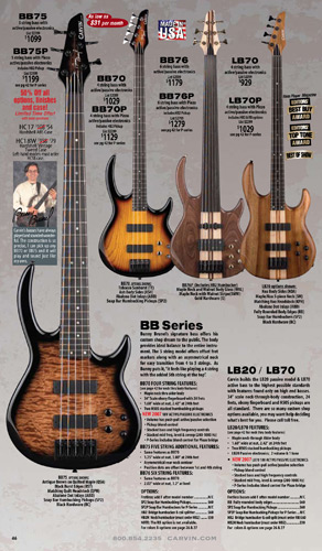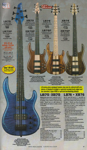 The LB Series basses, which included the extended-scale XB Series 5 and 6-string models and the Timothy B. Schmit Signature TBS4, were also unchanged from the previous year, but the TBS4 was no longer shown in the catalog.