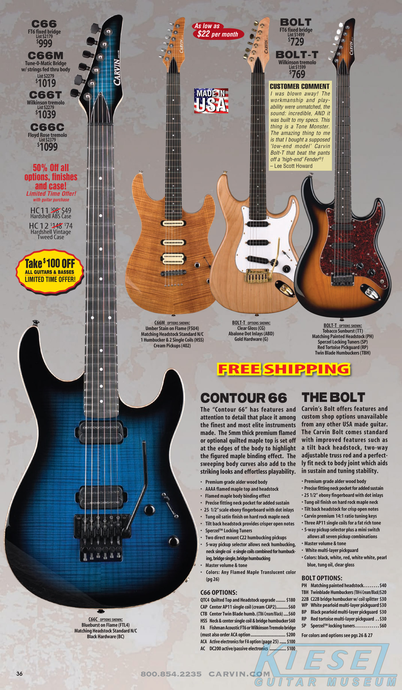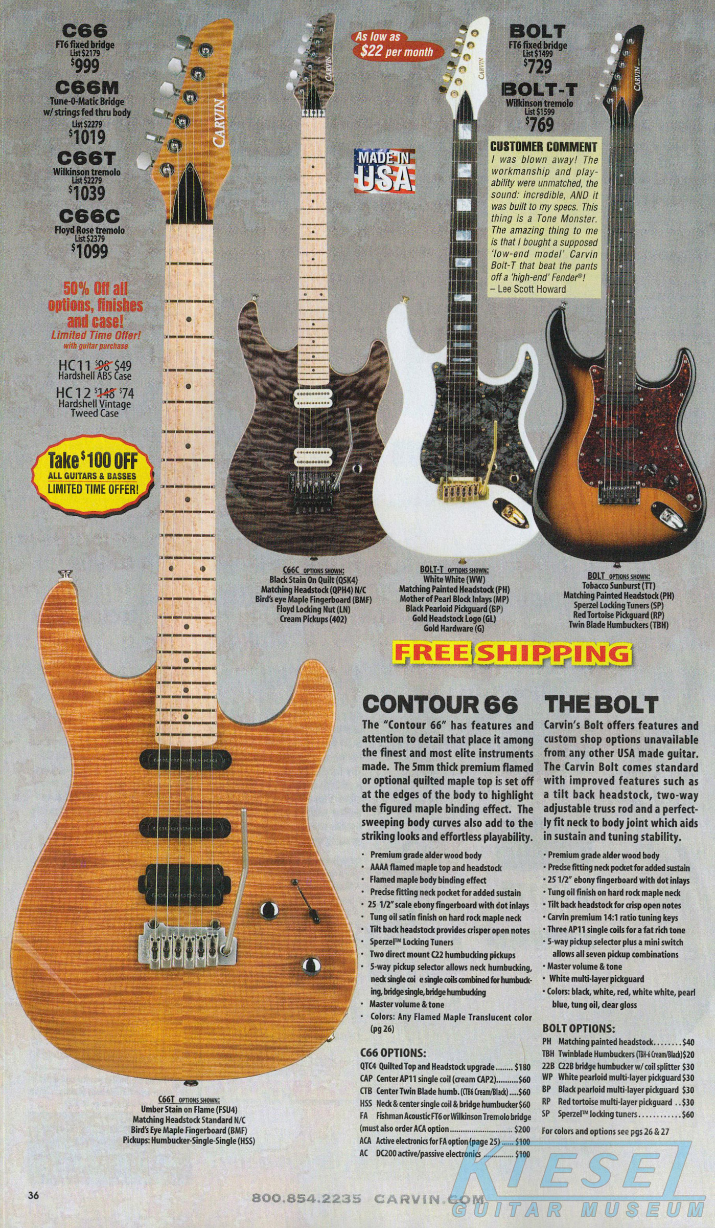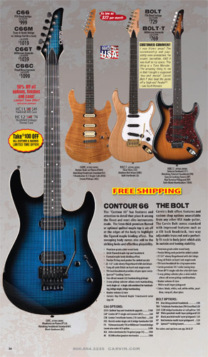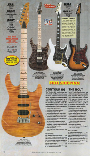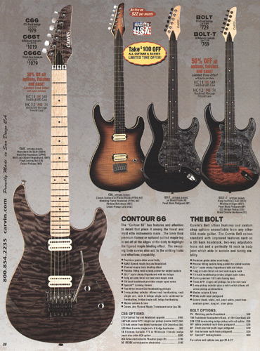 The popular Contour C66 did get a much-requested upgrade in 2007 - the addition of a SSH pickup configuration (single coil pickups in the neck and middle positions, and a humbucker in the bridge position). Also added was the M Series bridge, which had proven quite popular on other Carvin models. The Bolt/Bolt-T models were unchanged, and although not pictured, the Bolt Plus was still available.