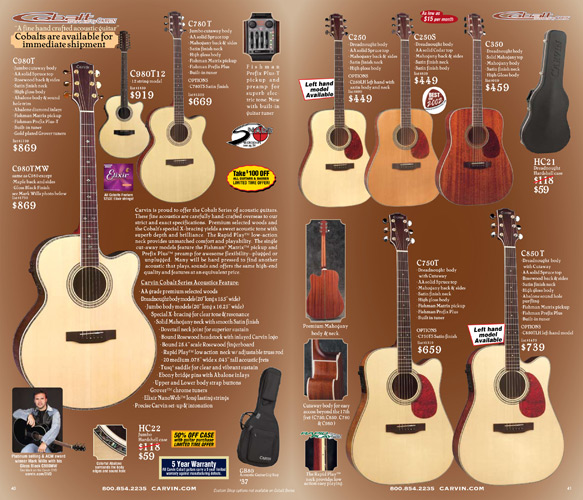 Carvin's import series Cobalt guitars remained popular, and were offered in 8 different models, with no customization available. These were available in jumbo, dreadnaught, and single-cutaway dreadnaught styles, ranging in price from $449 to $919.
