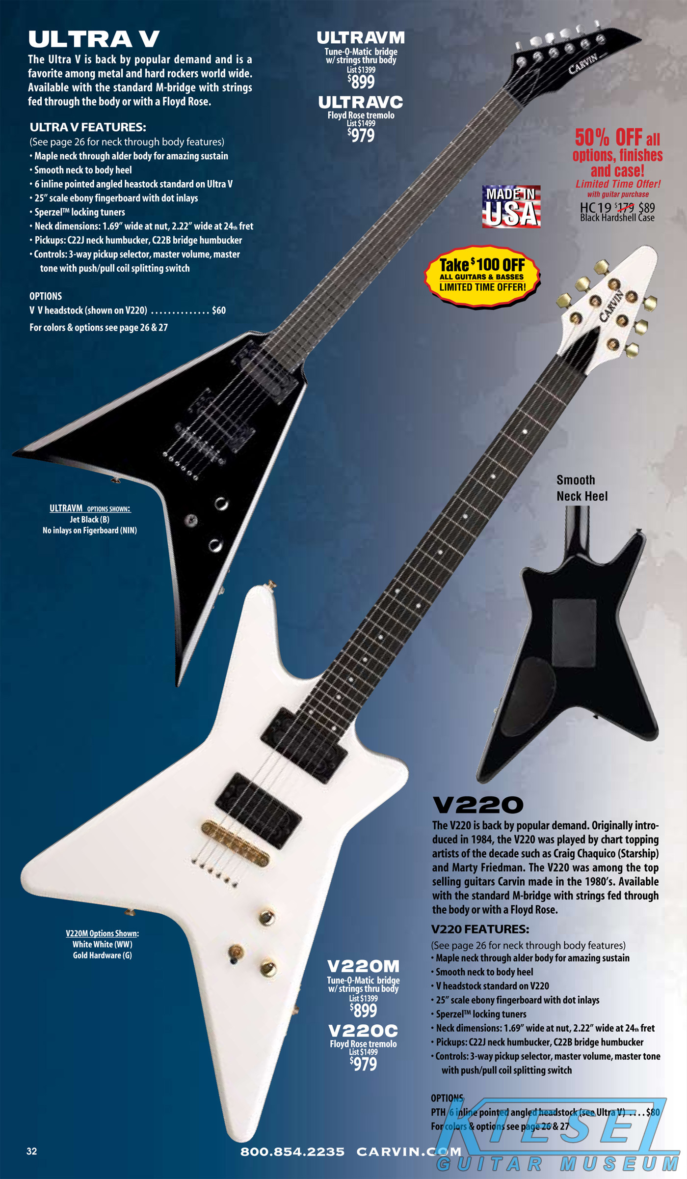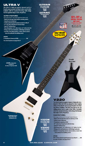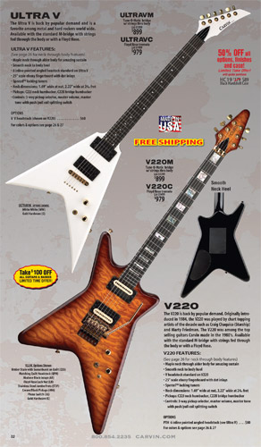 selection of colors, woods, pickups and other options. The standard configuration of the V220 was alder body sides, a neck-through