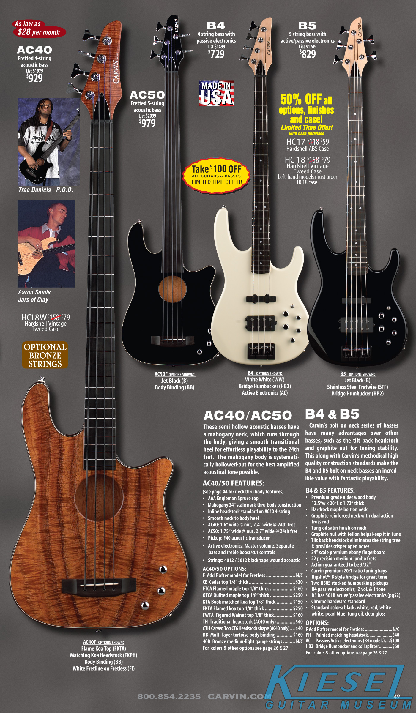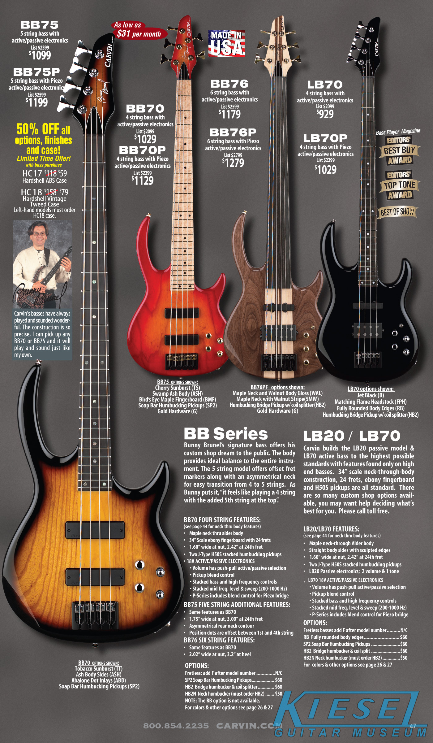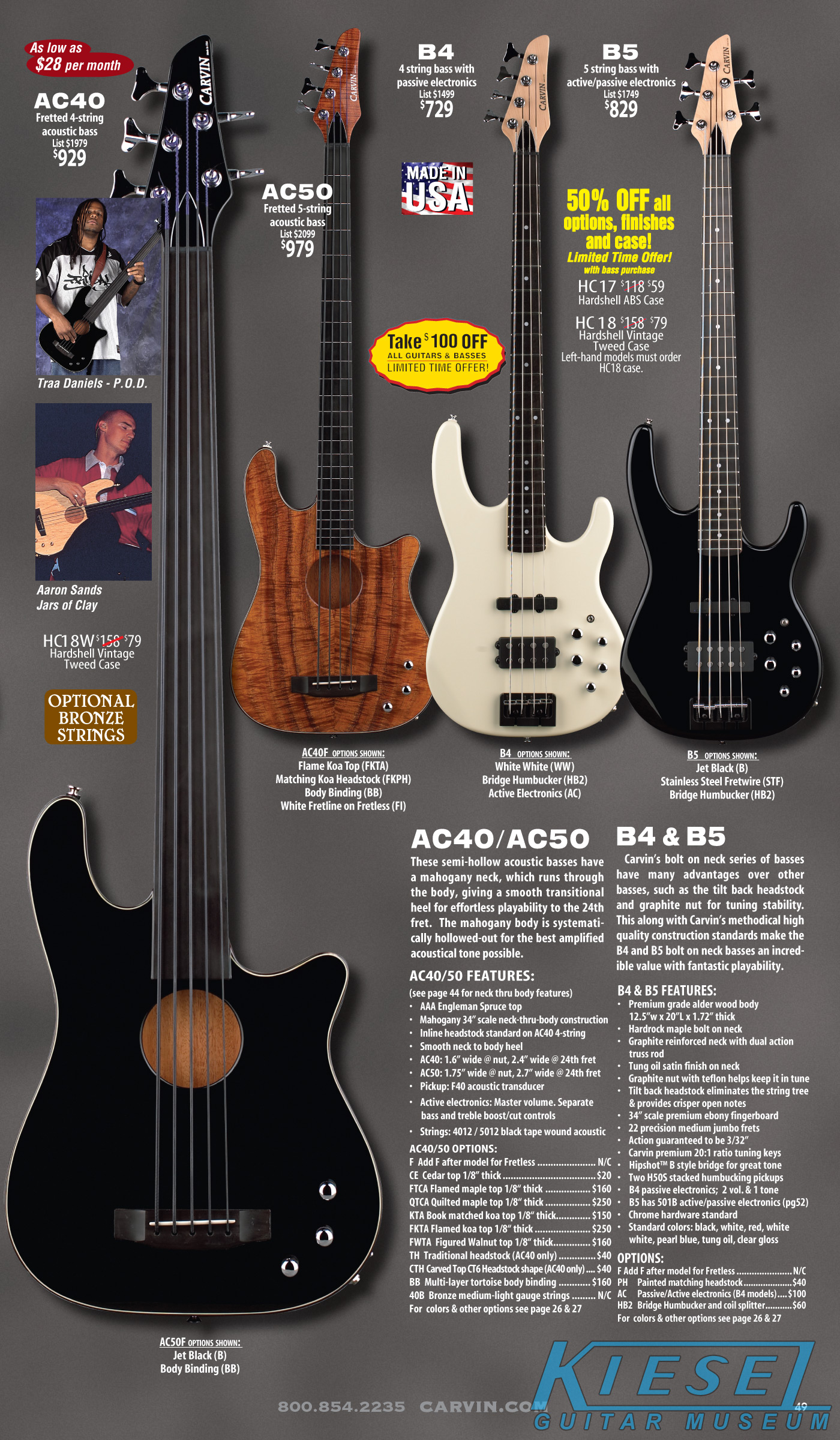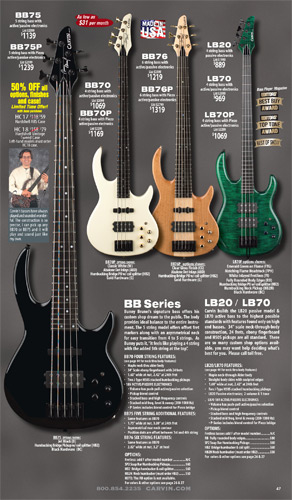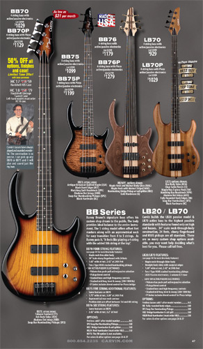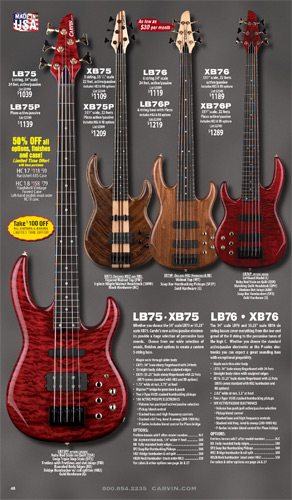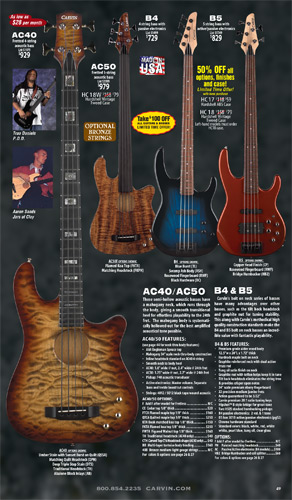 With the exception of Carvin's constant evolution of finishes, and to a lesser extent, woods, everything in the bass department remained exactly the same as 2007. The Icon Series was in its 3rd year, and gained in popularity. The LB and extended-scale XB basses anchored the lineup, while the long-running Bunny Brunel Signature basses were also still popular. Carvin's acoustic-electric AC40 and AC50 continued to offer a lightweight alternative for bassists, and for bassists that wanted a more upright tone in a conventional instrument.
