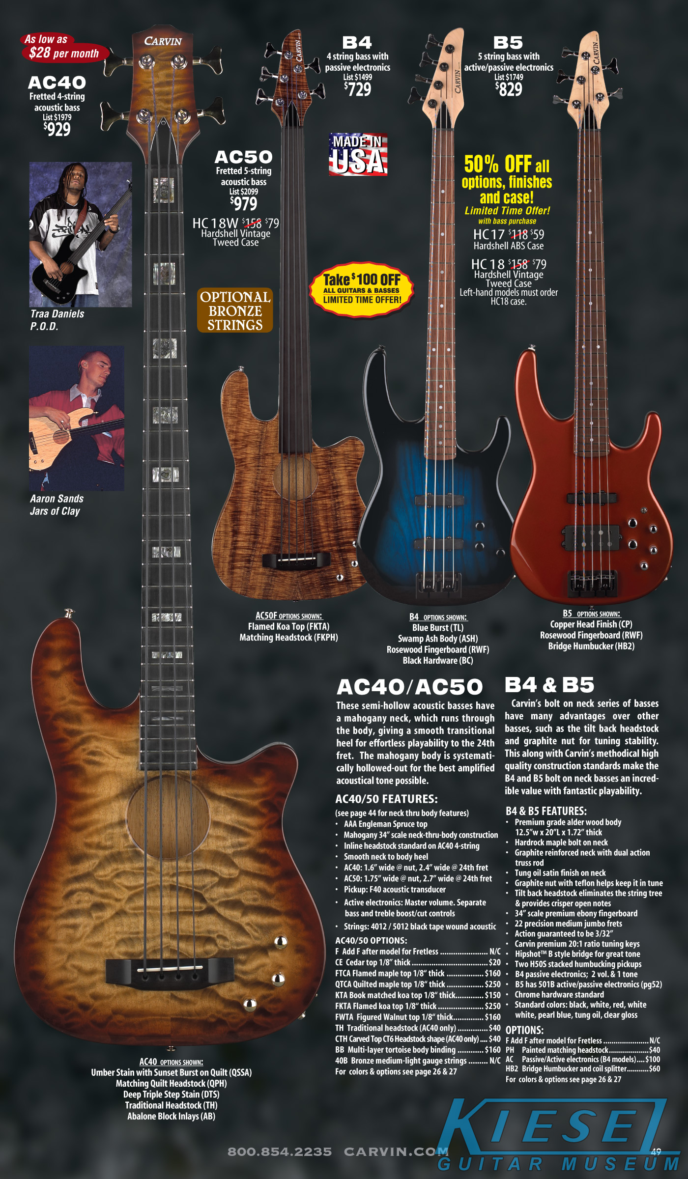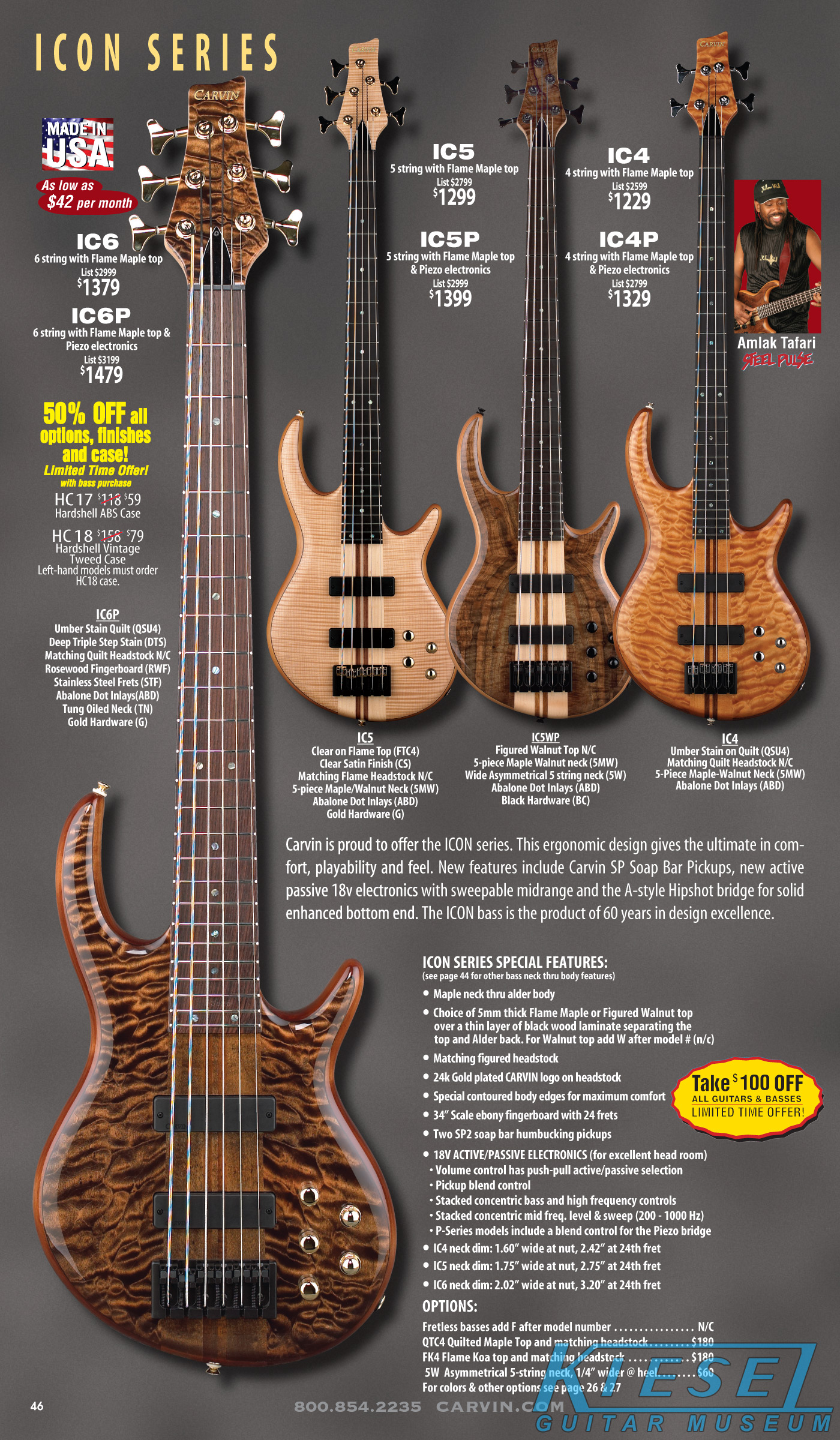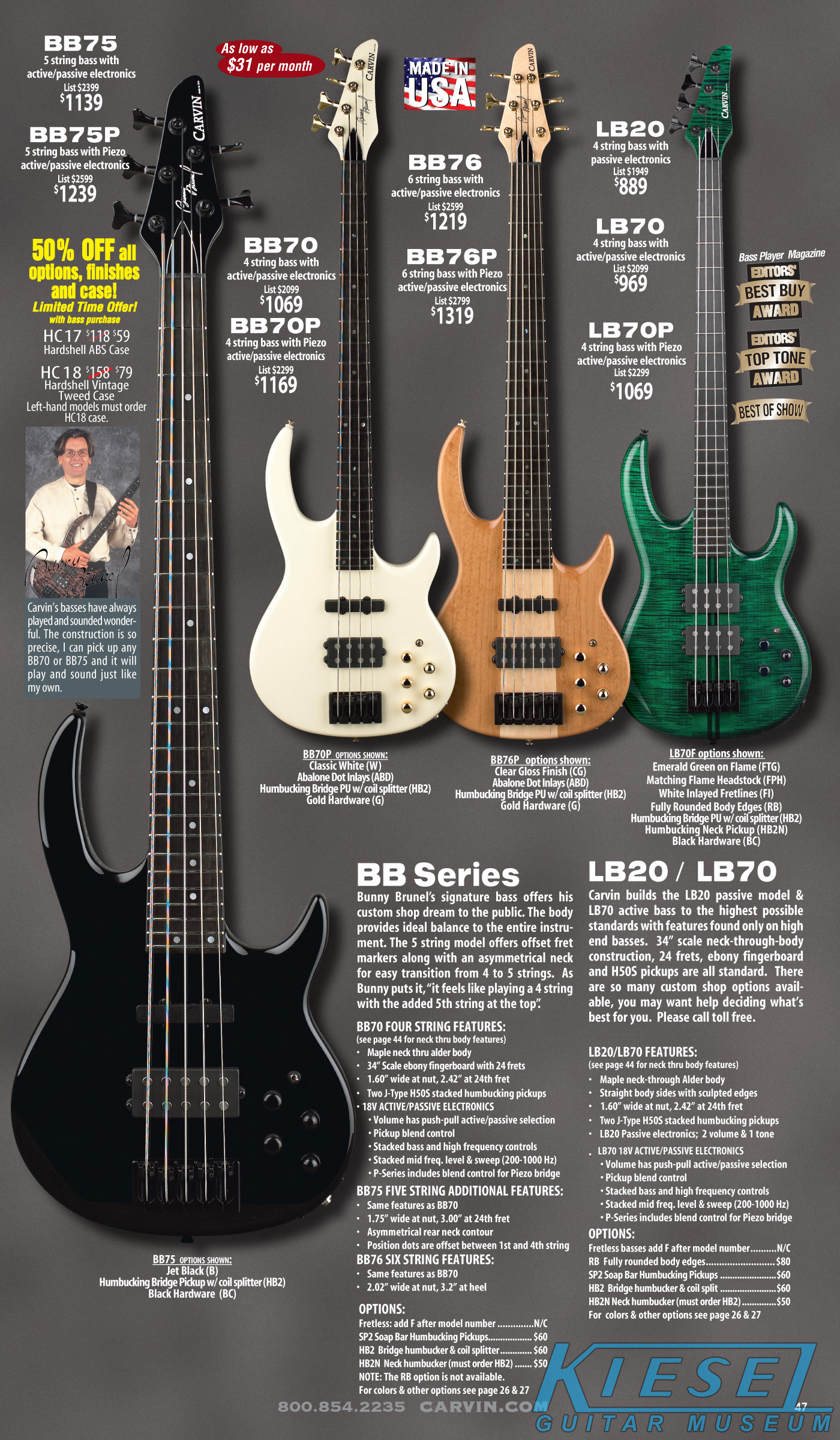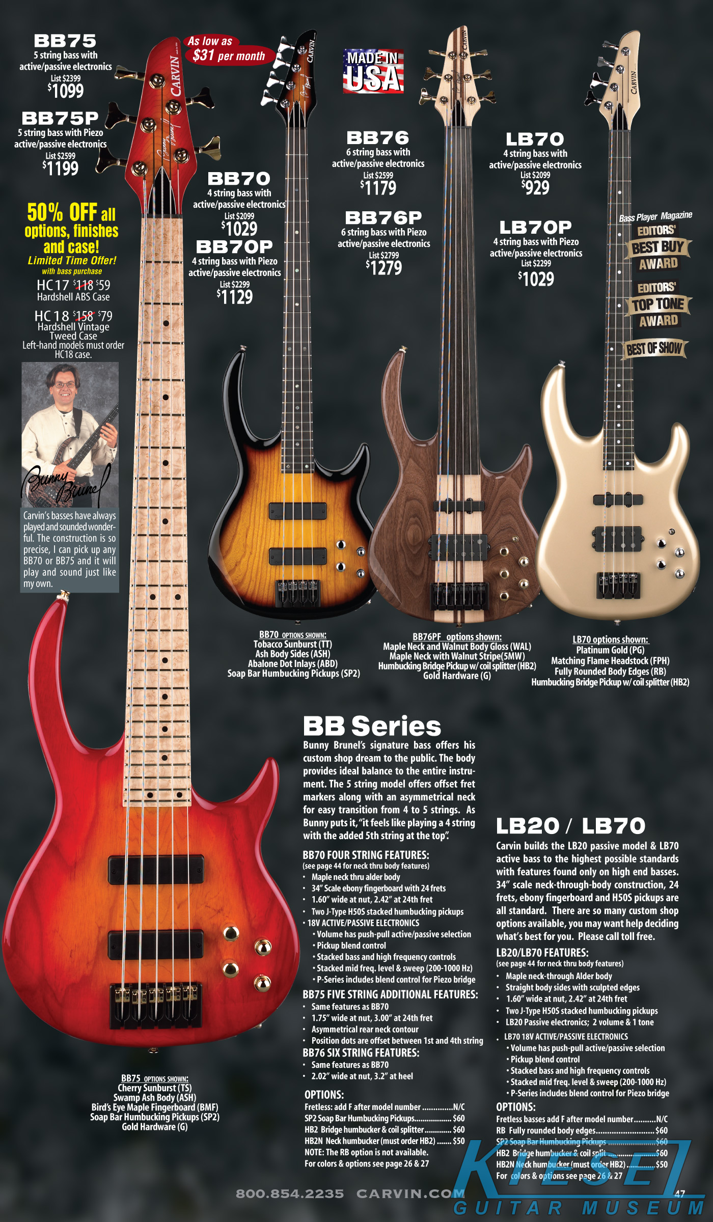 With the exception of Carvin's constant evolution of finishes, and to a lesser extent, woods, everything in the bass department remained exactly the same as 2007. The Icon Series was in its 3rd year, and gained in popularity. The LB and extended-scale XB basses anchored the lineup, while the long-running Bunny Brunel Signature basses were also still popular. Carvin's acoustic-electric AC40 and AC50 continued to offer a lightweight alternative for bassists, and for bassists that wanted a more upright tone in a conventional instrument.
