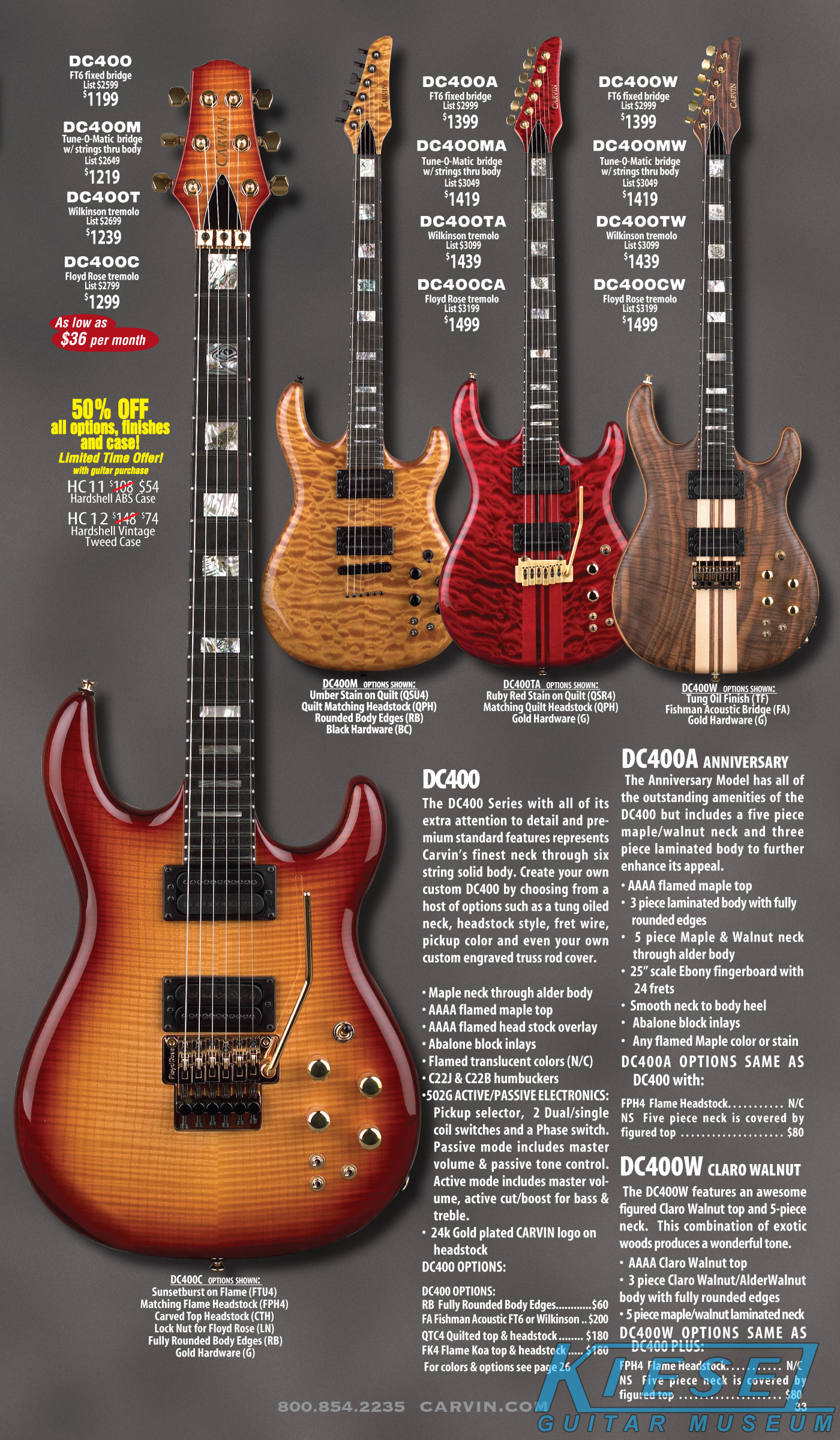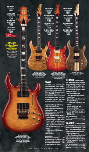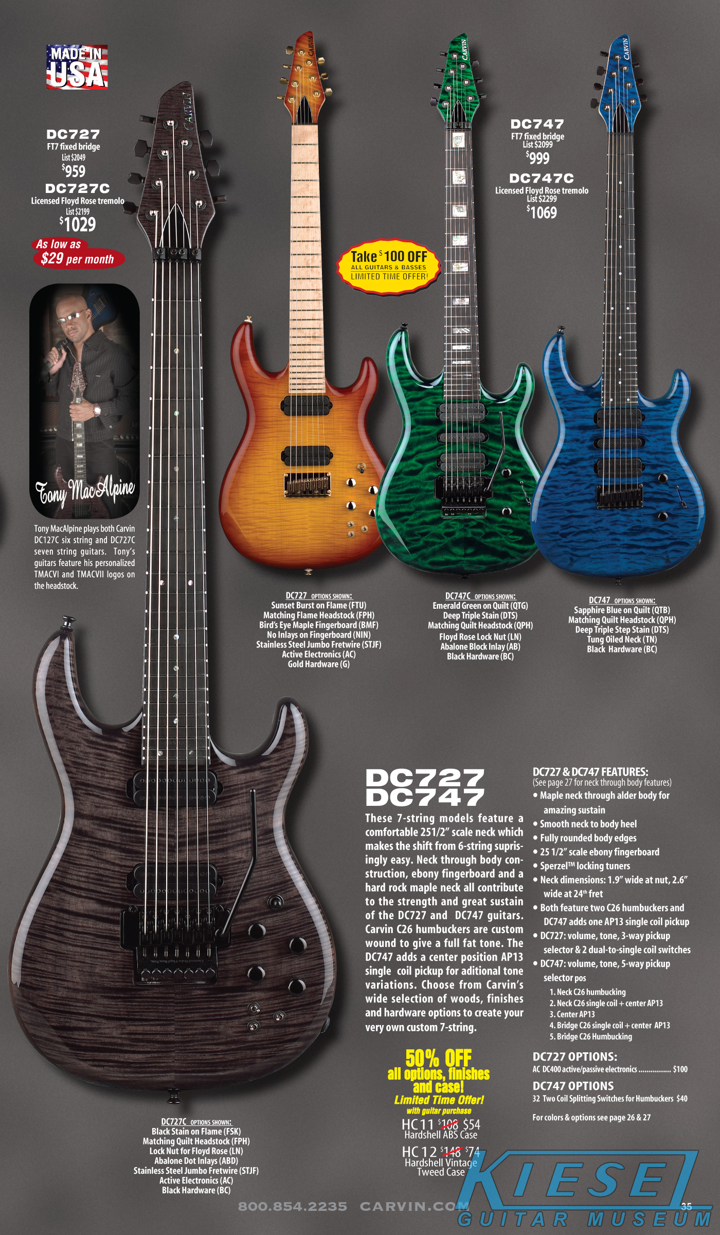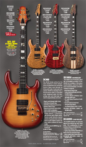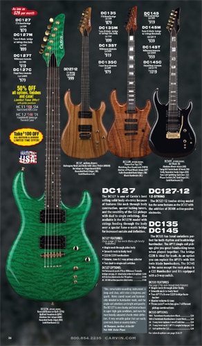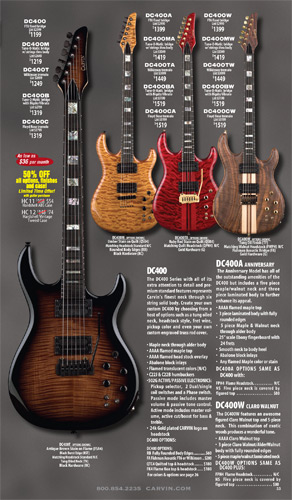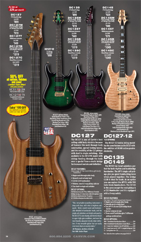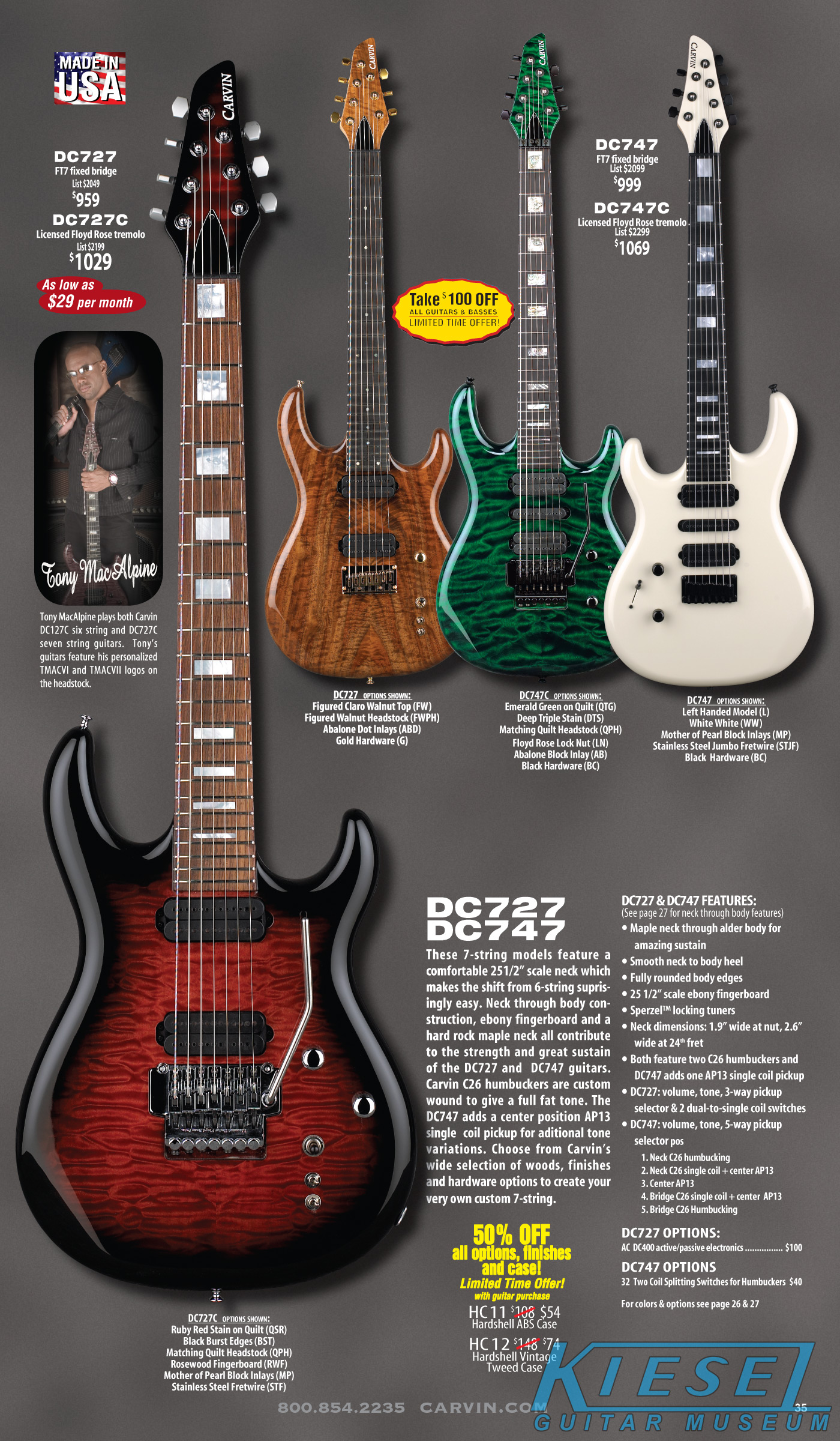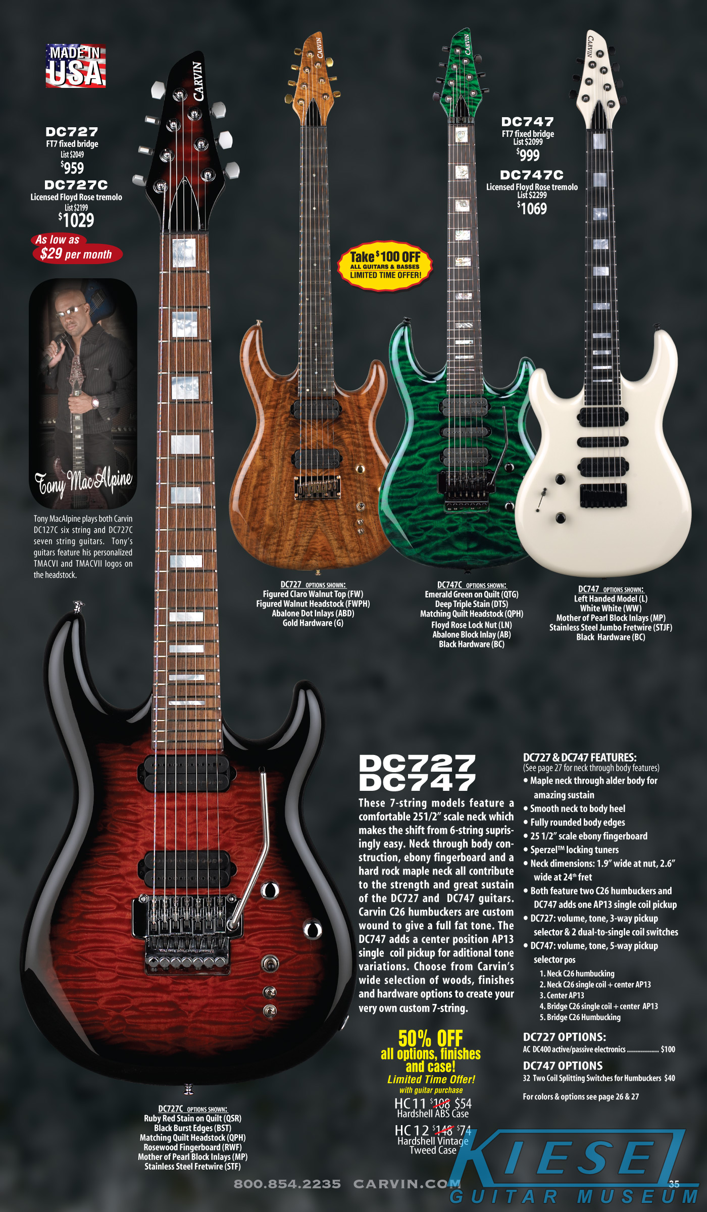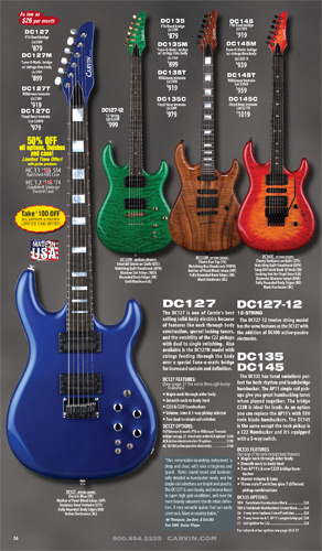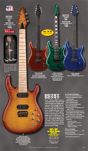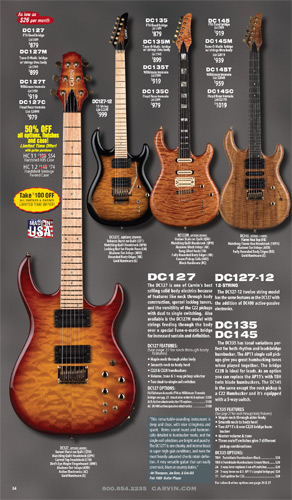 All of the DC models - the DC127, DC135, DC145, DC400 and the DC400A/W were unchanged from 2007. Carvin's 7-string DC models, the DC727 and 3-pickup DC747 were unchanged. There was still a brief mention of Tony MacAlpine's TMAC VI and TMAC VII versions, but no pricing information was offered. As in previous years, the 7-string DC models were only available with an FT7 hardtail bridge or licensed Floyd Rose tremolo.