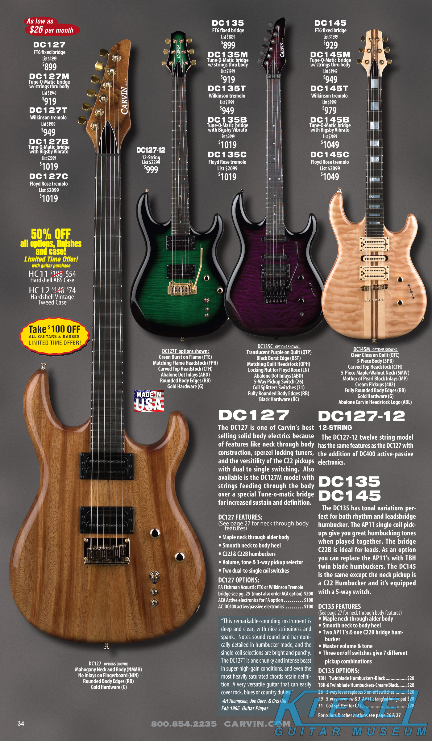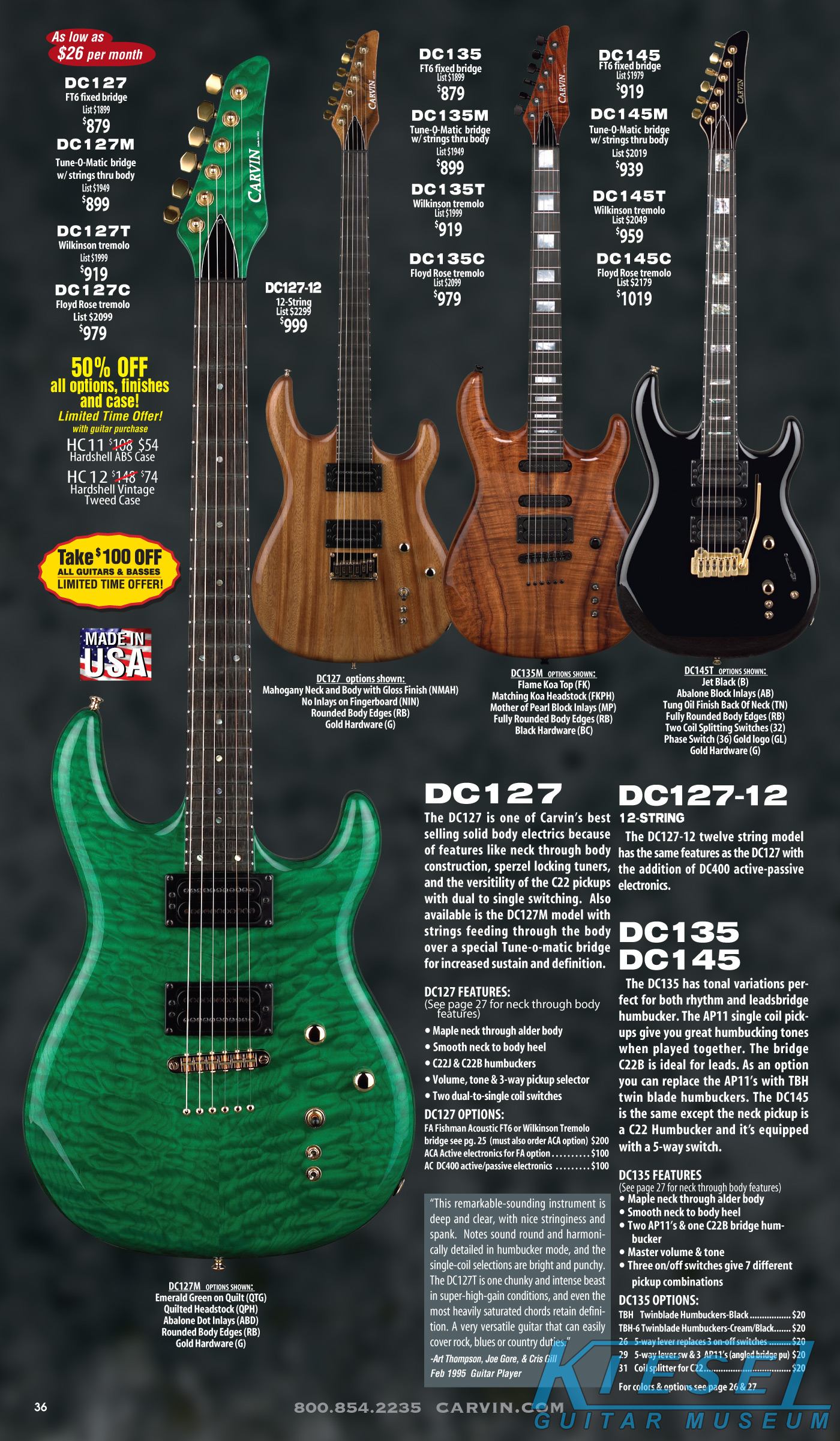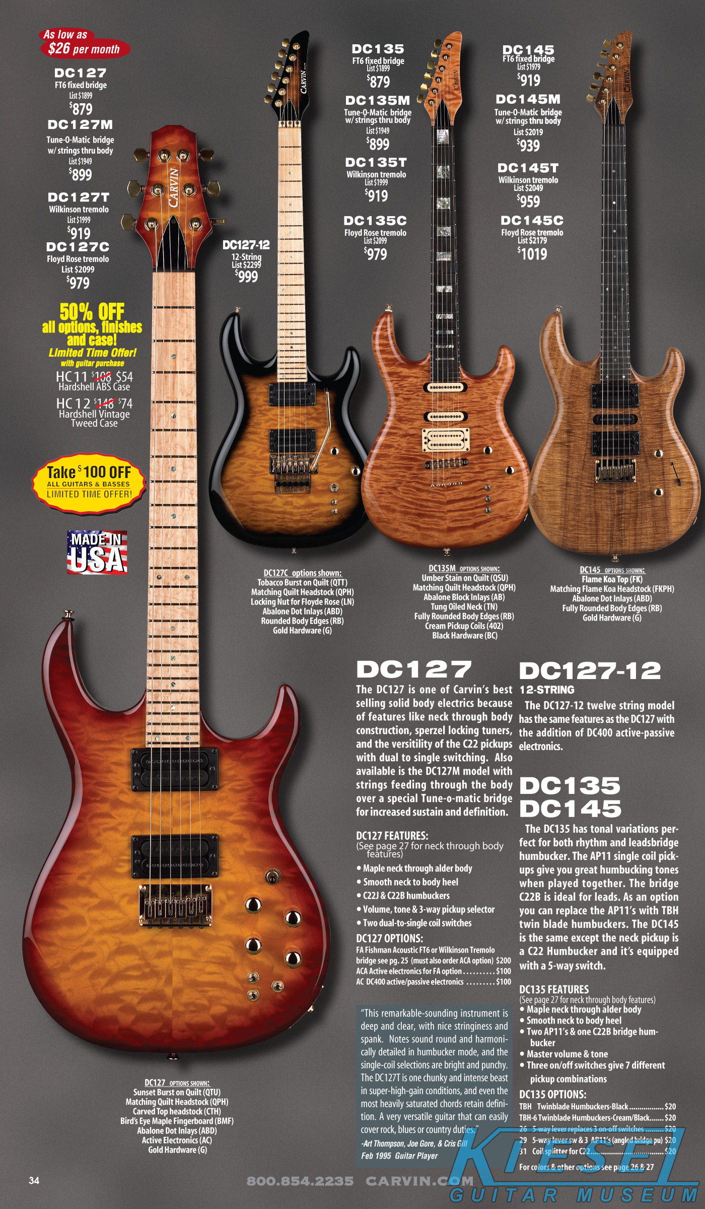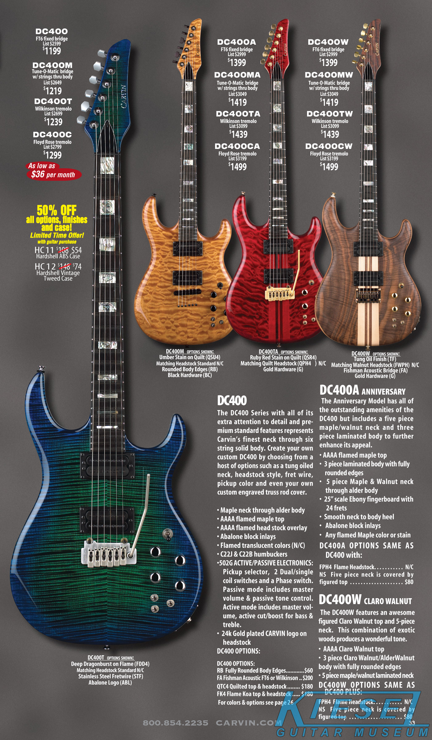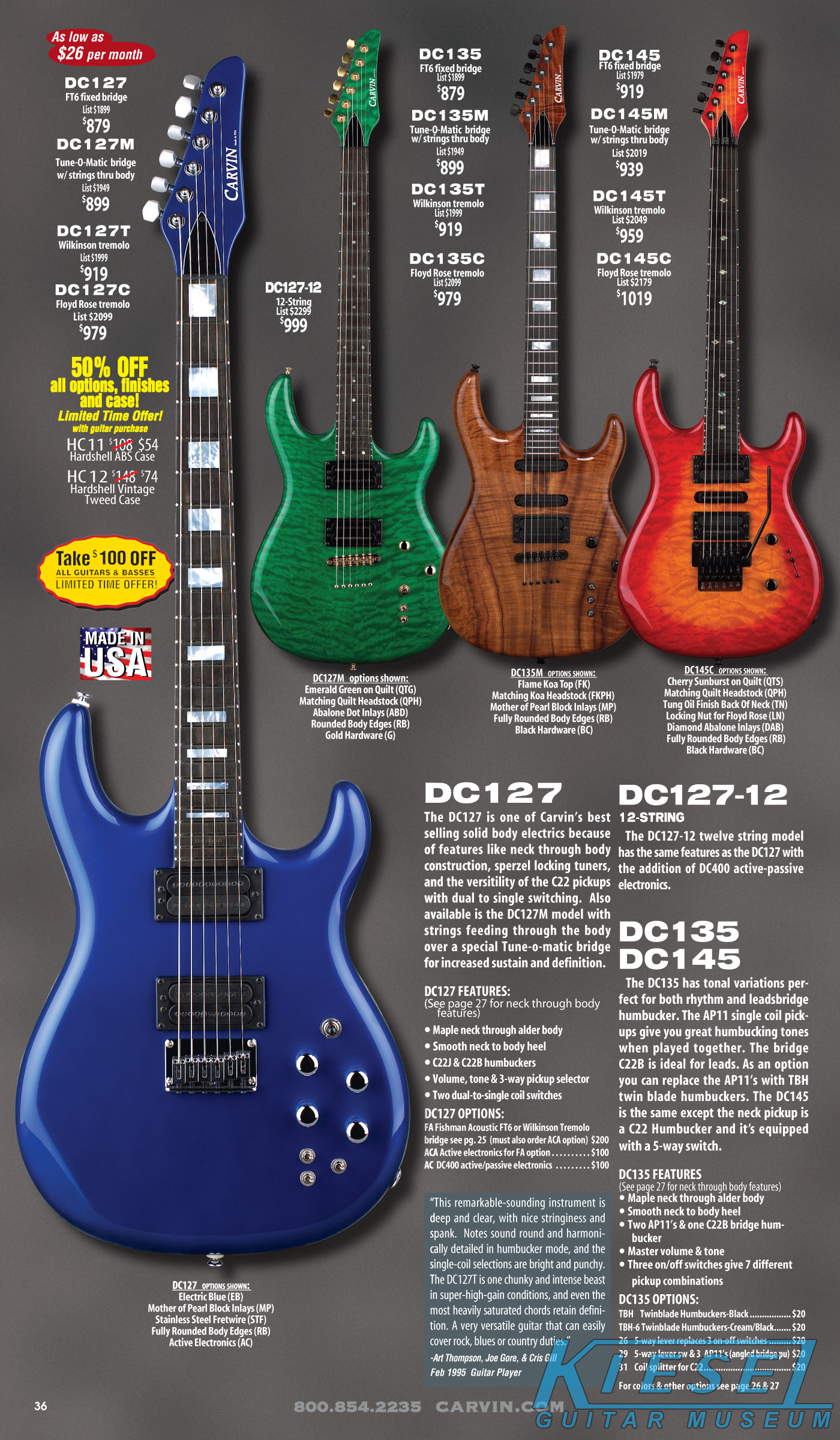 All of the DC models - the DC127, DC135, DC145, DC400 and the DC400A/W were unchanged from 2007. Carvin's 7-string DC models, the DC727 and 3-pickup DC747 were unchanged. There was still a brief mention of Tony MacAlpine's TMAC VI and TMAC VII versions, but no pricing information was offered. As in previous years, the 7-string DC models were only available with an FT7 hardtail bridge or licensed Floyd Rose tremolo.