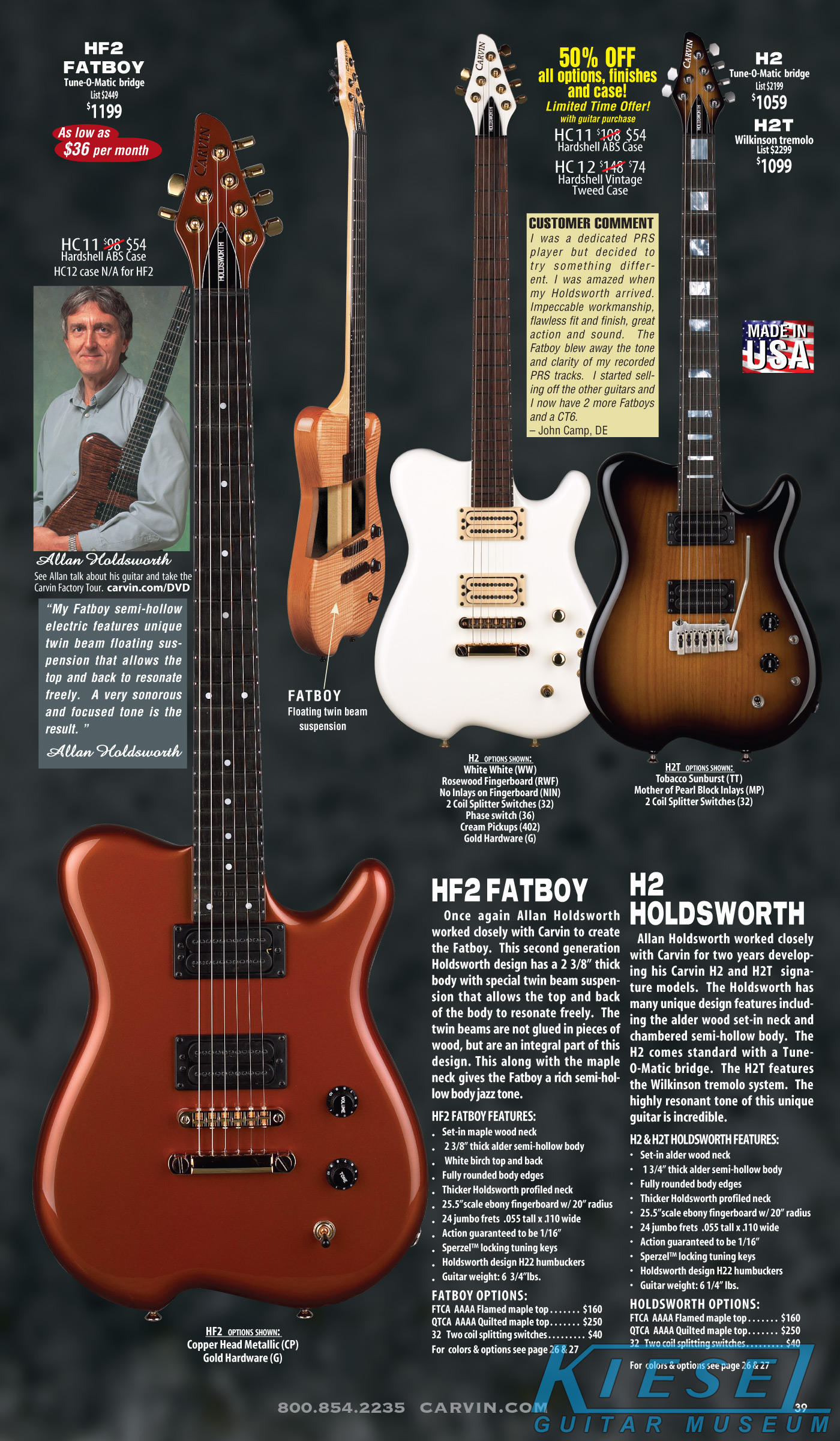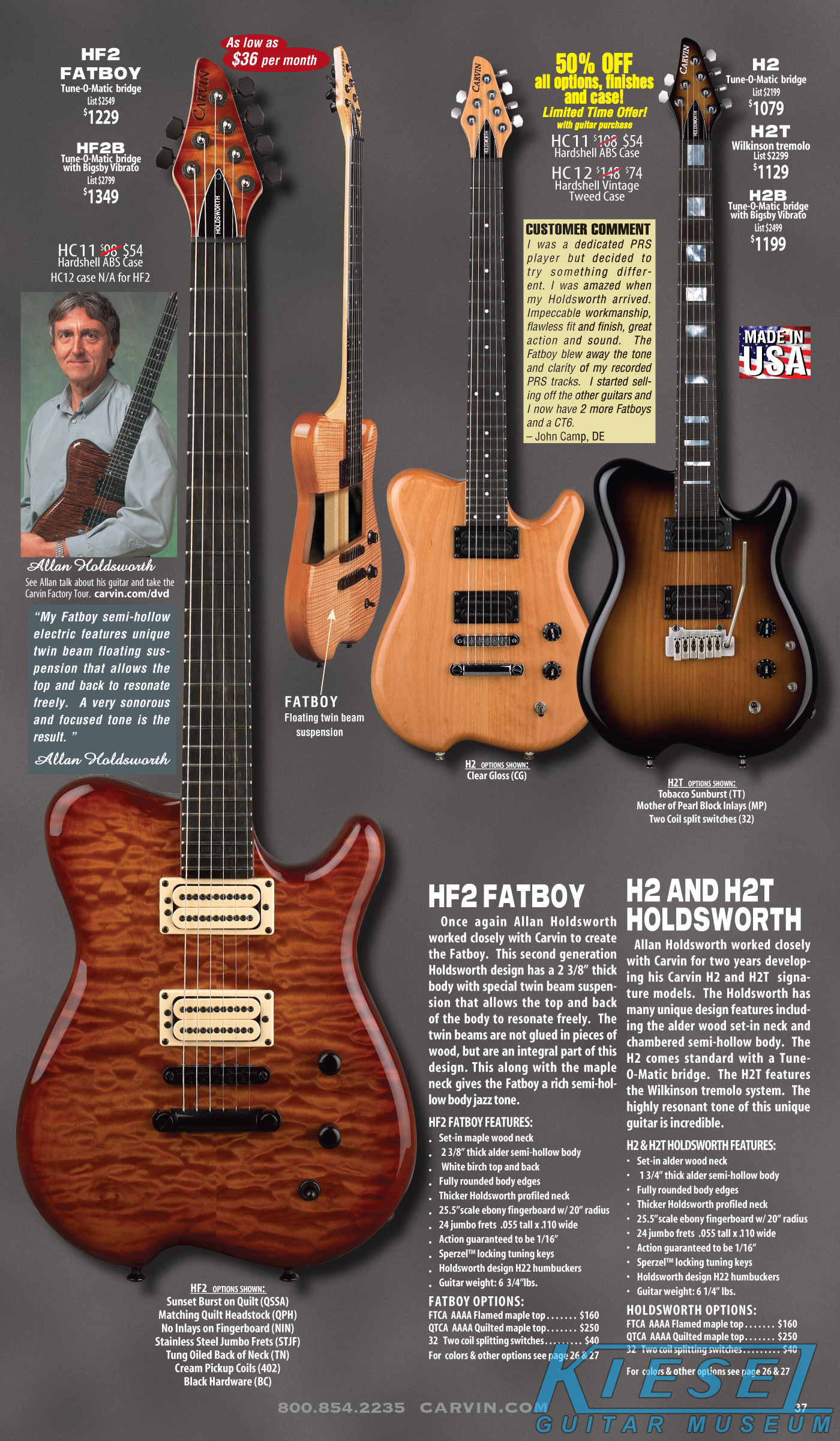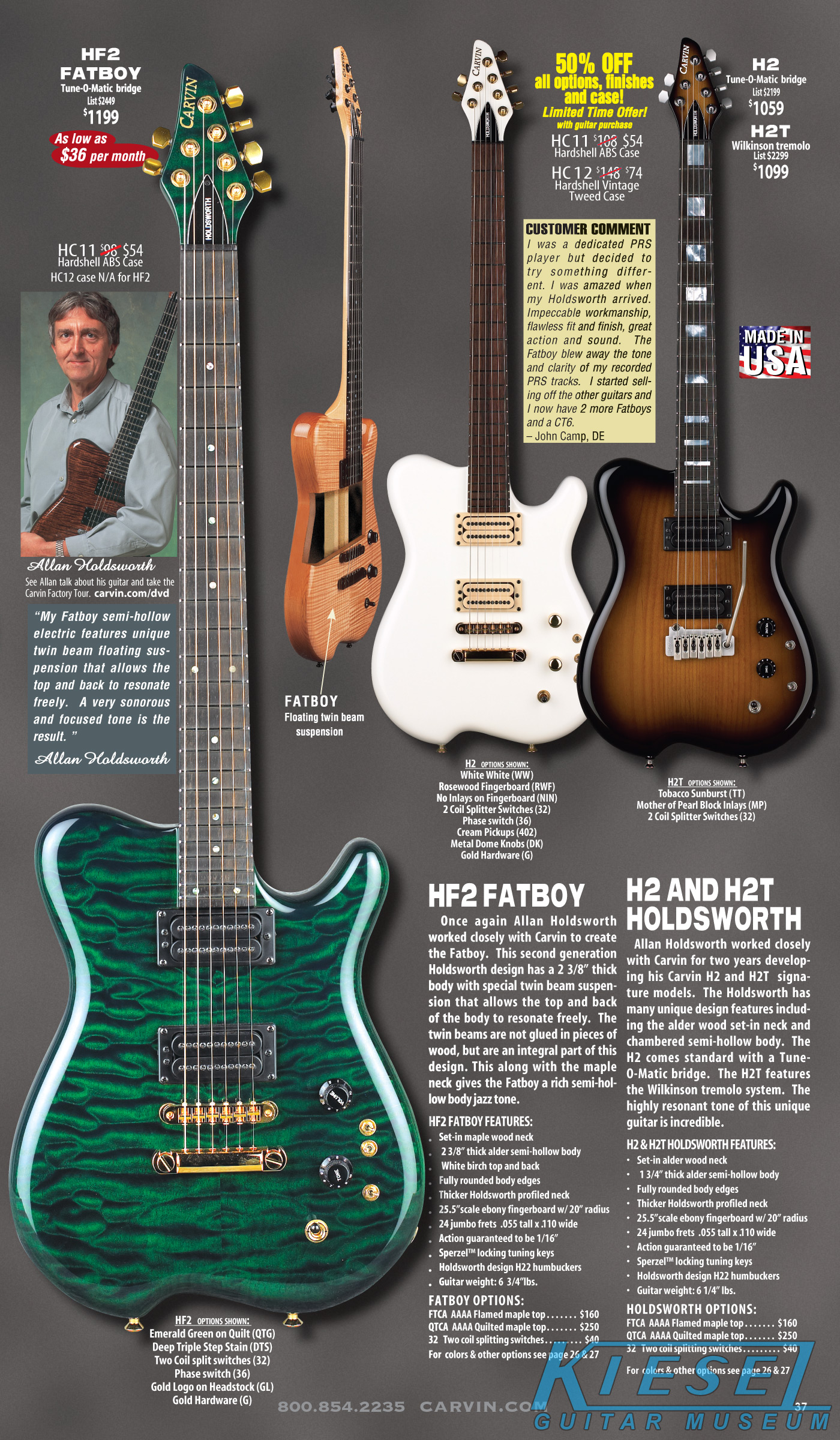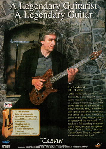 The Allan Holdsworth Signature models, the HF2 Fatboy and H2, were unchanged for 2008. The ad in the Gallery above shows Alan Holdsworth with an antique brown stain on flamed maple HF1 (single pickup) Fatboy. This ad appeared in the April 2008 issue of Guitar Player.