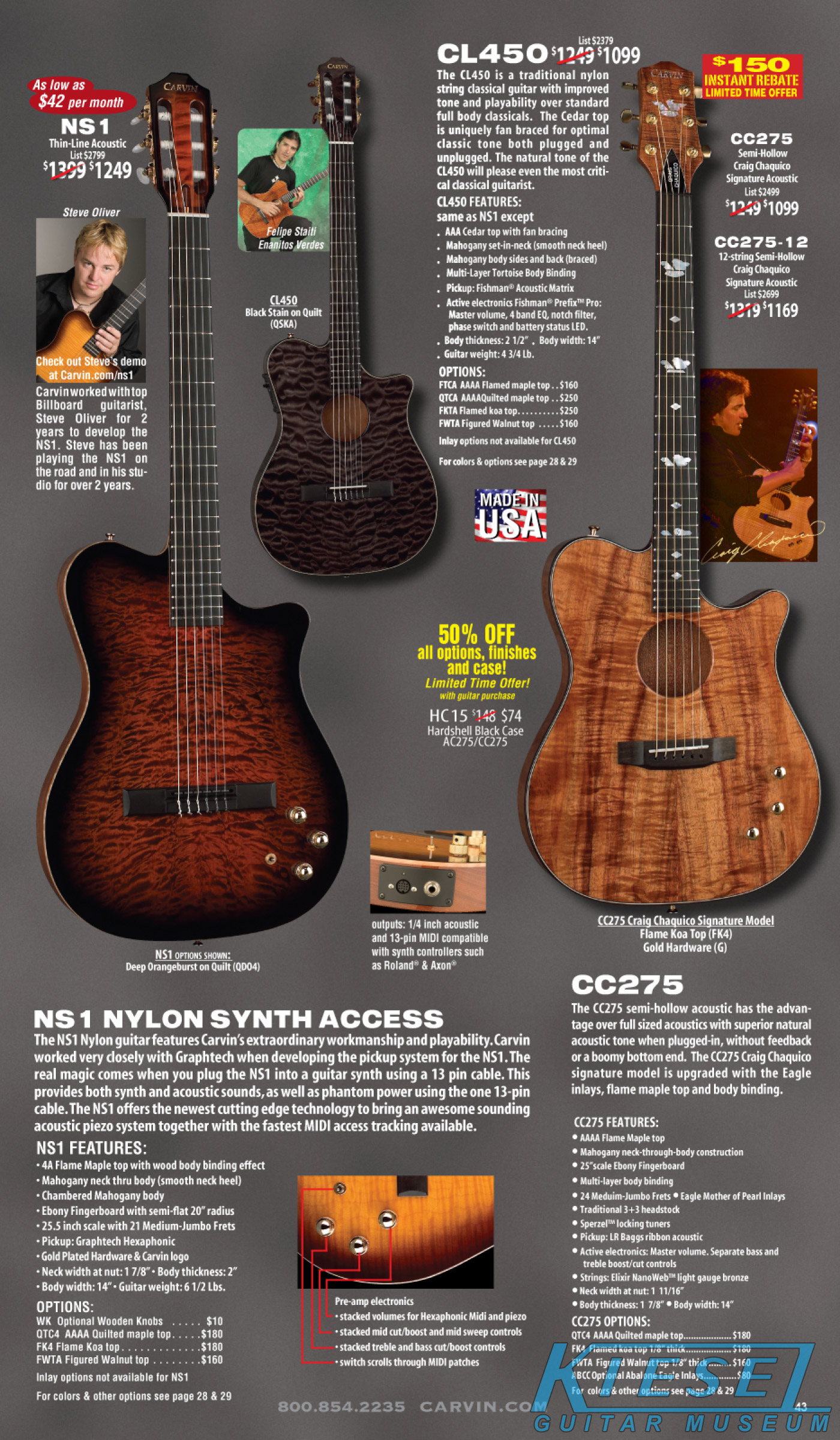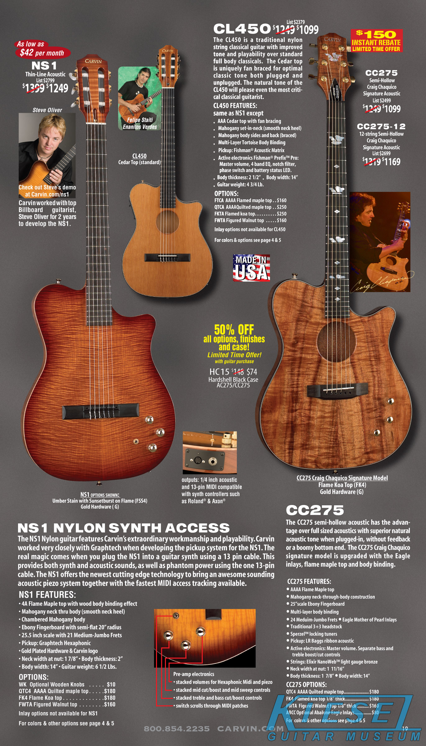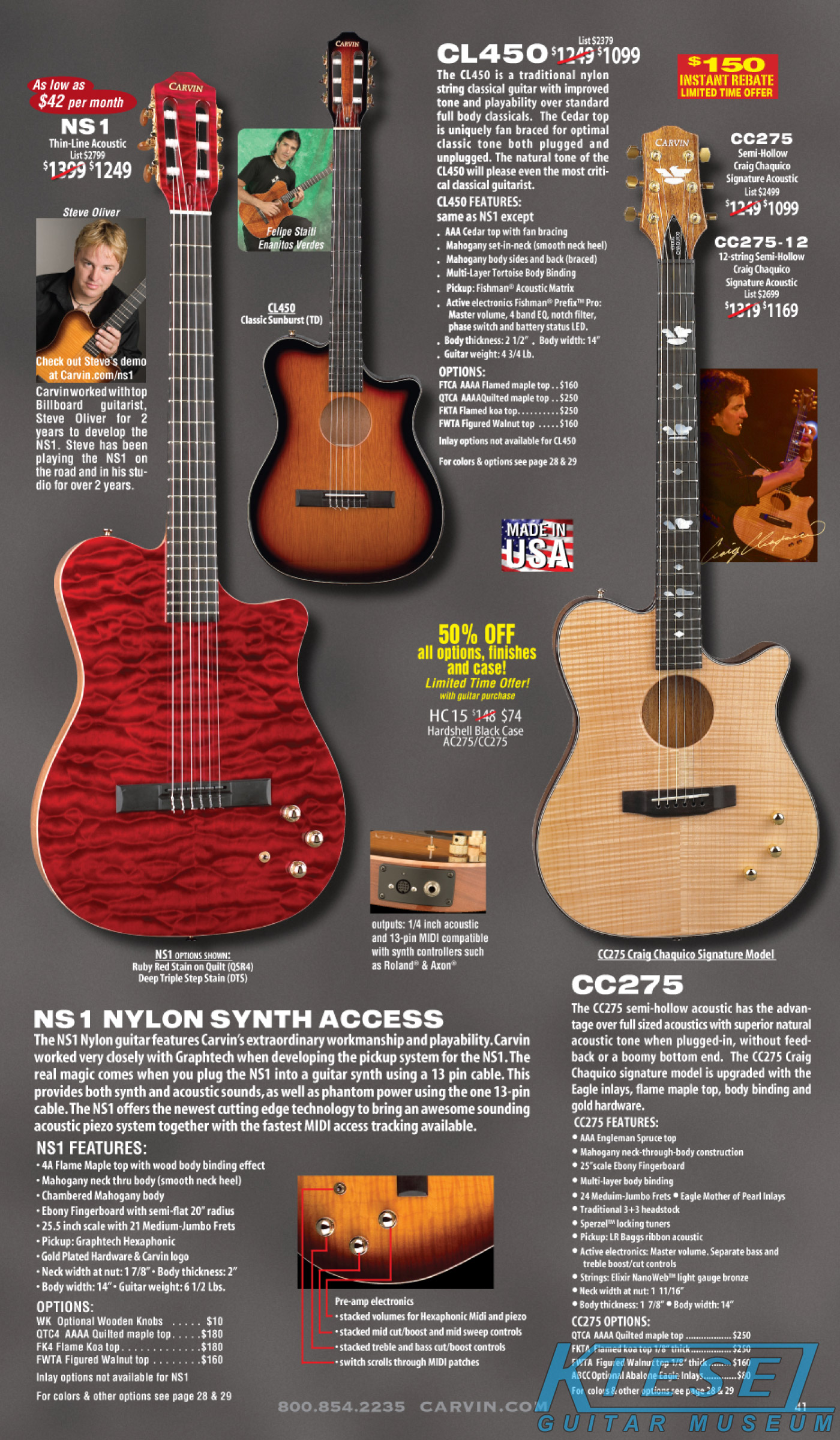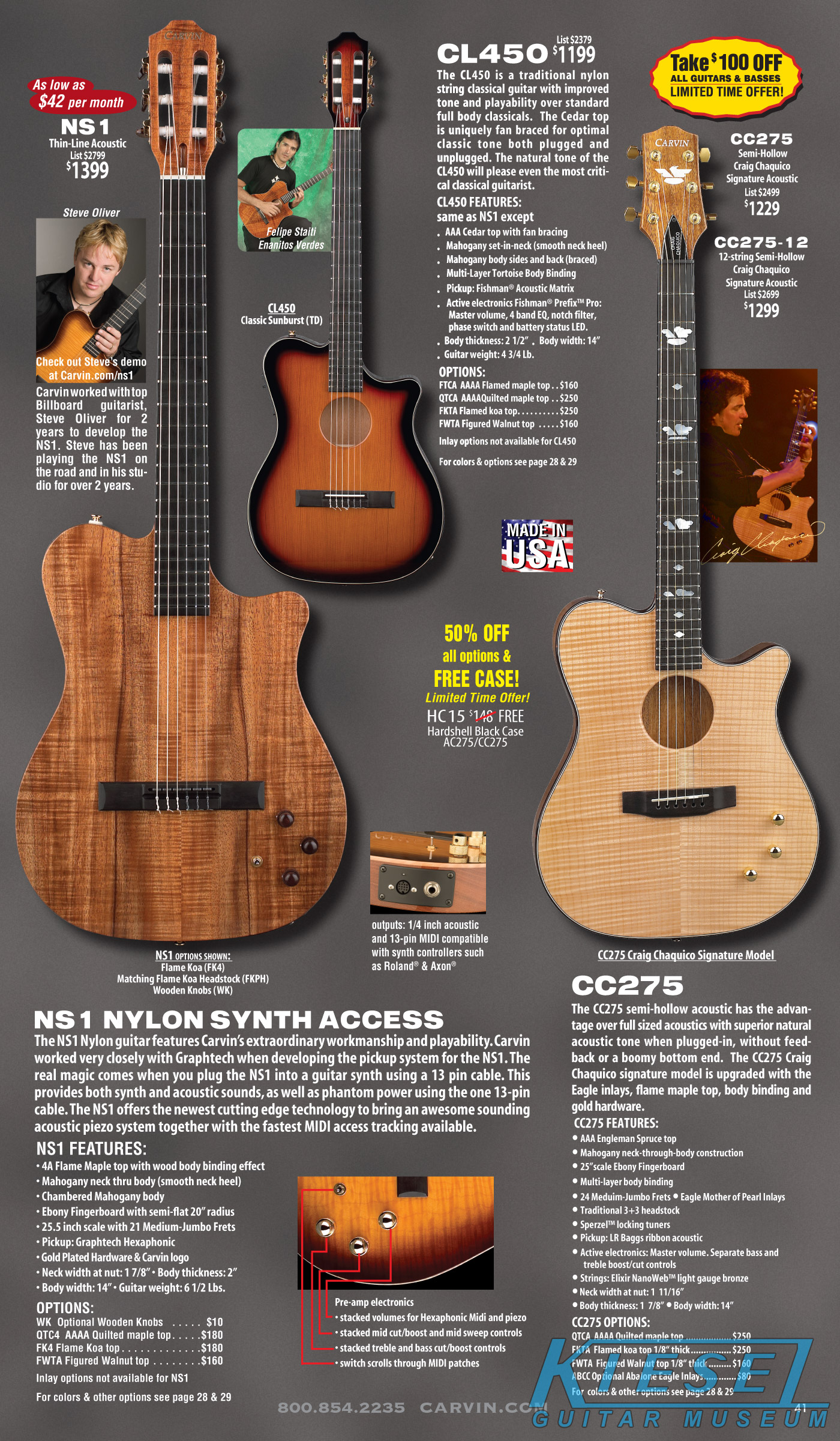 The other acoustic-electric models - the AC175, AC275 and AC375 were unchanged, and not shown in the catalog at all. The Craig Chaquico Signature CC275 shared a page with the nylong string classical CL450 and MIDI Synth NS1, and none of these models were changed for the 2009 model year.