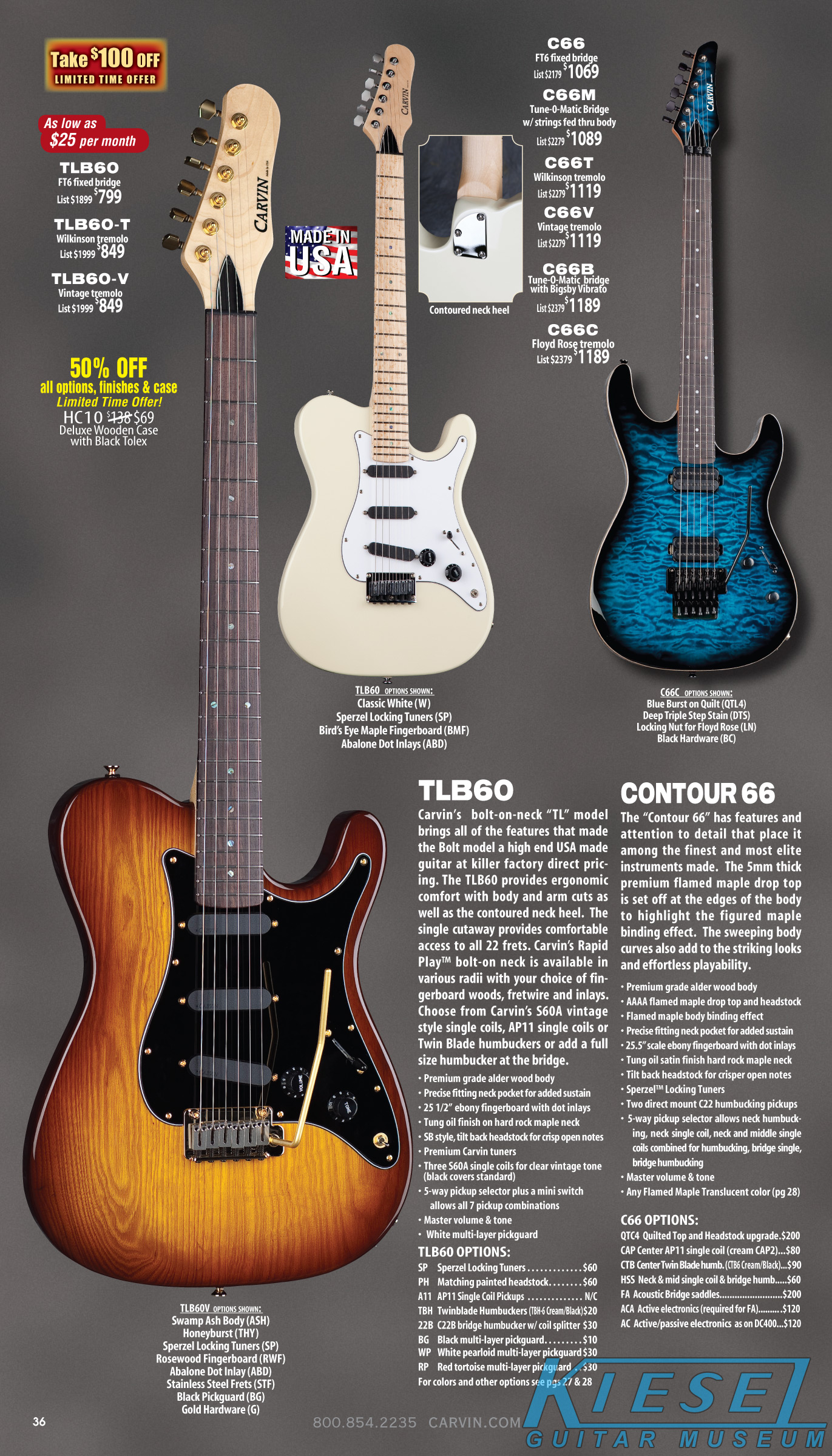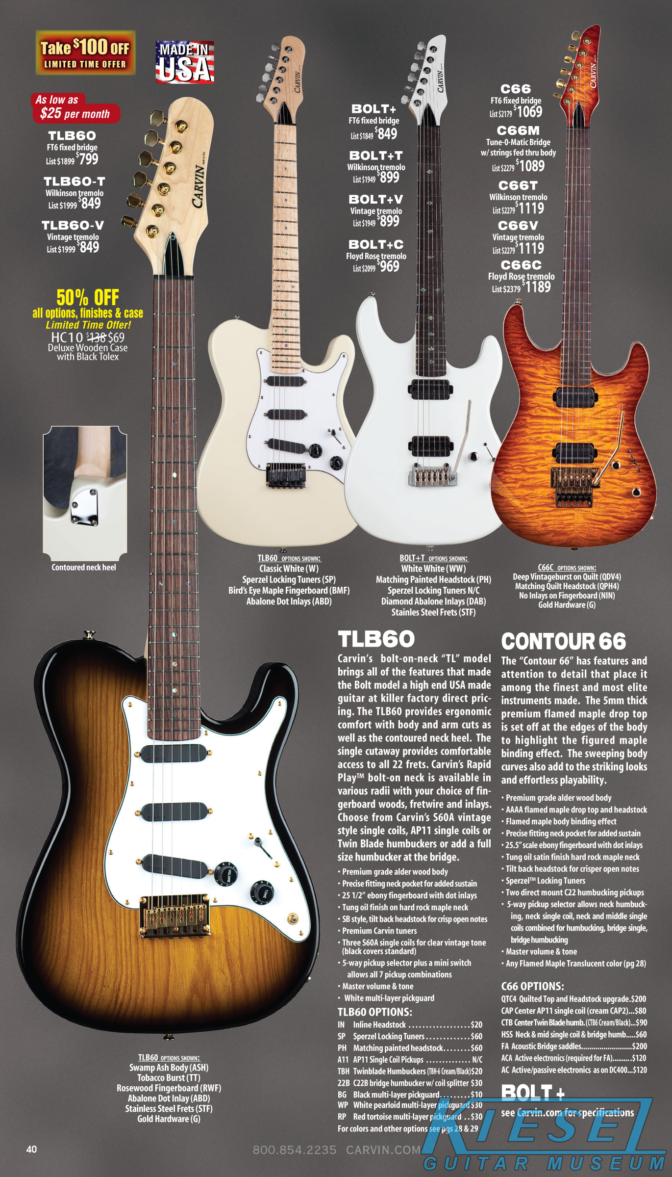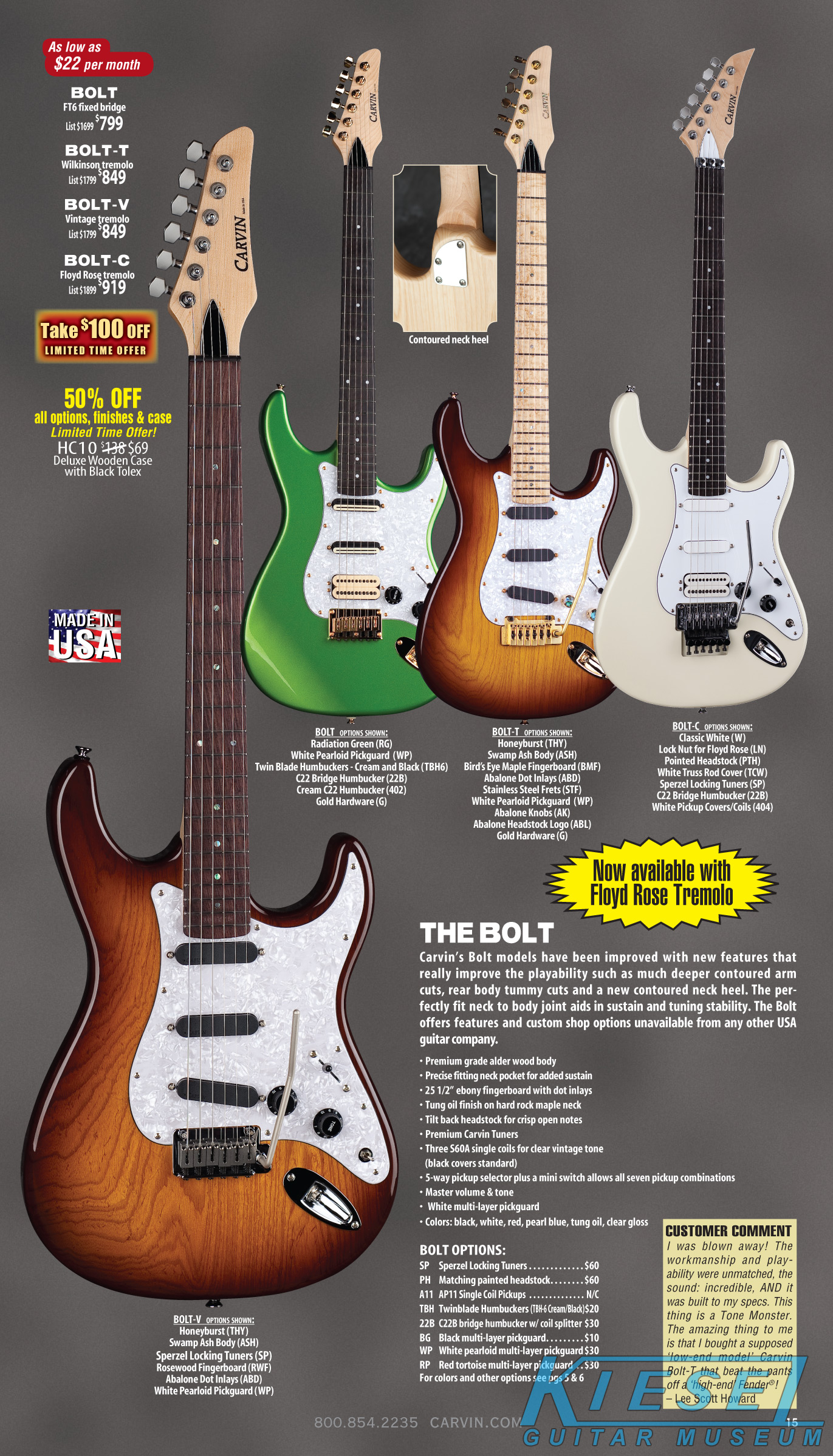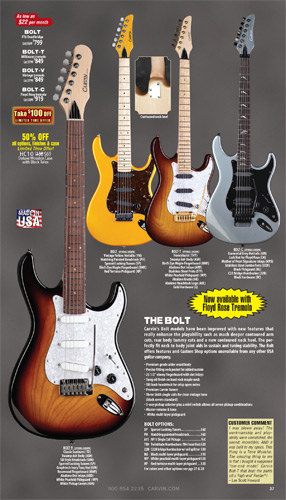 The Bolt enjoyed a resurgence, thanks to the new sculpted neck heel that was introduced in 2010, and the addition of the Floyd Rose tremolo in 2011. Other than new finishes that were introduced, there were no changes to this model. Carvin's other bolt-neck models, the Contour C66, TLB60 and BoltPlus were also unchanged, and the BoltPlus was not shown in any of the catalogs.