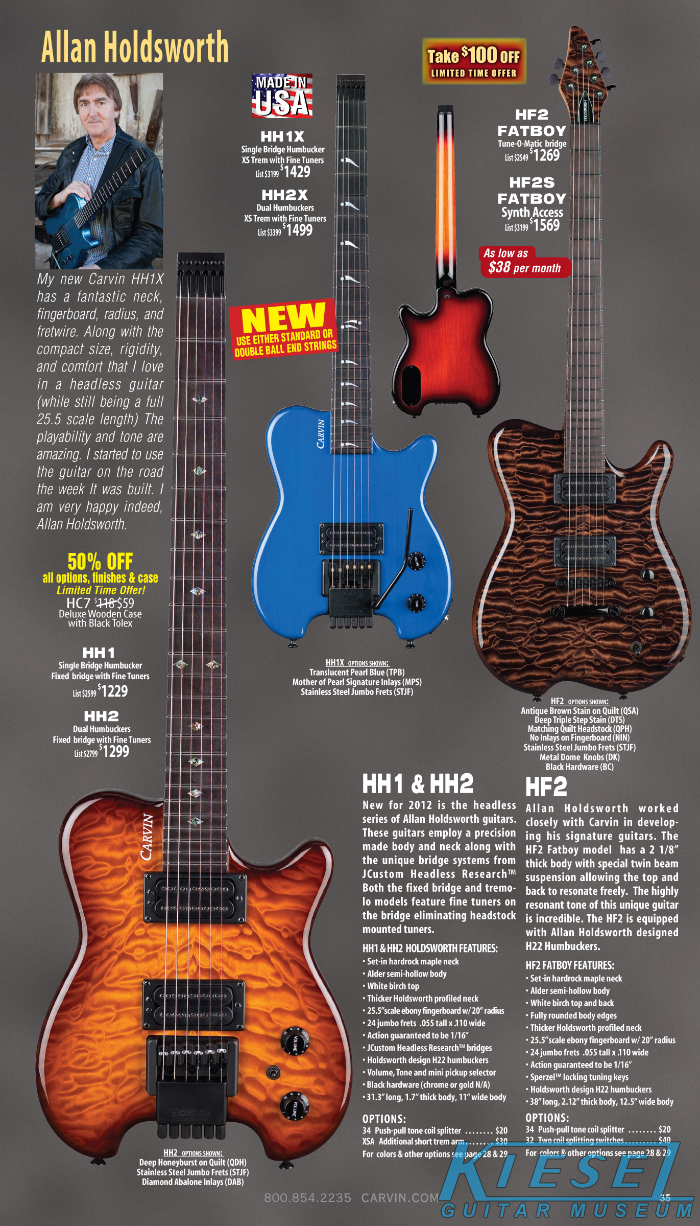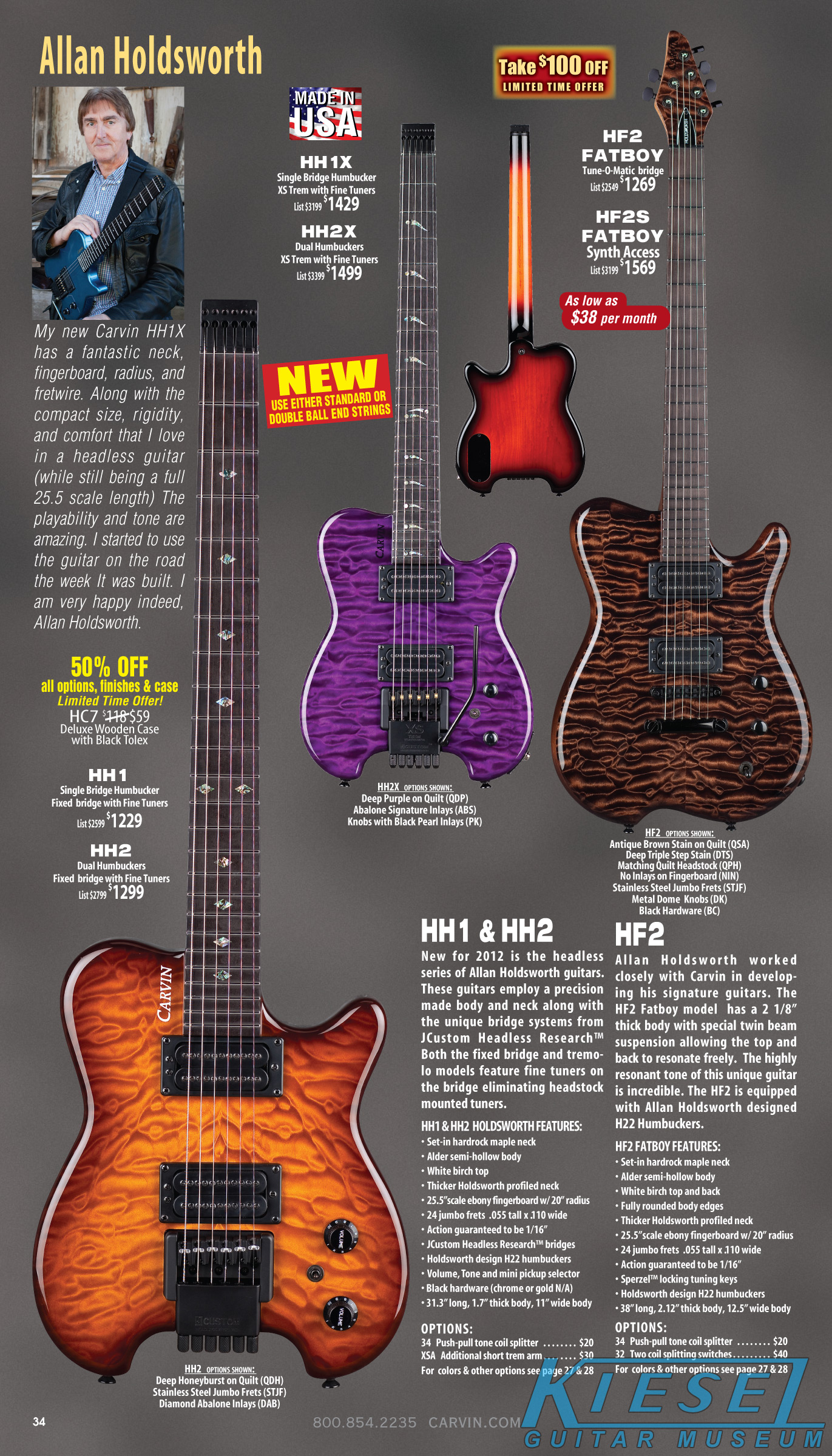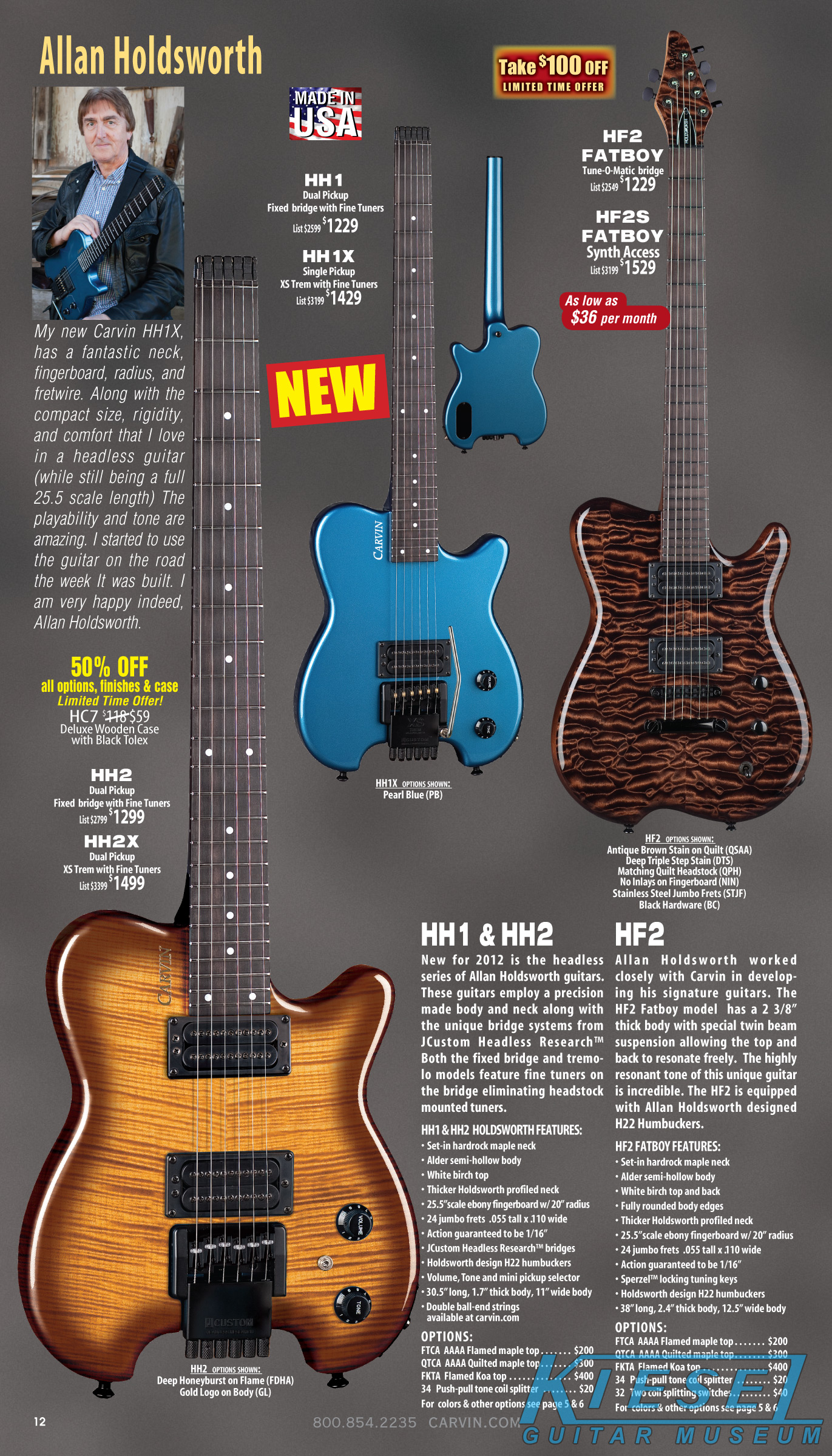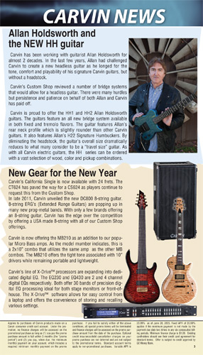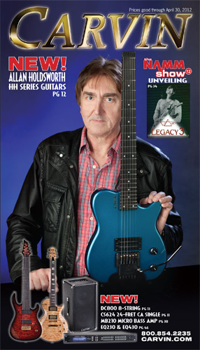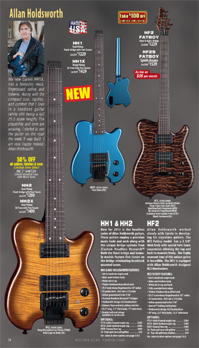 2012 saw the introduction of arguably one of Carvin's more radical and important guitars ever, the Allan Holdsworth Signature HH Series headless. This revolutionary instrument would pave the way for many, many Kiesel models to come, including the Vader, Zeus and Osiris guitar and bass models, all of which would be released over the next few years. The HH1 (single bridge pickup) and HH2 (dual humbuckers) was designed by Mark Kiesel in cooperation with Allan, who had long been a headless guitar fan and player. Both models featured an alder semi=hollow body with a white birch top. Despite its compact size, the HH guitars had a full-sized fingerboard, with 24 frets and a 25.5" scale and 20" radius. The unique bridge was produced by JCustom Headless Research, and required double ball-end strings. A JCustom tremolo, called the XS Trem, was available. A newer version of the tremolo would be offered in 2014, and in 2016, both JCustom bridges would be replaced by the Hipsot/Kiesel Tremolo System, which could use standard strings or double ball-end strings. The HH guitars could be ordered with any of Carvin's exotic woods, finishes, pickups, and logos. The Allan Holdsworth Signature HH guitar is still available from Kiesel Guitars, right here.