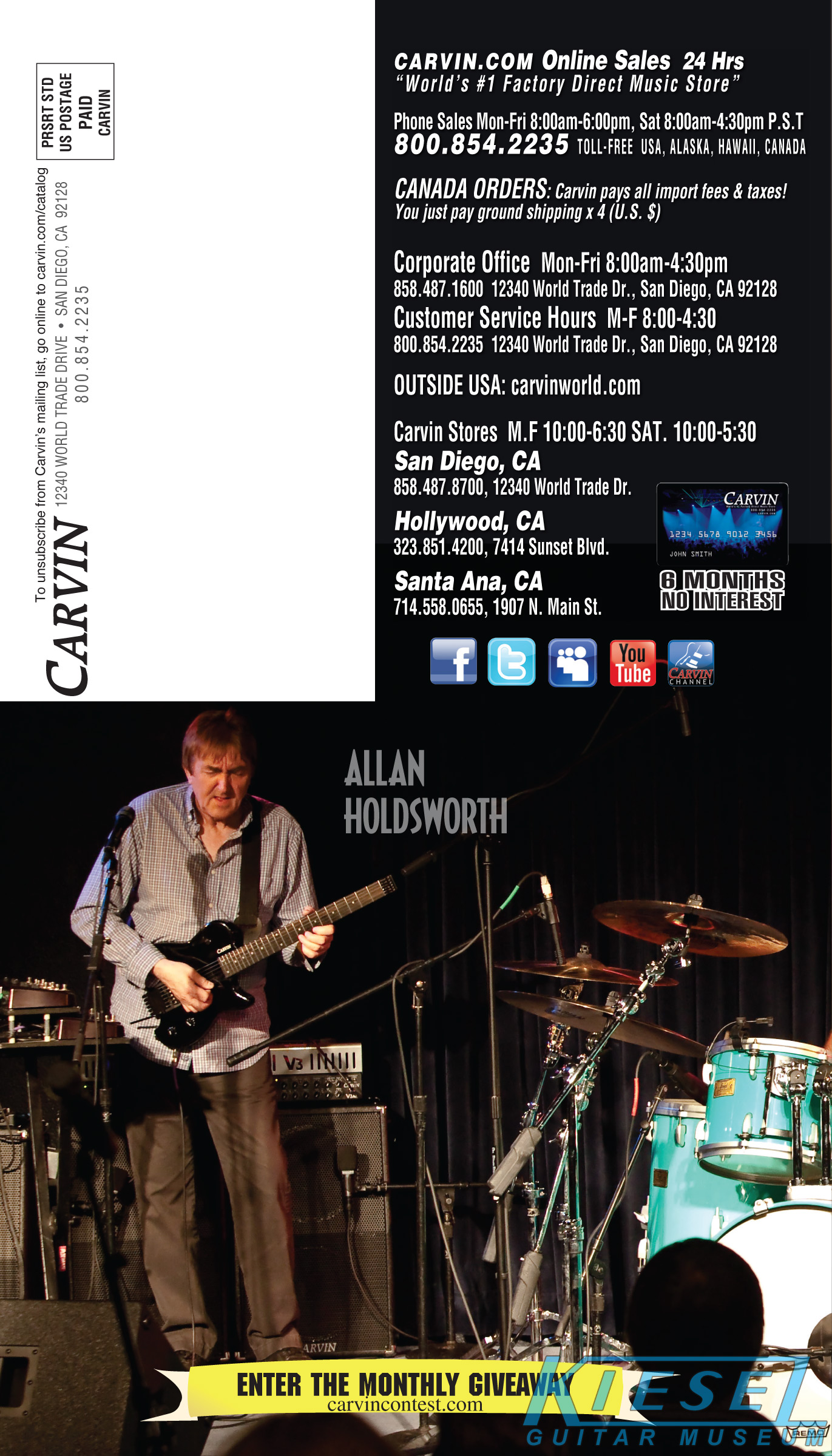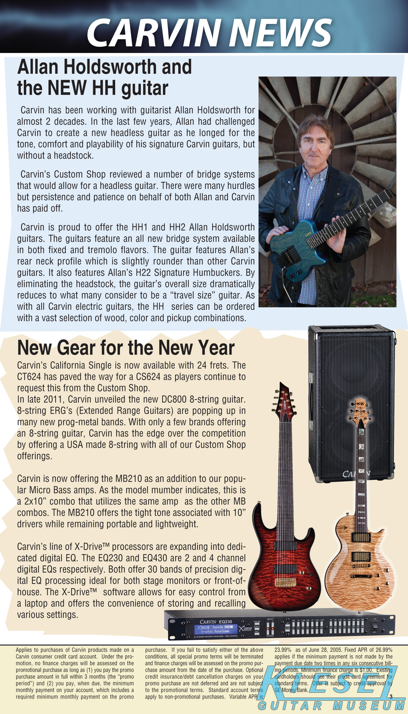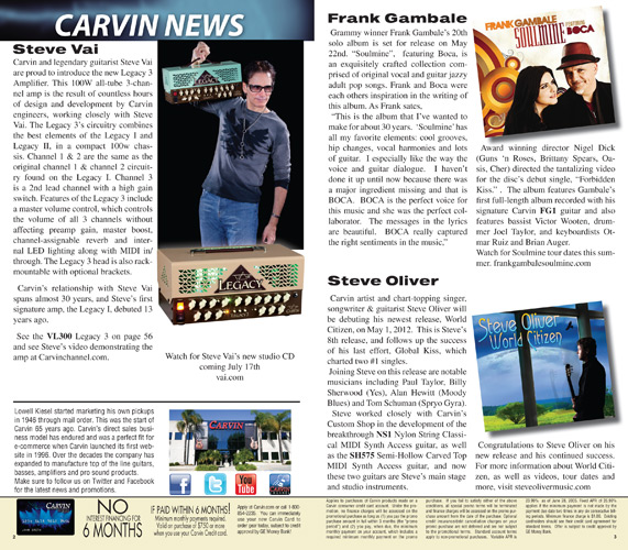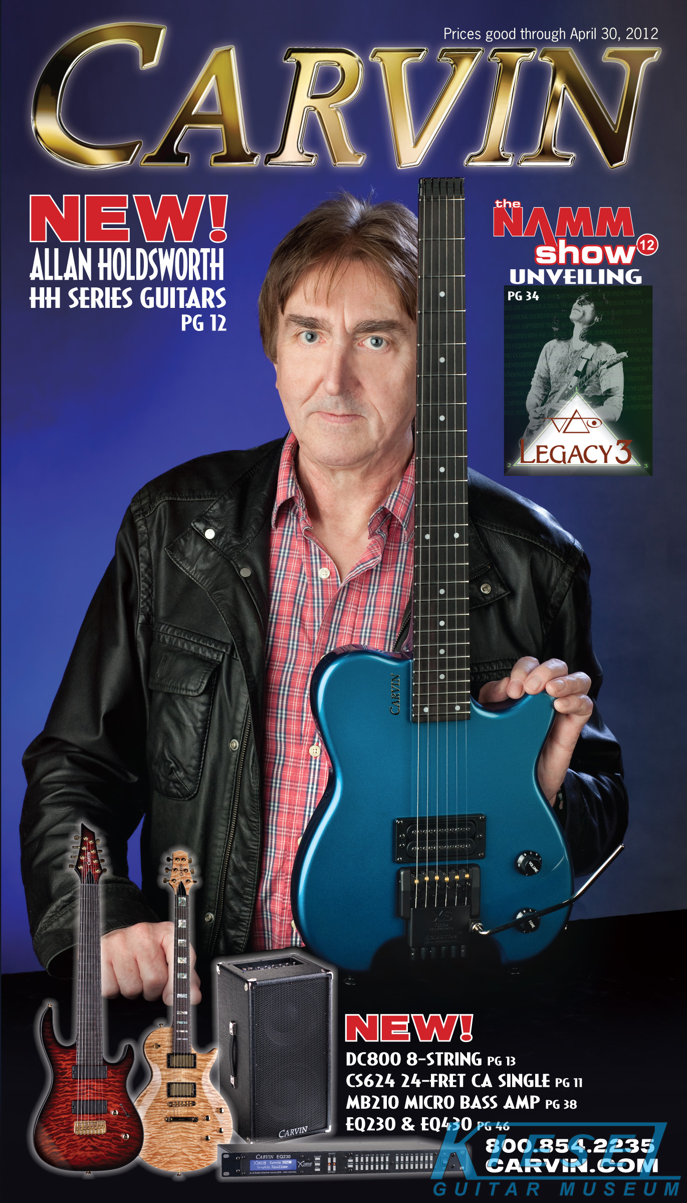 2012 saw the introduction of arguably one of Carvin's more radical and important guitars ever, the Allan Holdsworth Signature HH Series headless. This revolutionary instrument would pave the way for many, many Kiesel models to come, including the Vader, Zeus and Osiris guitar and bass models, all of which would be released over the next few years. The HH1 (single bridge pickup) and HH2 (dual humbuckers) was designed by Mark Kiesel in cooperation with Allan, who had long been a headless guitar fan and player. Both models featured an alder semi=hollow body with a white birch top. Despite its compact size, the HH guitars had a full-sized fingerboard, with 24 frets and a 25.5" scale and 20" radius. The unique bridge was produced by JCustom Headless Research, and required double ball-end strings. A JCustom tremolo, called the XS Trem, was available. A newer version of the tremolo would be offered in 2014, and in 2016, both JCustom bridges would be replaced by the Hipsot/Kiesel Tremolo System, which could use standard strings or double ball-end strings. The HH guitars could be ordered with any of Carvin's exotic woods, finishes, pickups, and logos. The Allan Holdsworth Signature HH guitar is still available from Kiesel Guitars, right here.