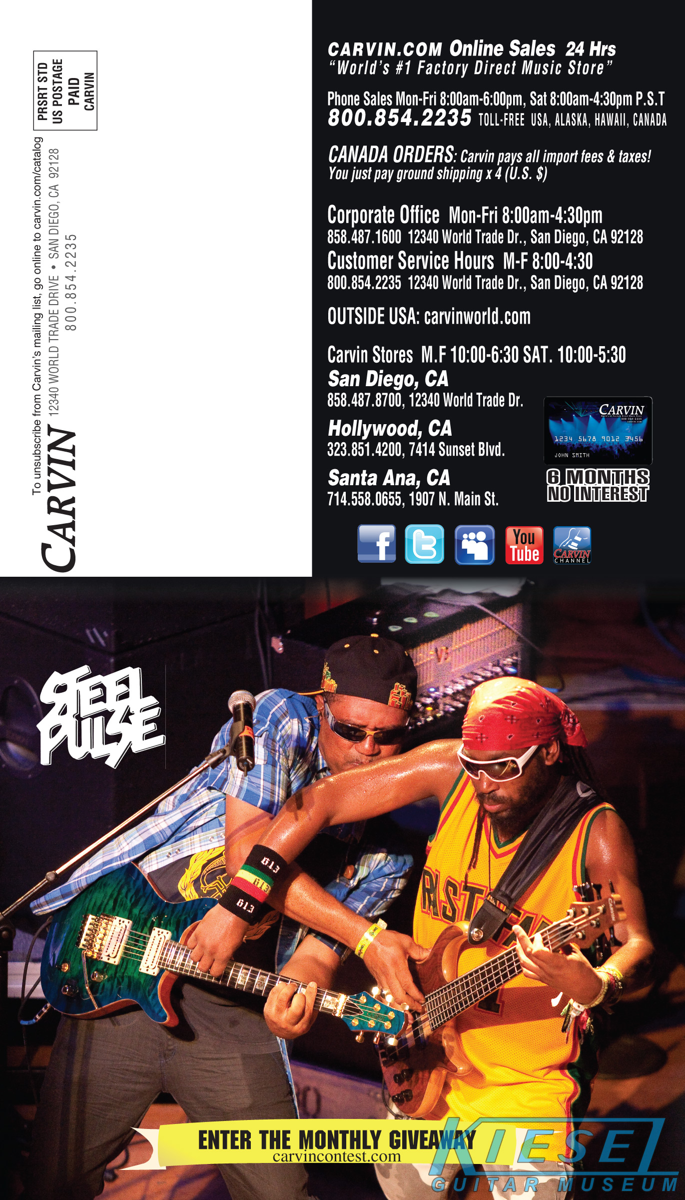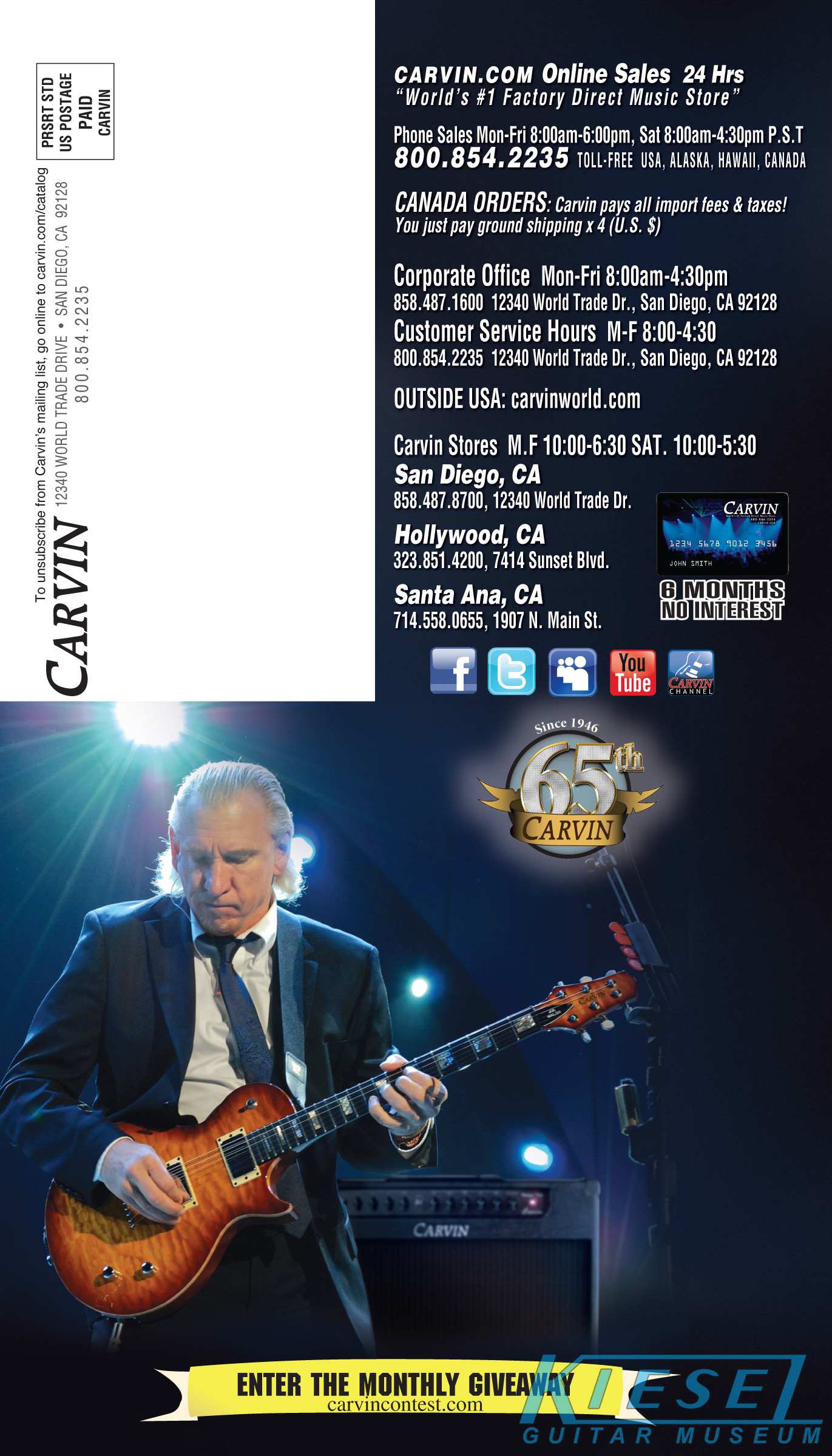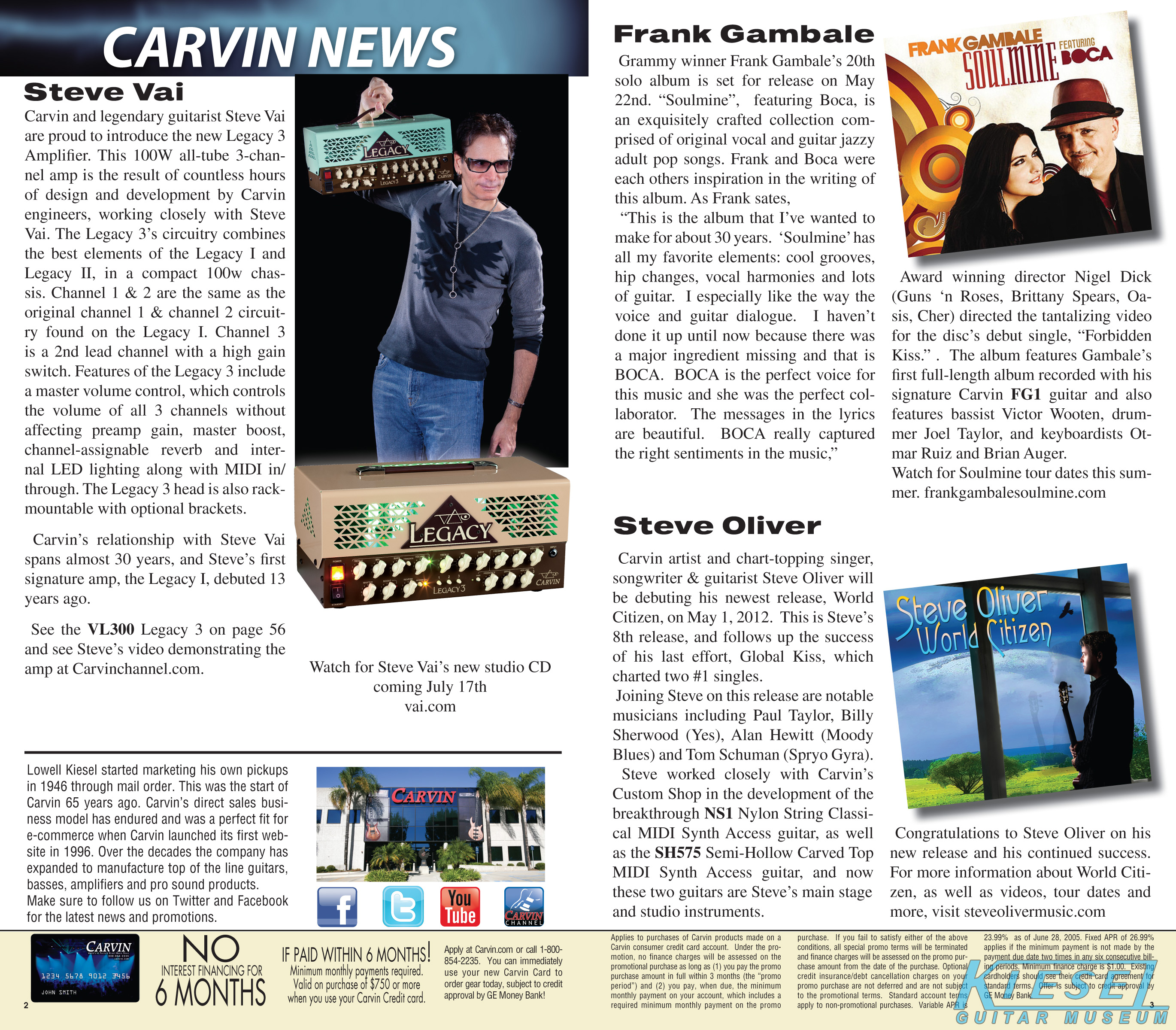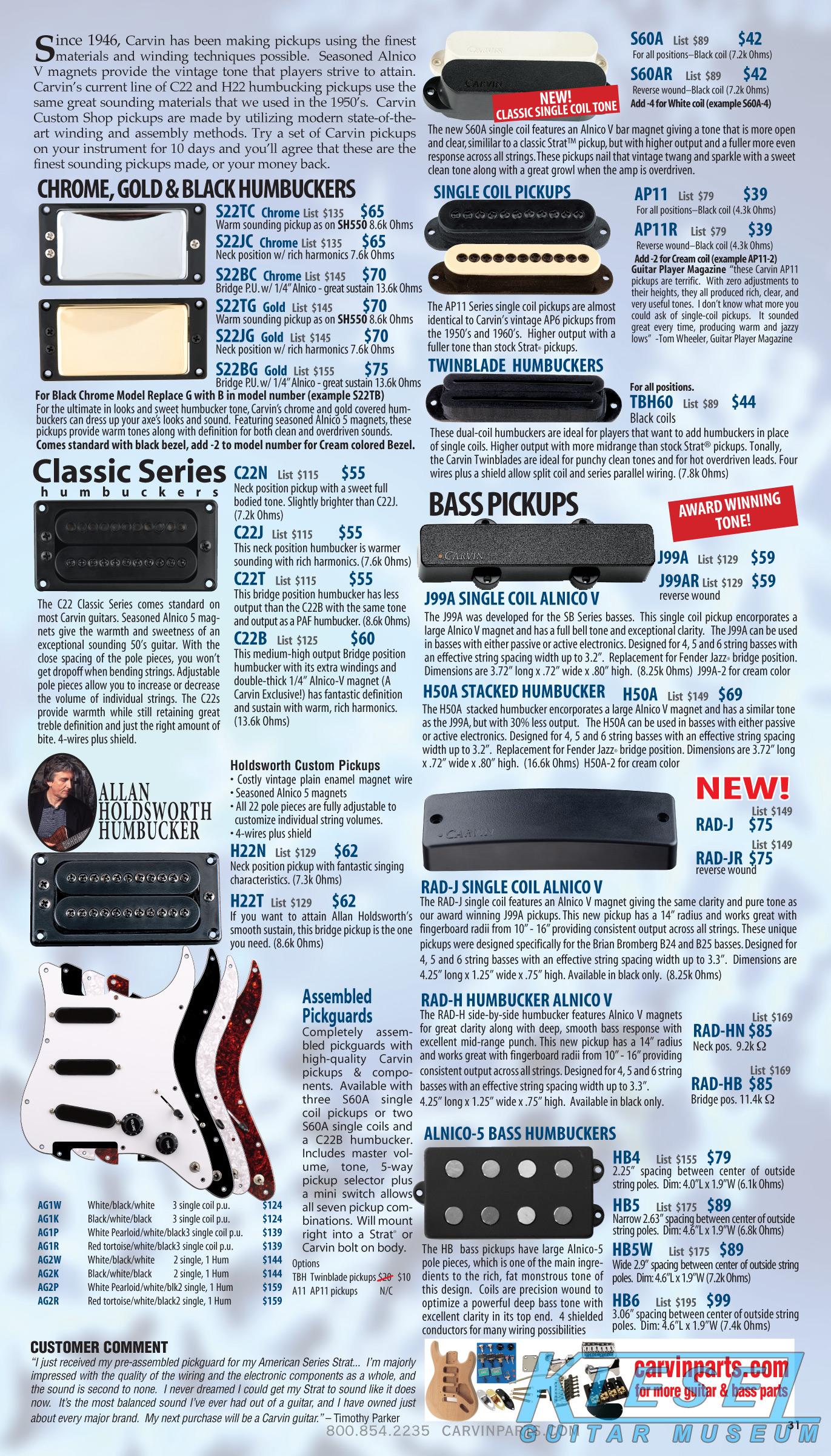 2012 saw the introduction of arguably one of Carvin's more radical and important guitars ever, the Allan Holdsworth Signature HH Series headless. This revolutionary instrument would pave the way for many, many Kiesel models to come, including the Vader, Zeus and Osiris guitar and bass models, all of which would be released over the next few years. The HH1 (single bridge pickup) and HH2 (dual humbuckers) was designed by Mark Kiesel in cooperation with Allan, who had long been a headless guitar fan and player. Both models featured an alder semi=hollow body with a white birch top. Despite its compact size, the HH guitars had a full-sized fingerboard, with 24 frets and a 25.5" scale and 20" radius. The unique bridge was produced by JCustom Headless Research, and required double ball-end strings. A JCustom tremolo, called the XS Trem, was available. A newer version of the tremolo would be offered in 2014, and in 2016, both JCustom bridges would be replaced by the Hipsot/Kiesel Tremolo System, which could use standard strings or double ball-end strings. The HH guitars could be ordered with any of Carvin's exotic woods, finishes, pickups, and logos. The Allan Holdsworth Signature HH guitar is still available from Kiesel Guitars, right here.