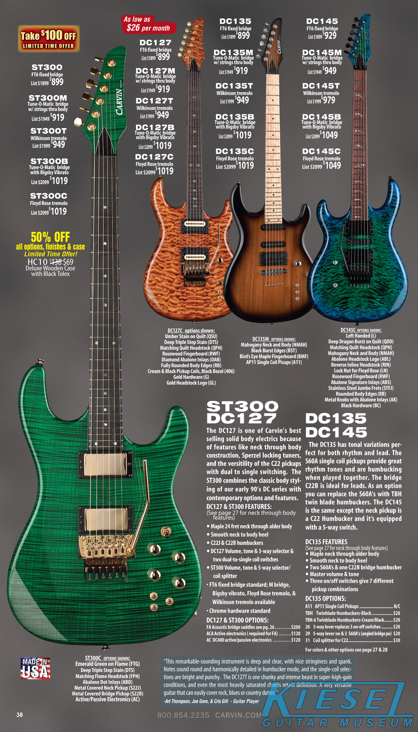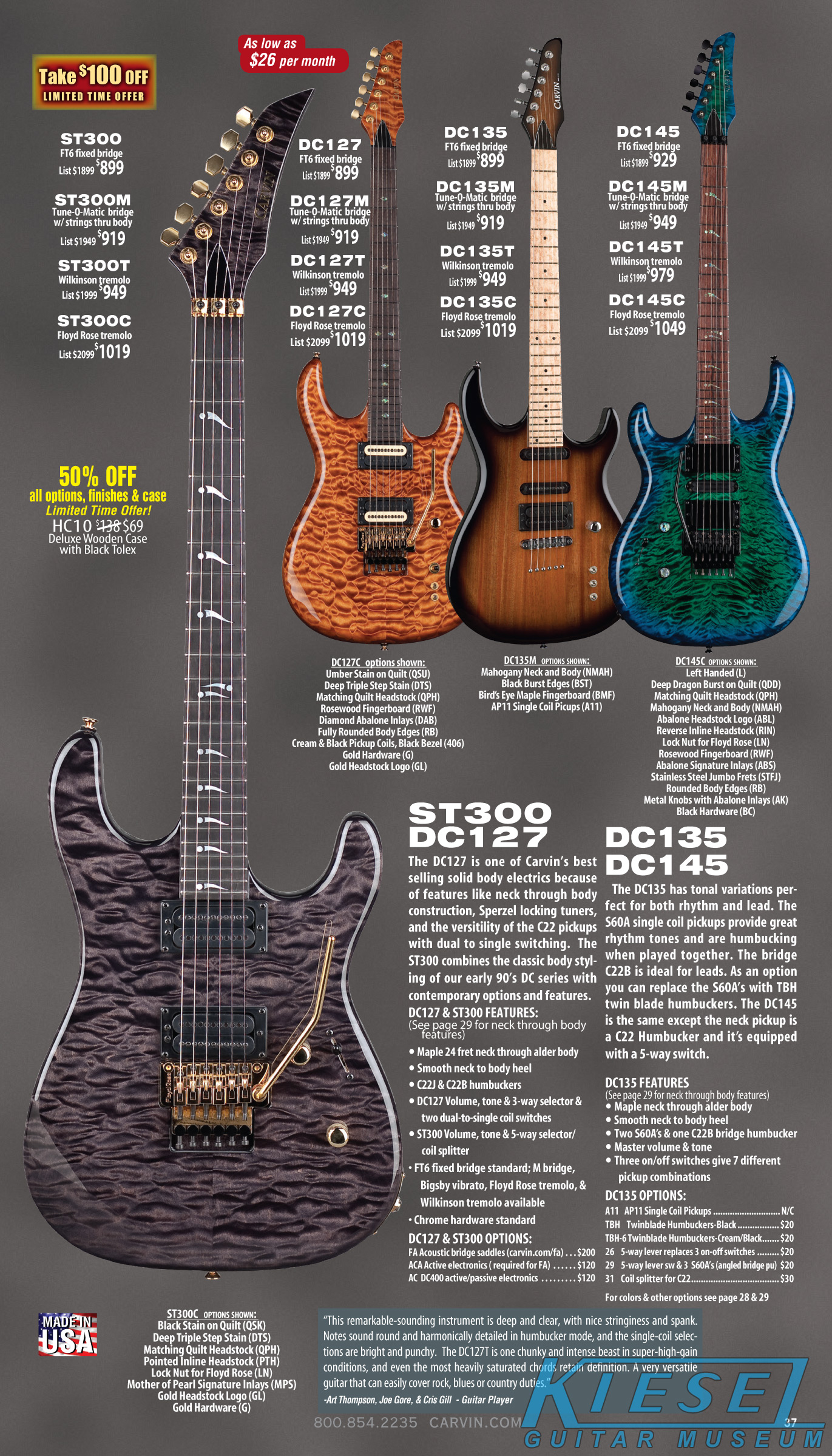 hardtail bridge standard, and could be optioned with Carvin's M Bridge, a Wilkinson tremolo or an original Floyd Rose. While similar in