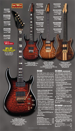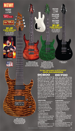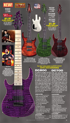 appearance, Carvin's debut 8-string model, the DC800, sported another first for Carvin: a 27" scale extended range fingerboard. It had a semi-flat 20" fingerboard radius, and