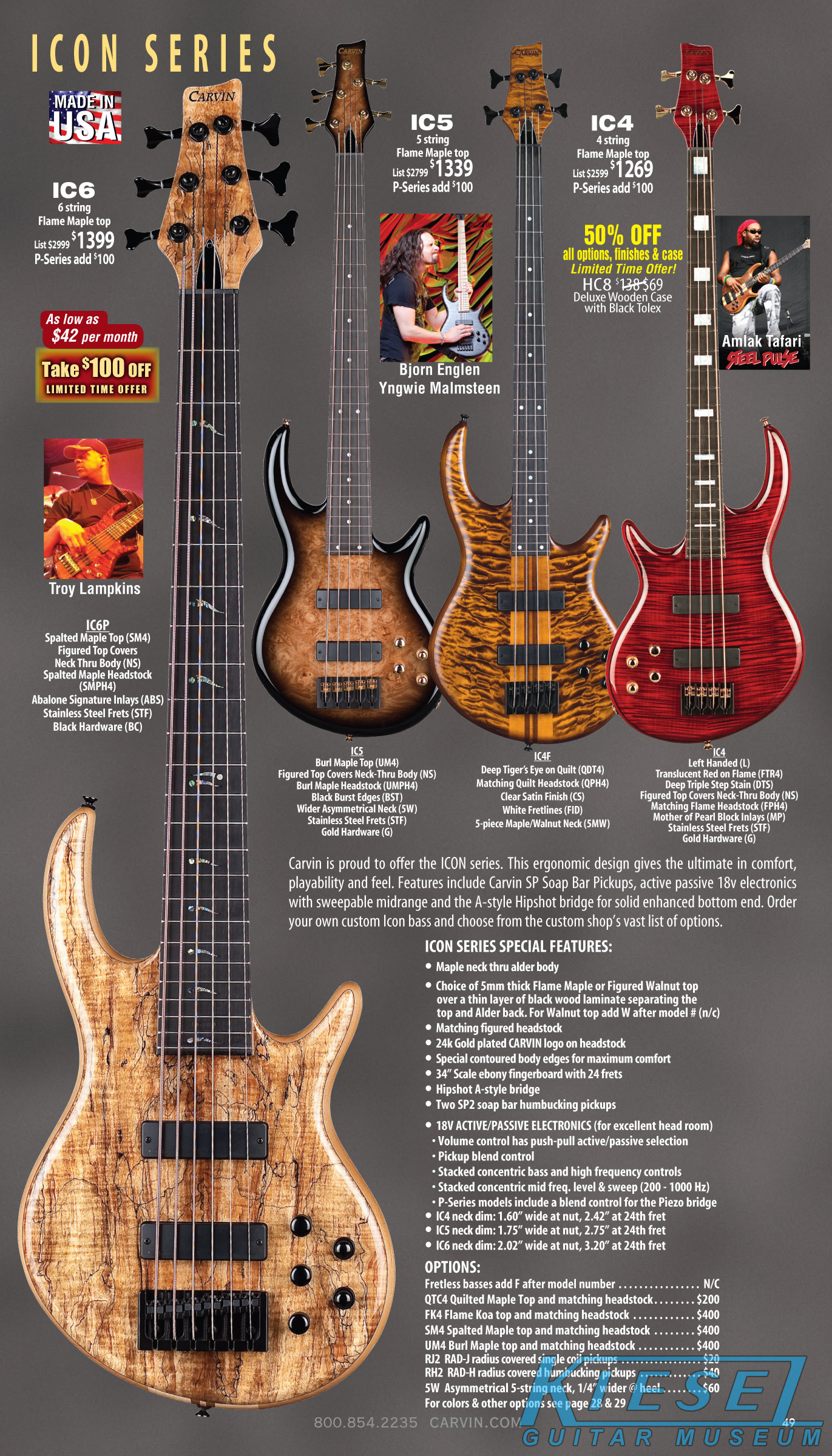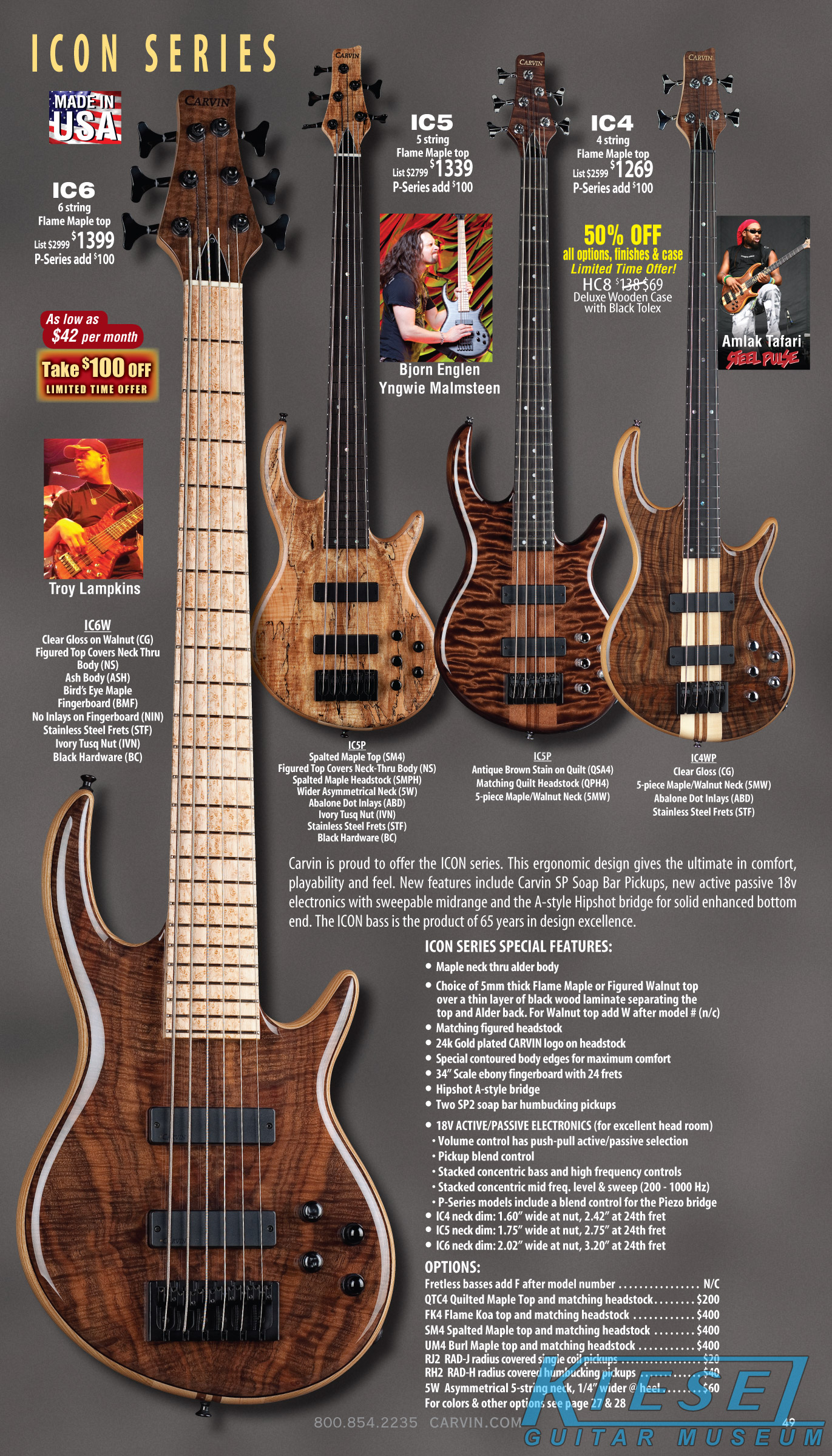and a flamed mape fingerboard, thinner neck profile, and 80s-style pointed angled headstock and large Carvin logo. Active/passive