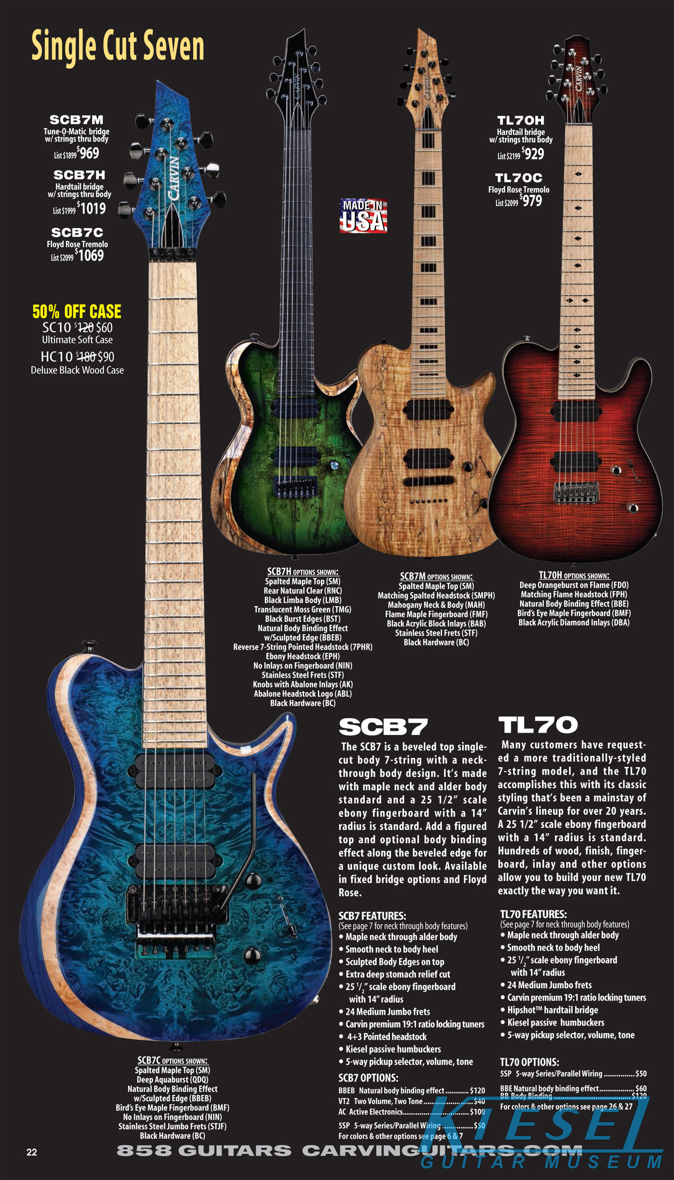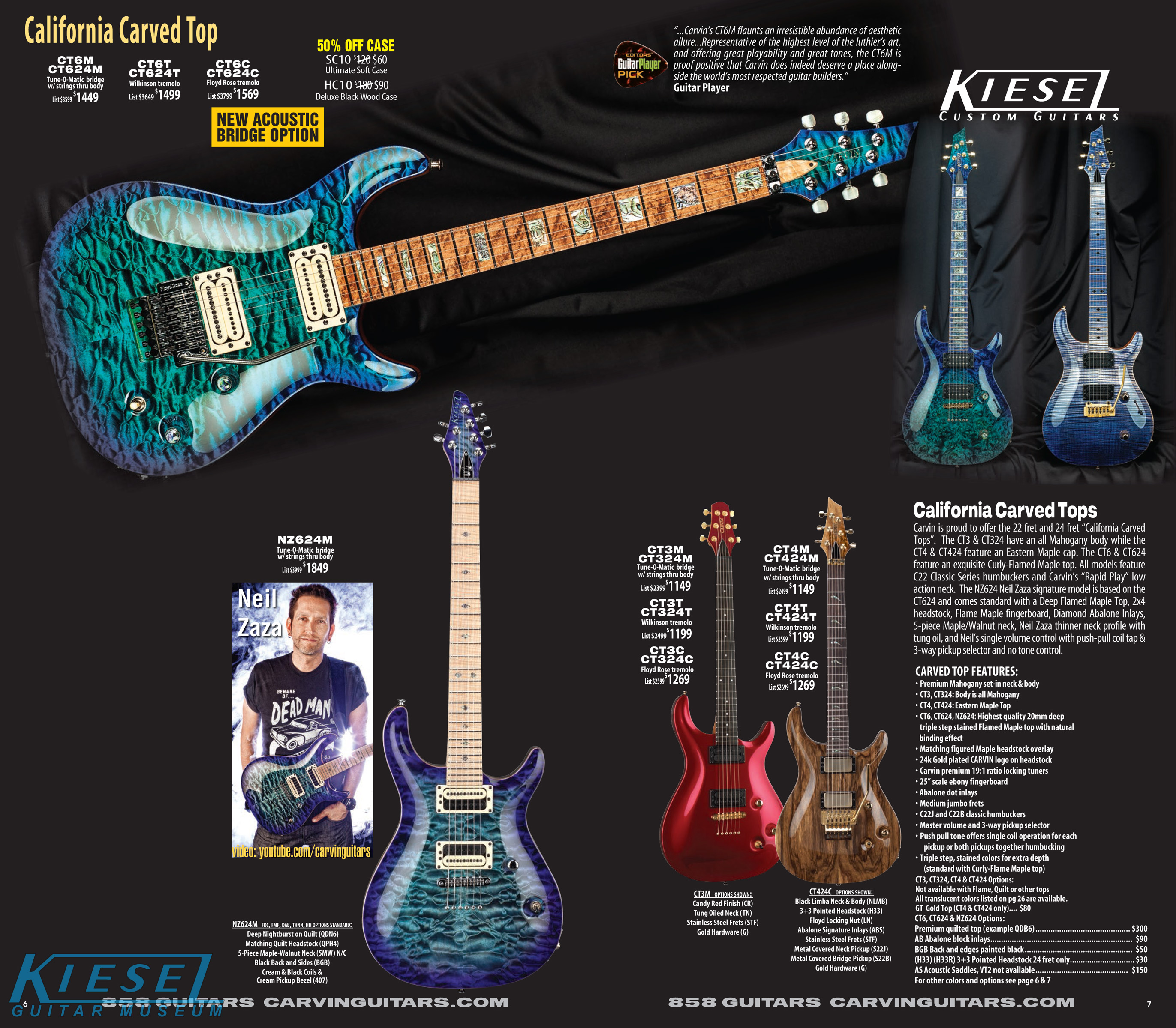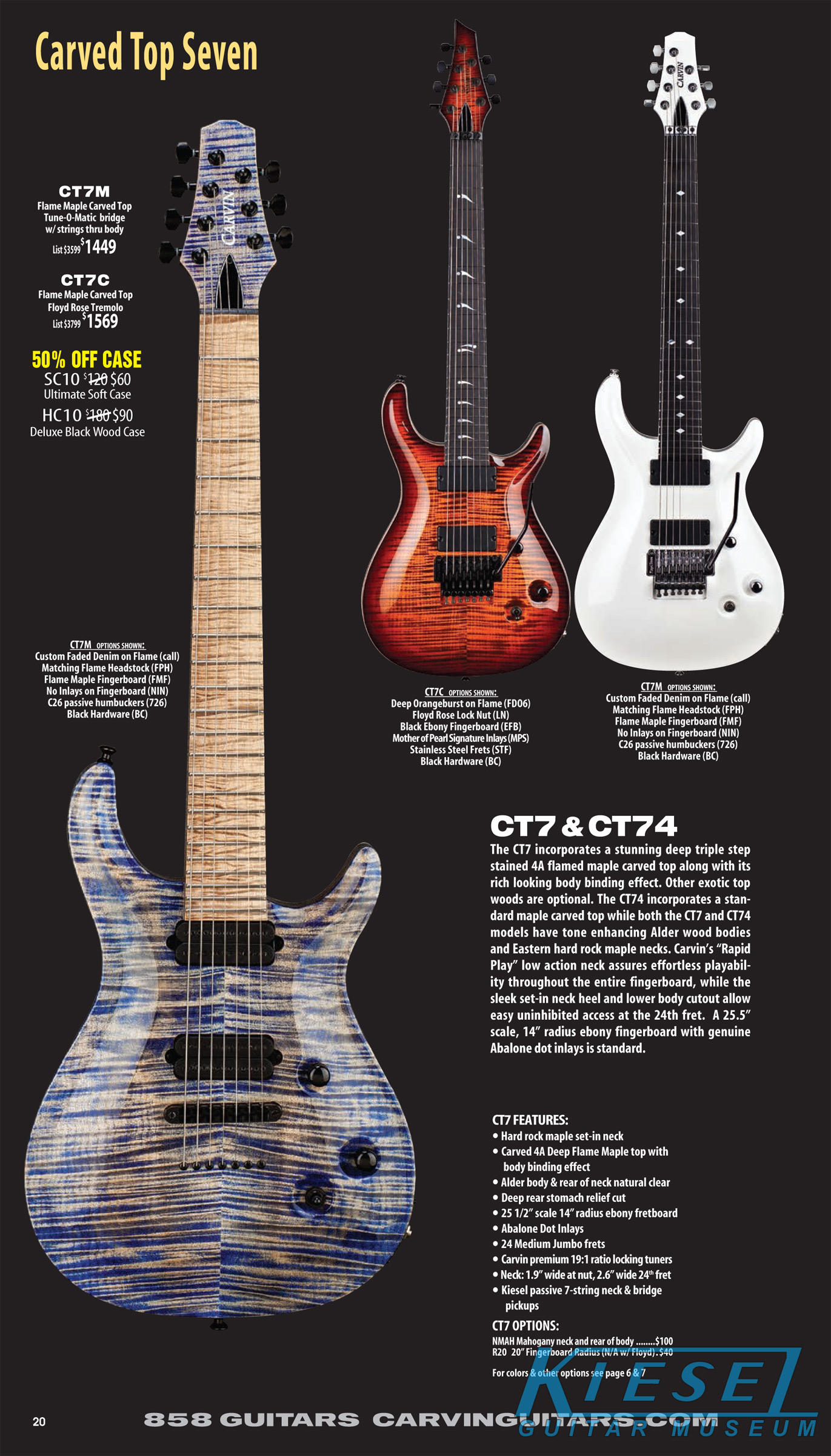 Because of all the activity involved in spinning off Kiesel Guitars into a separate entity, there weren't many changes in the actual instrument lineup. The 22-fret Carved Top CT6, CT4, CT3, and 24-fret CT624, CT424 and CT324 were basically unchanged, although a new acoustic bridge option was offered. This would be the last year of the "4" series models, as the "3" series could easily be optioned as a "4" by adding a plain maple top wood. The signature edition Neil Zaza NZ624 was also still offered. Also available was the CT7 and CT74 7-string carved top models. Like their 6-string counterparts, the CT7 was standard with a flamed maple top, and the CT74 was standard with a plain maple top. The CT7 Series would be discontinued in 2019. The 6-string carved top models are still availble to order from Kiesel Guitars, right here.
