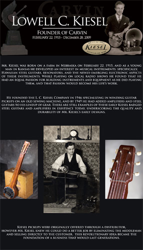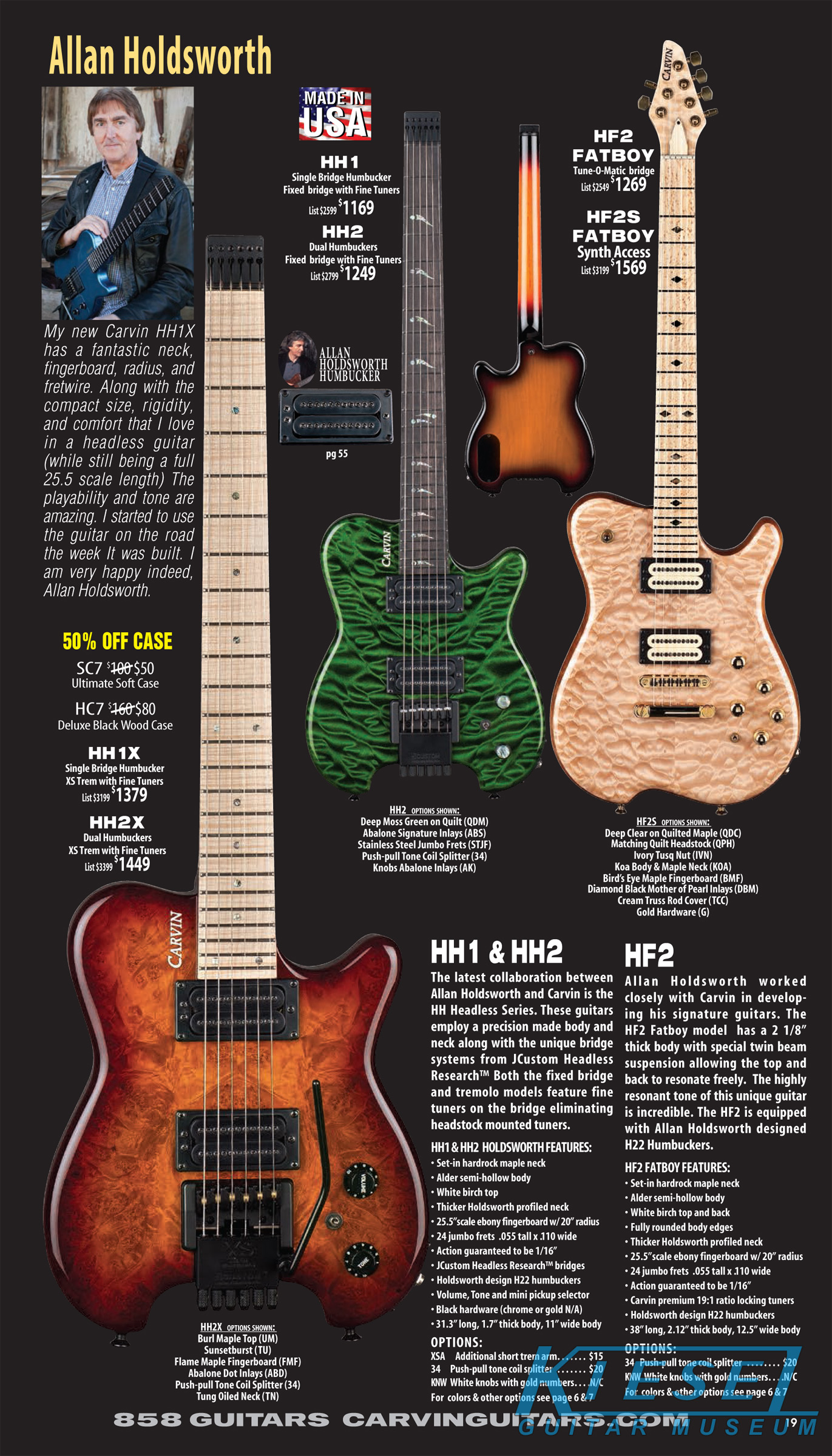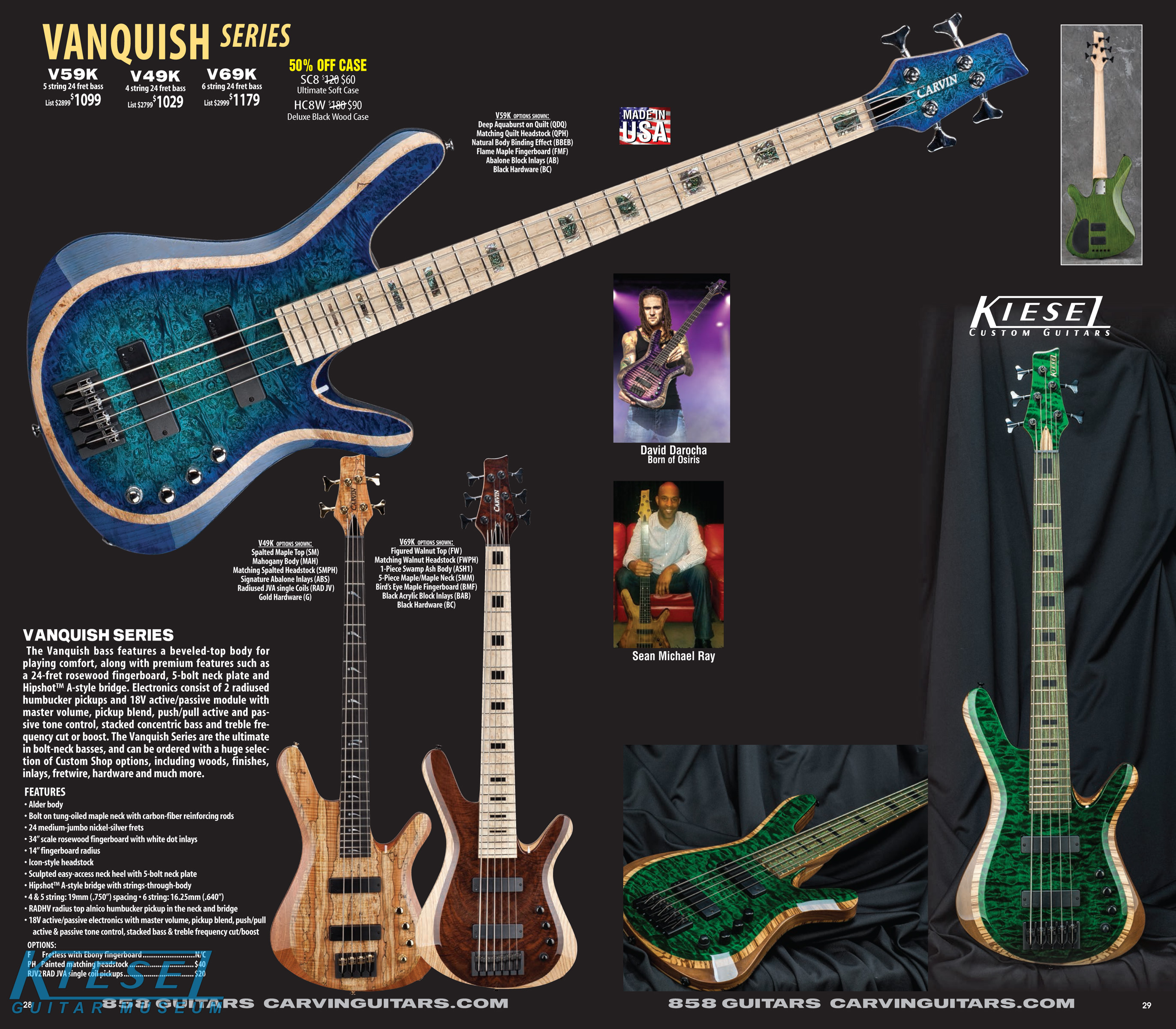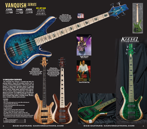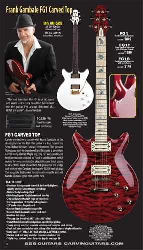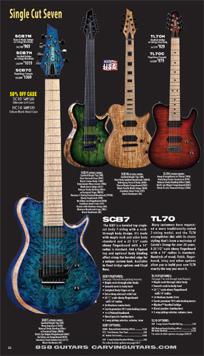 Because of all the activity involved in spinning off Kiesel Guitars into a separate entity, there weren't many changes in the actual instrument lineup. The 22-fret Carved Top CT6, CT4, CT3, and 24-fret CT624, CT424 and CT324 were basically unchanged, although a new acoustic bridge option was offered. This would be the last year of the "4" series models, as the "3" series could easily be optioned as a "4" by adding a plain maple top wood. The signature edition Neil Zaza NZ624 was also still offered. Also available was the CT7 and CT74 7-string carved top models. Like their 6-string counterparts, the CT7 was standard with a flamed maple top, and the CT74 was standard with a plain maple top. The CT7 Series would be discontinued in 2019. The 6-string carved top models are still availble to order from Kiesel Guitars, right here.