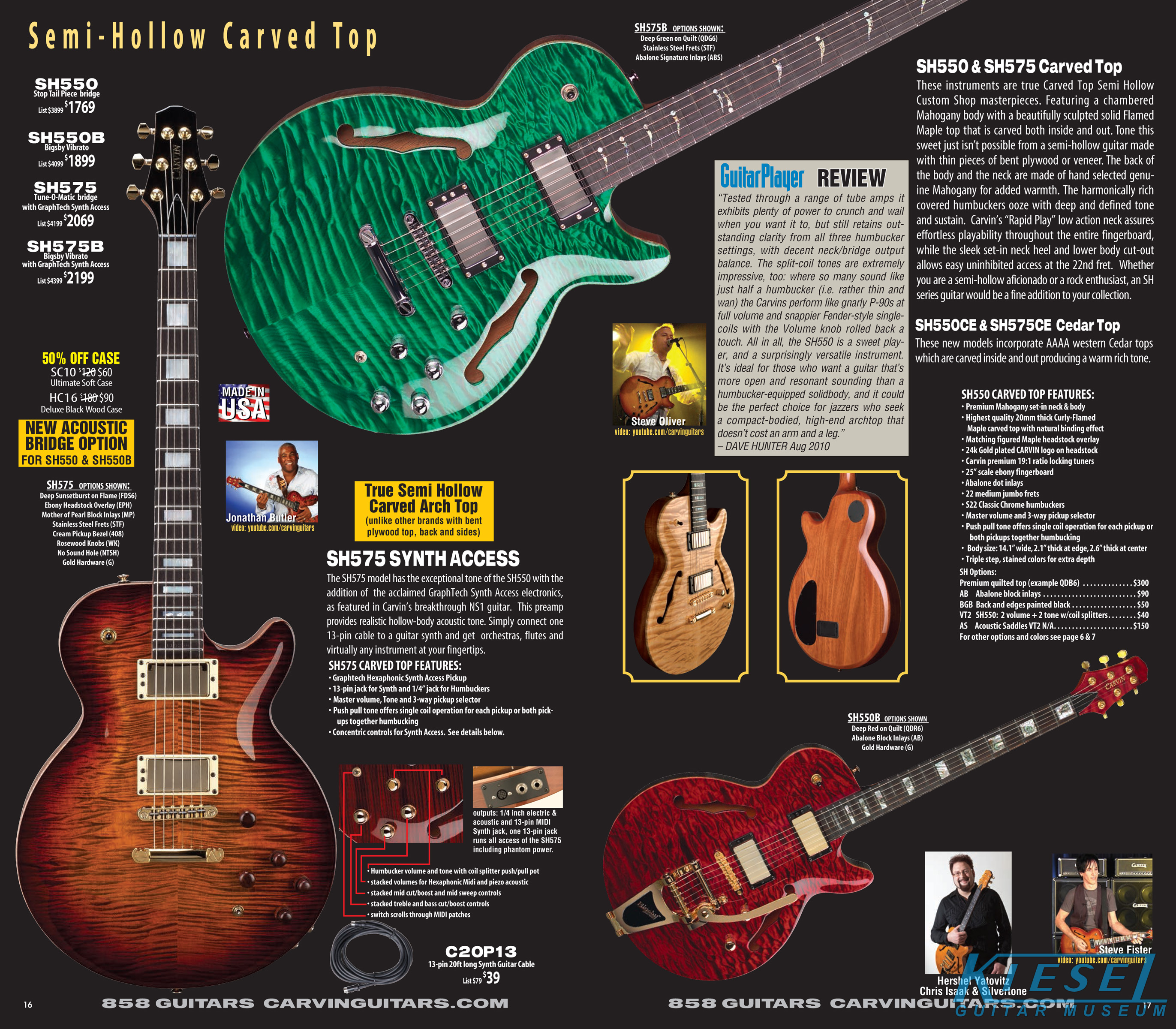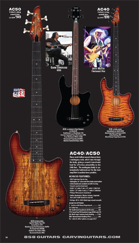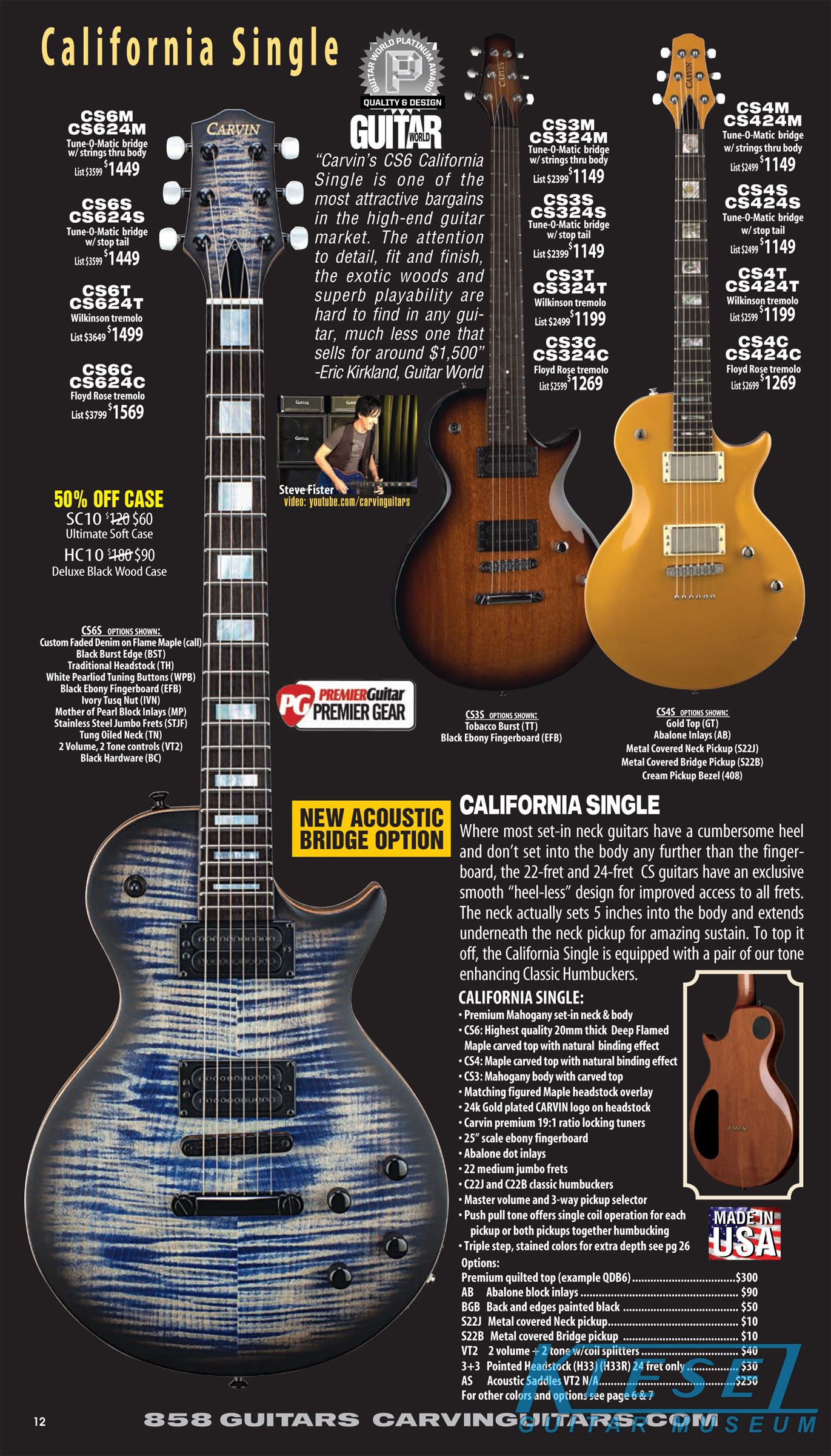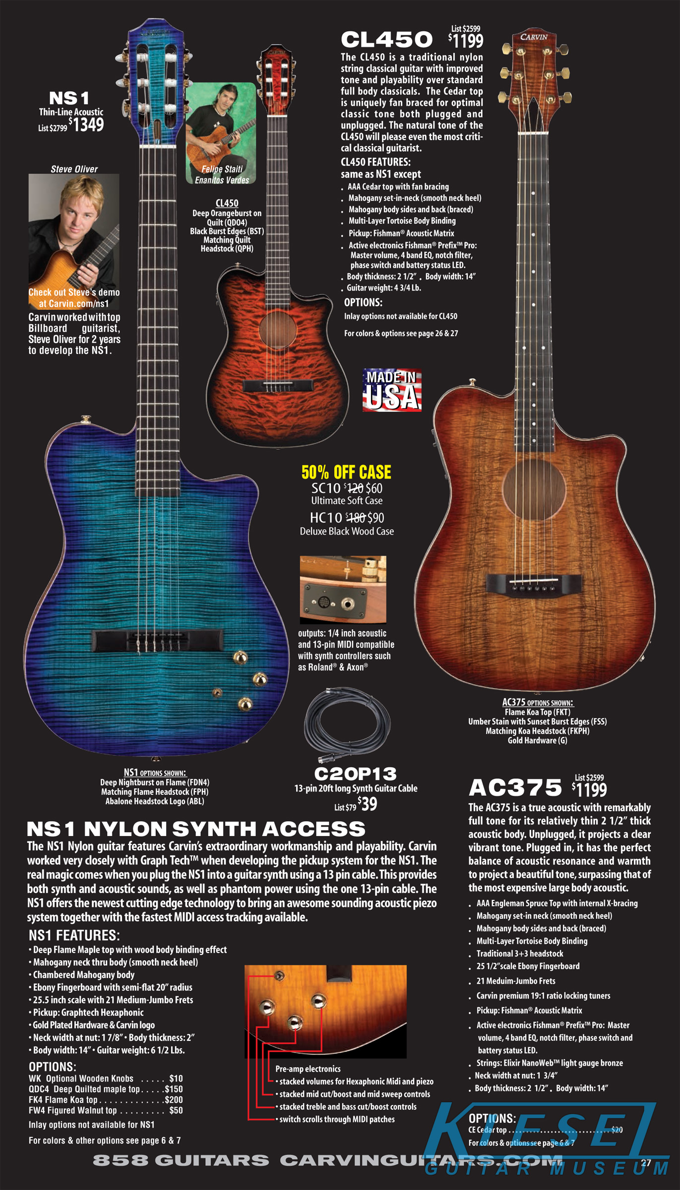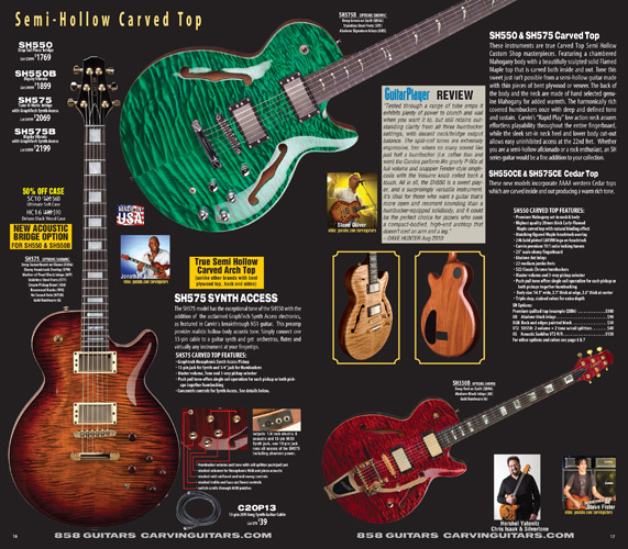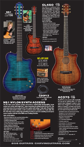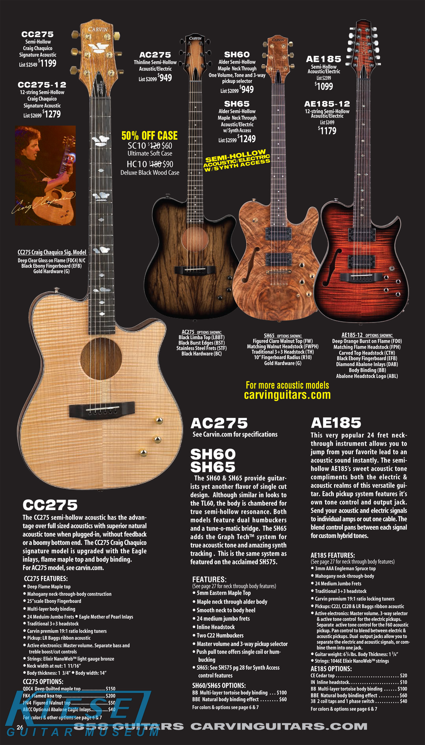 The AC275 and Craig Chaquico Signature CC275 were unchanged, other the addition of new finishes and woods that all models had. The 12-string versions of both were also still offered. The AC versions would be discontinued at the end of 2016, but the Craig Chaquico models continue to be available to this day, right here. Though not shown in the catalog, the AC175 was still available, but it would also be discontinued in 2016.