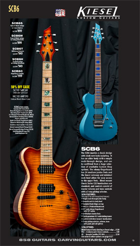 The Bevel-top SCB6 and SCB7, introduced at the end of 2013, were still going strong. The unique body shape lent itself to all sorts of exotic builds, utilizing Kiesel's ever-expanding range of exotic woods and finishes. Along with the Vader Series, the SCB Series clearly showed the direction the new Kiesel Guitars would be heading in. The SCB6 and SCB7 are still available to order, here.
